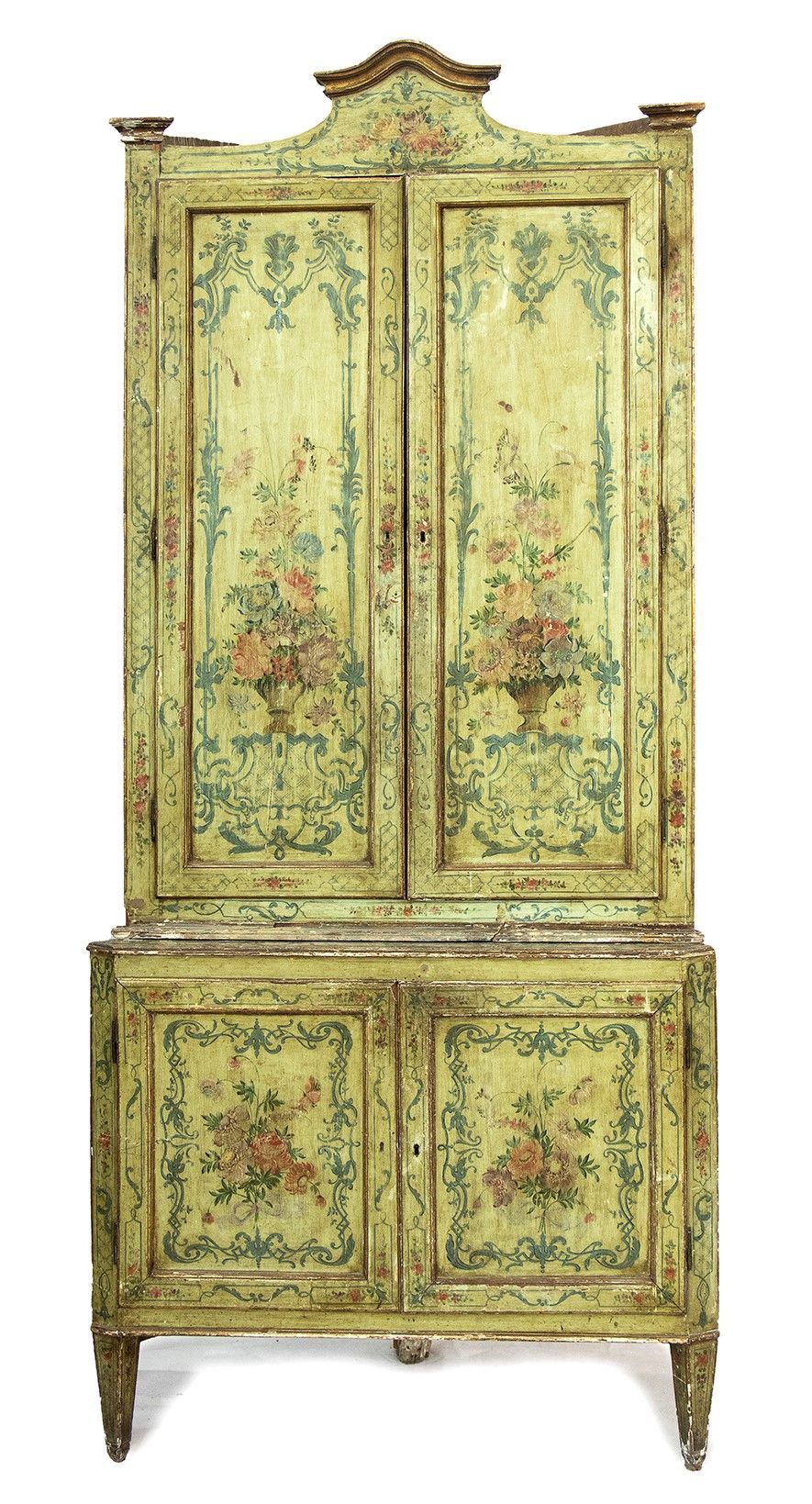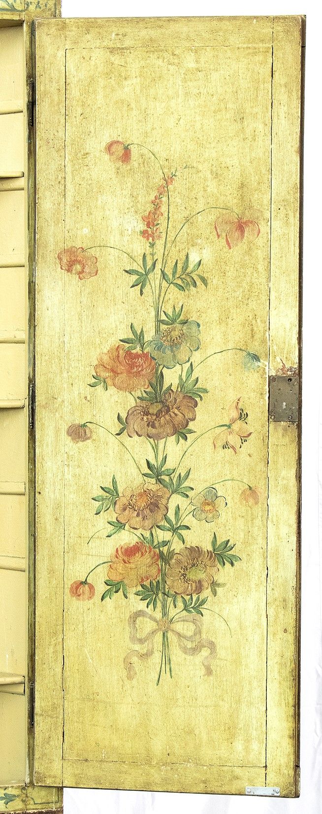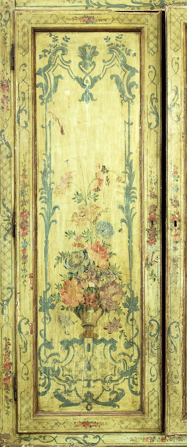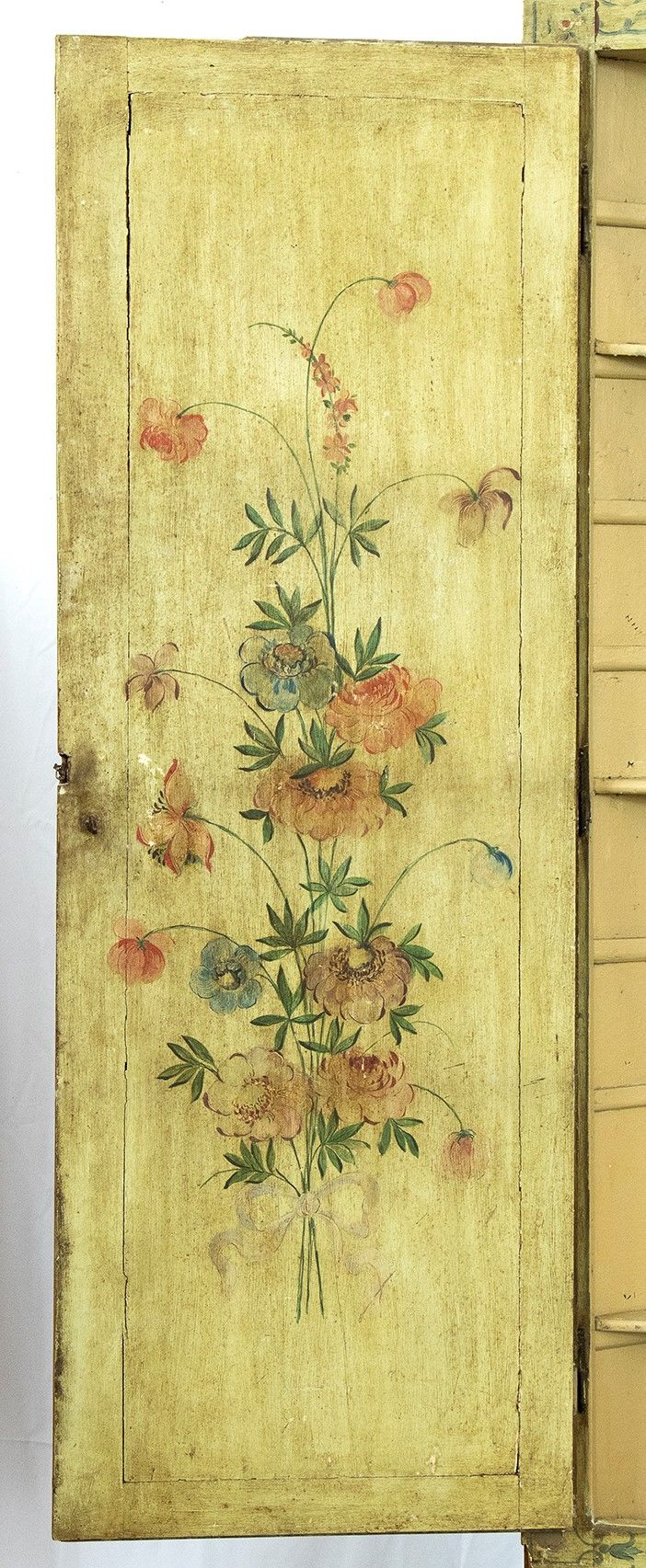 ad unico corpo con piedi tronco piramidali laccati e dipinti, presenta una doppia anta nella parte superiore ed inferiore, dipinte anche all'interno completamente. Serrature coeve.