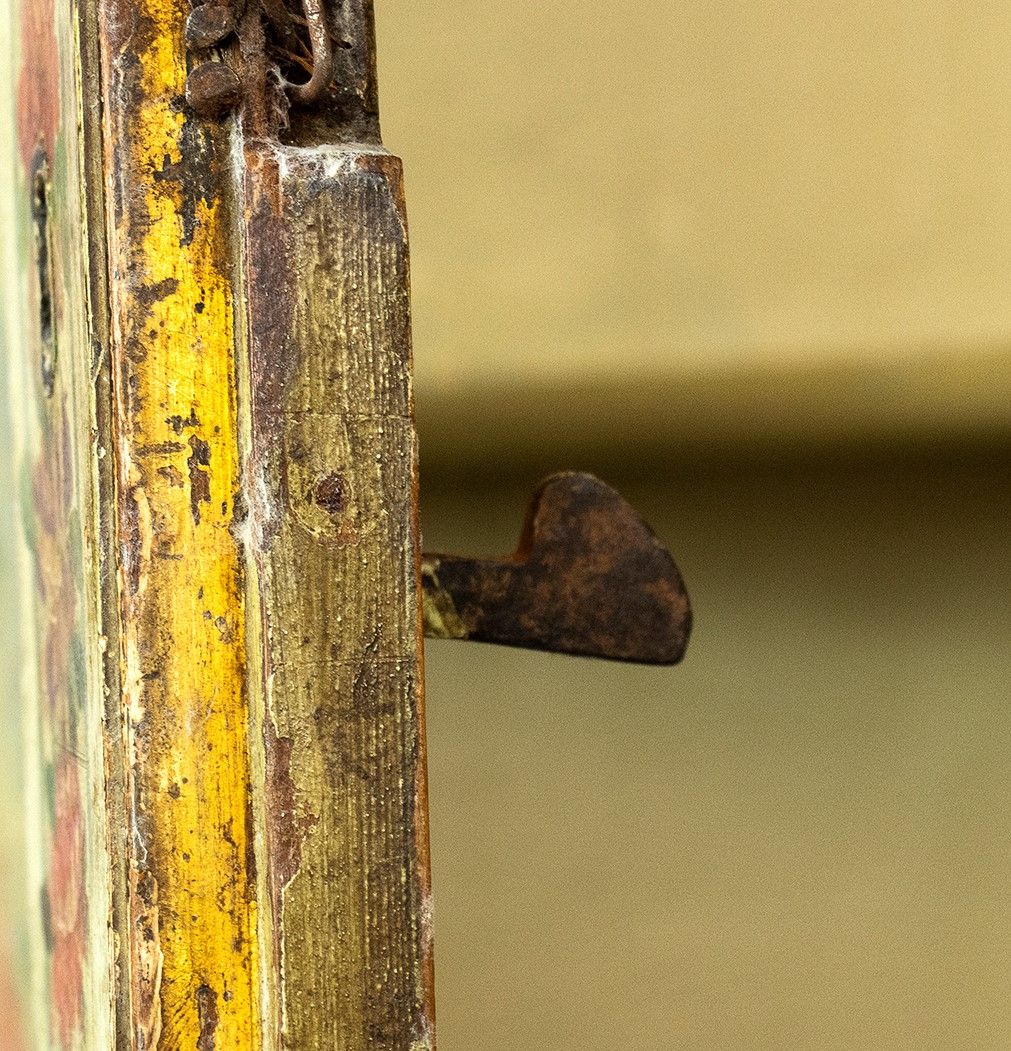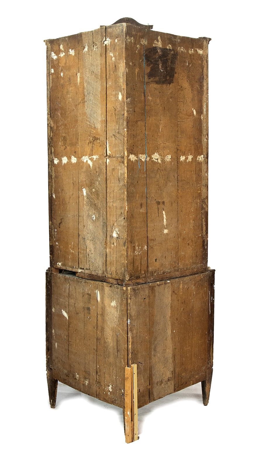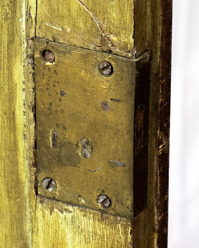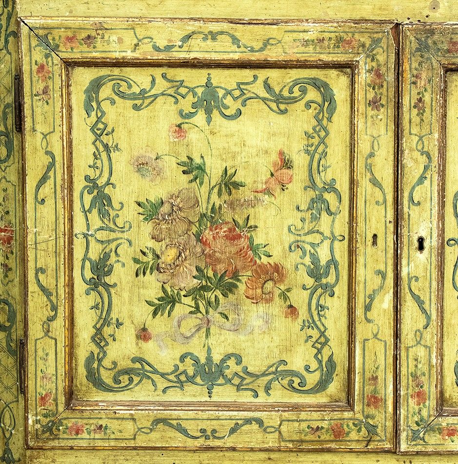 ad unico corpo con piedi tronco piramidali laccati e dipinti, presenta una doppia anta nella parte superiore ed inferiore, dipinte anche all'interno completamente. Serrature coeve.