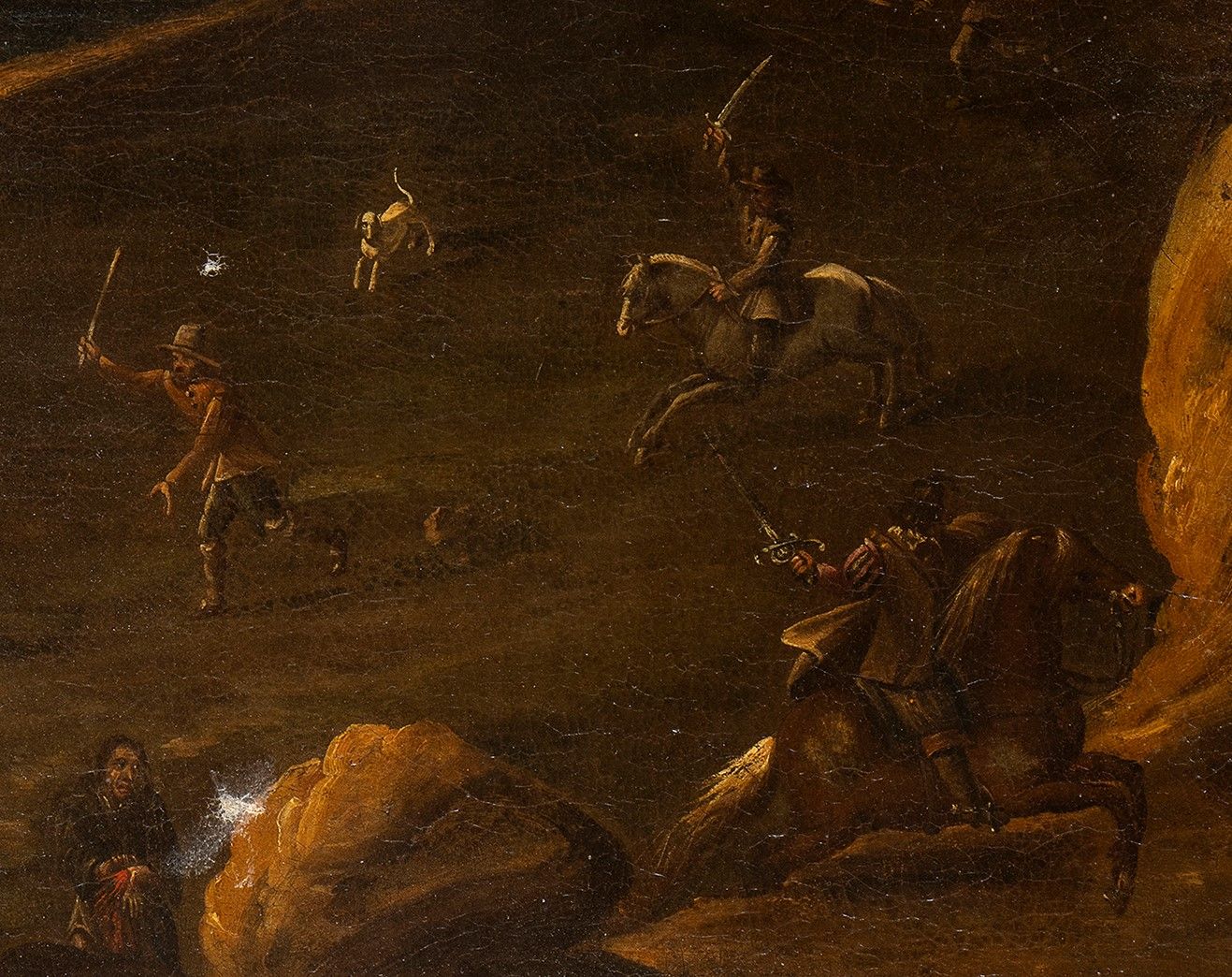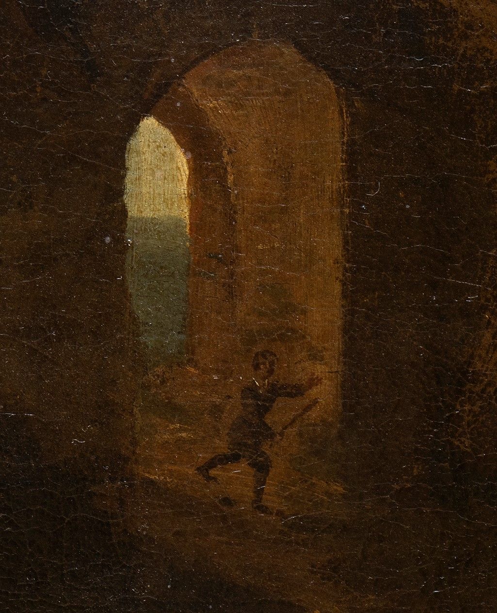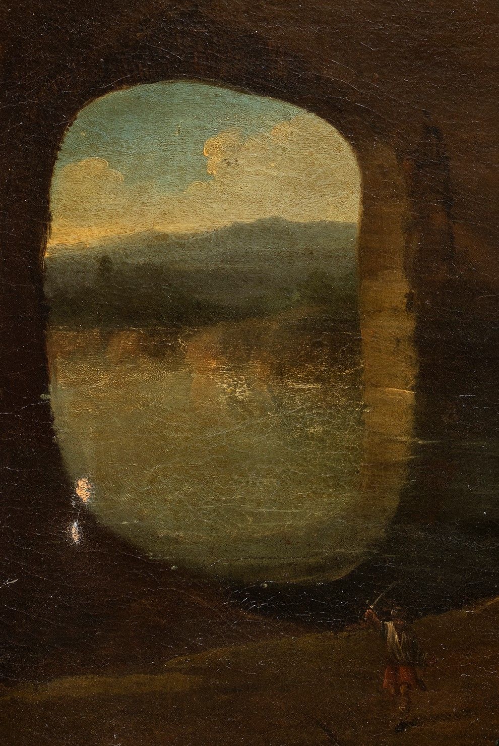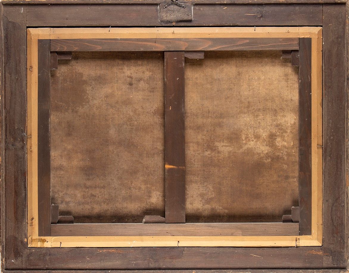 dipinto olio su tela raffigurante personaggi in costume rinascimentale nei pressi di un corso d'acqua; sullo sfondo l'architettura di un ponte.