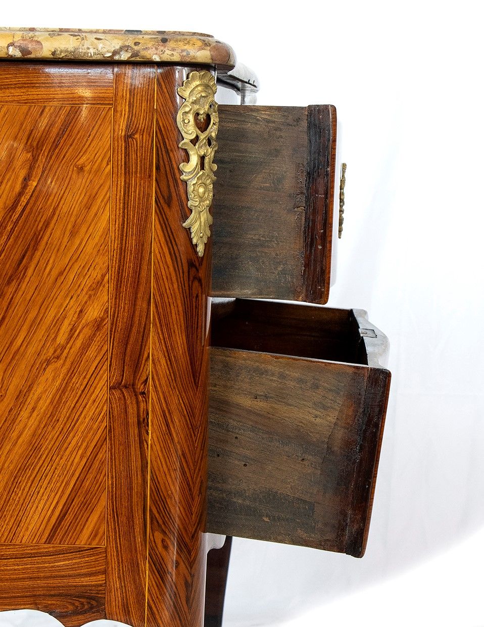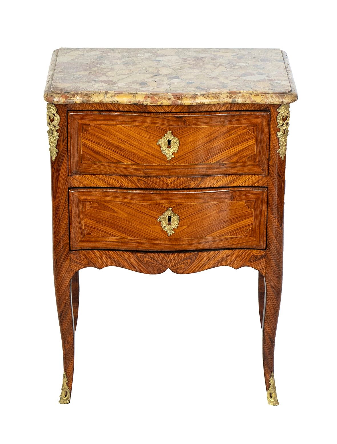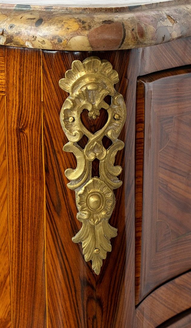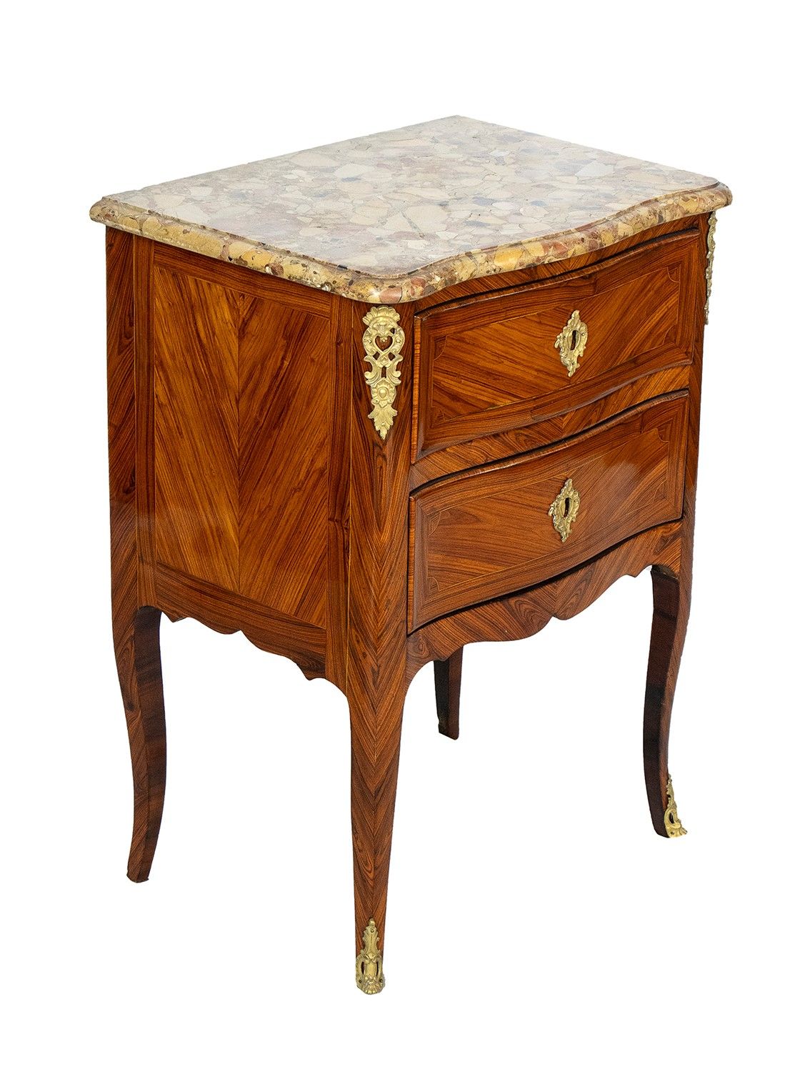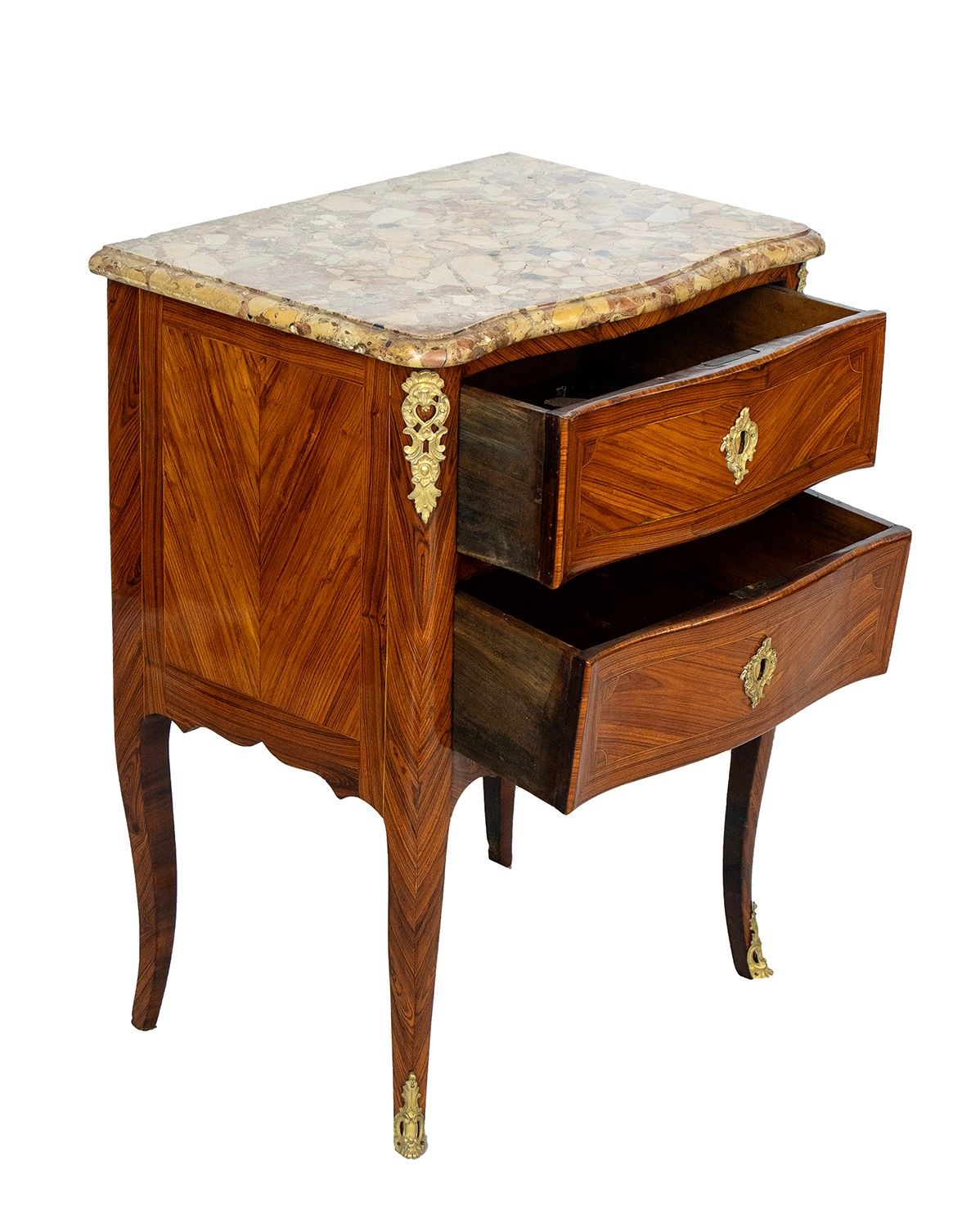 piano in marmo “breccia di Aleppo”, due cassetti intarsiati sul fronte del mobile, ornamenti in bronzo dorati.