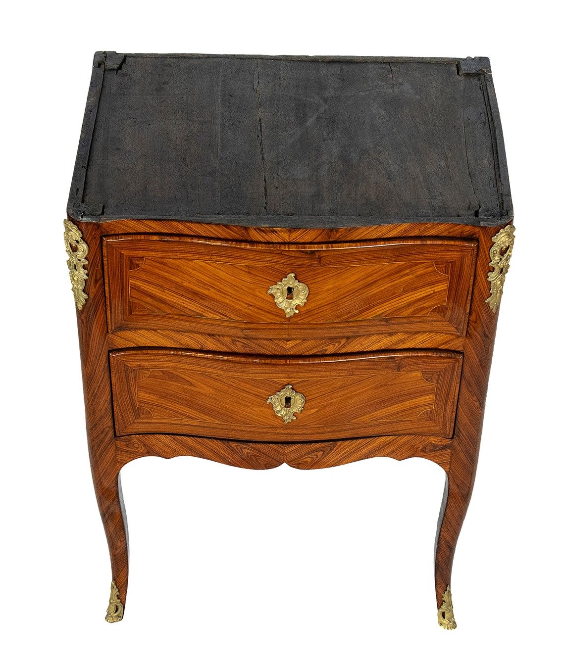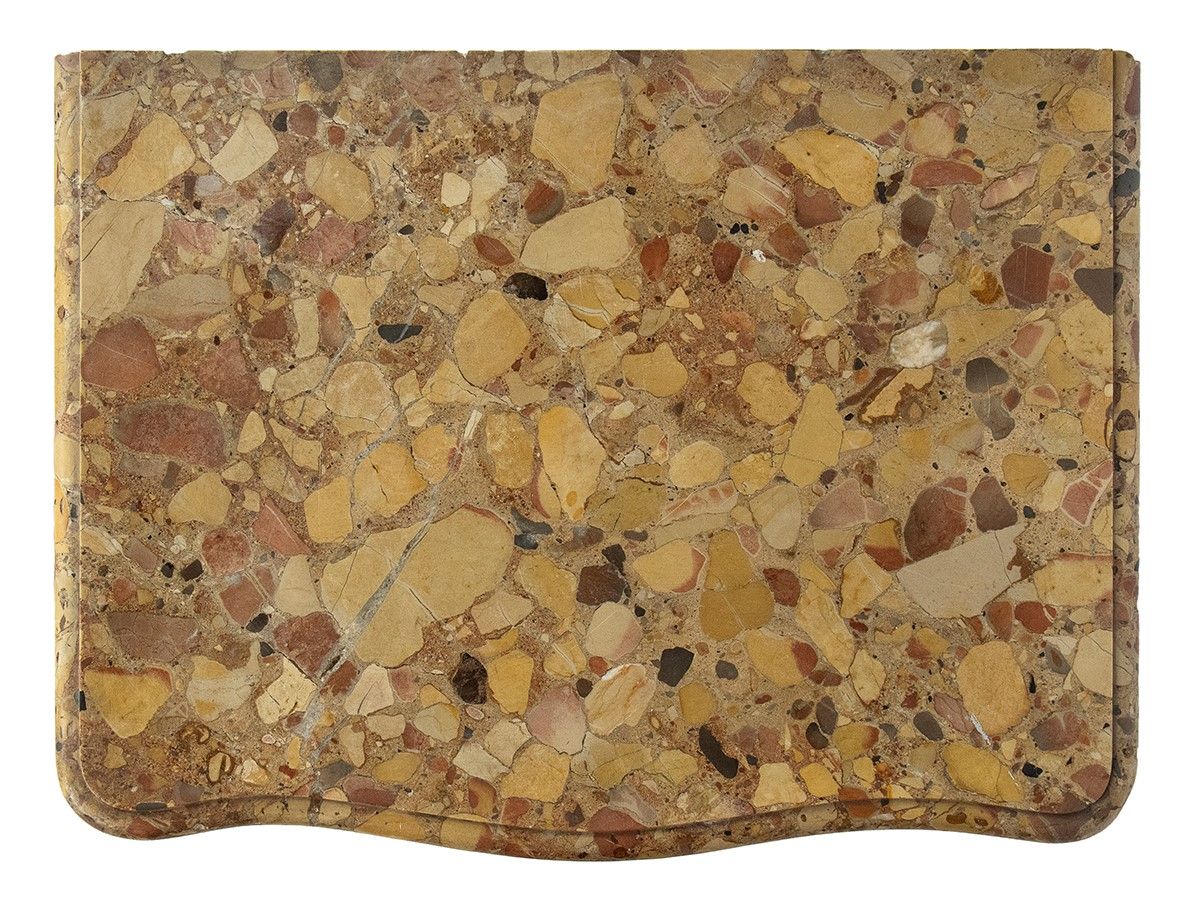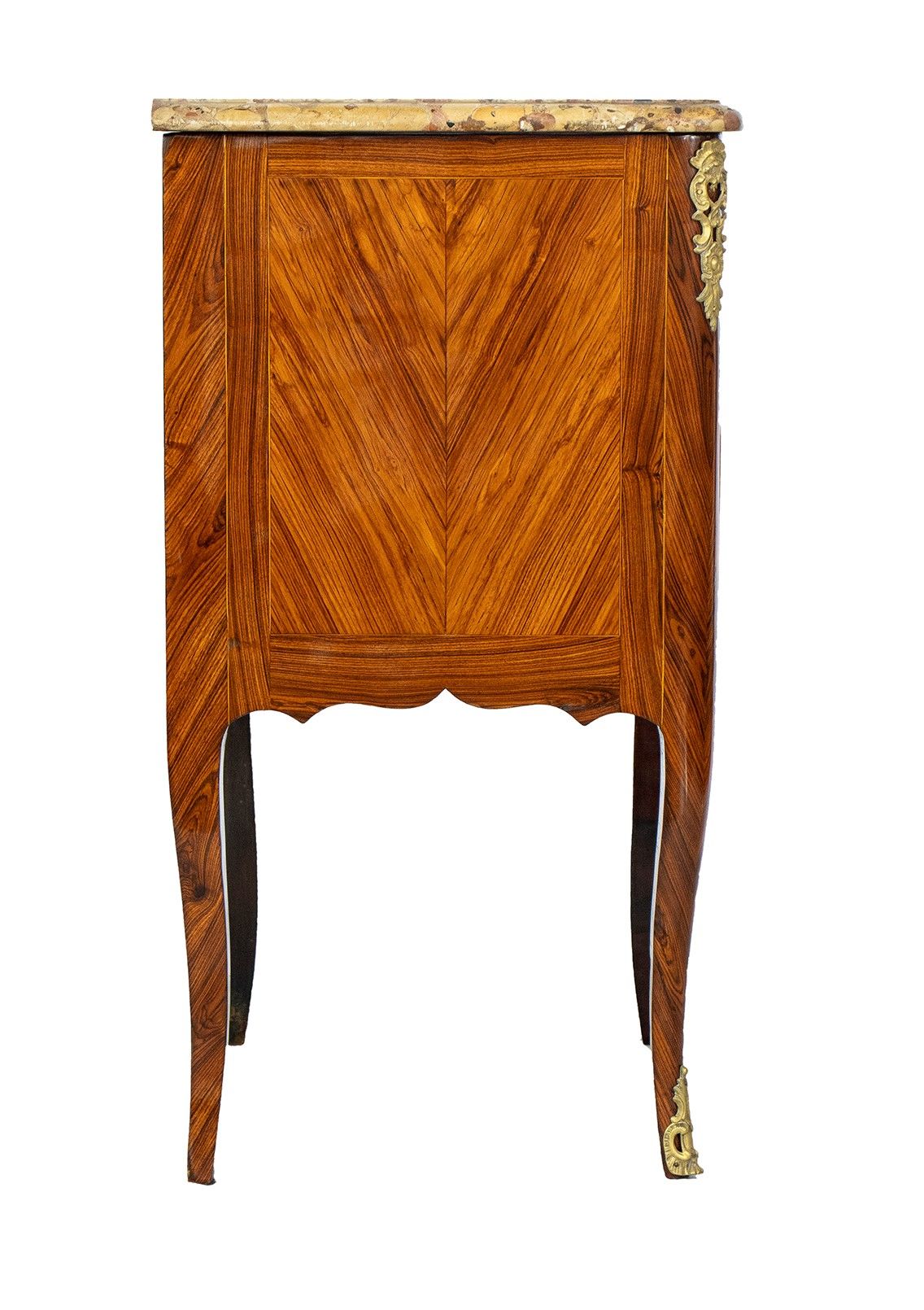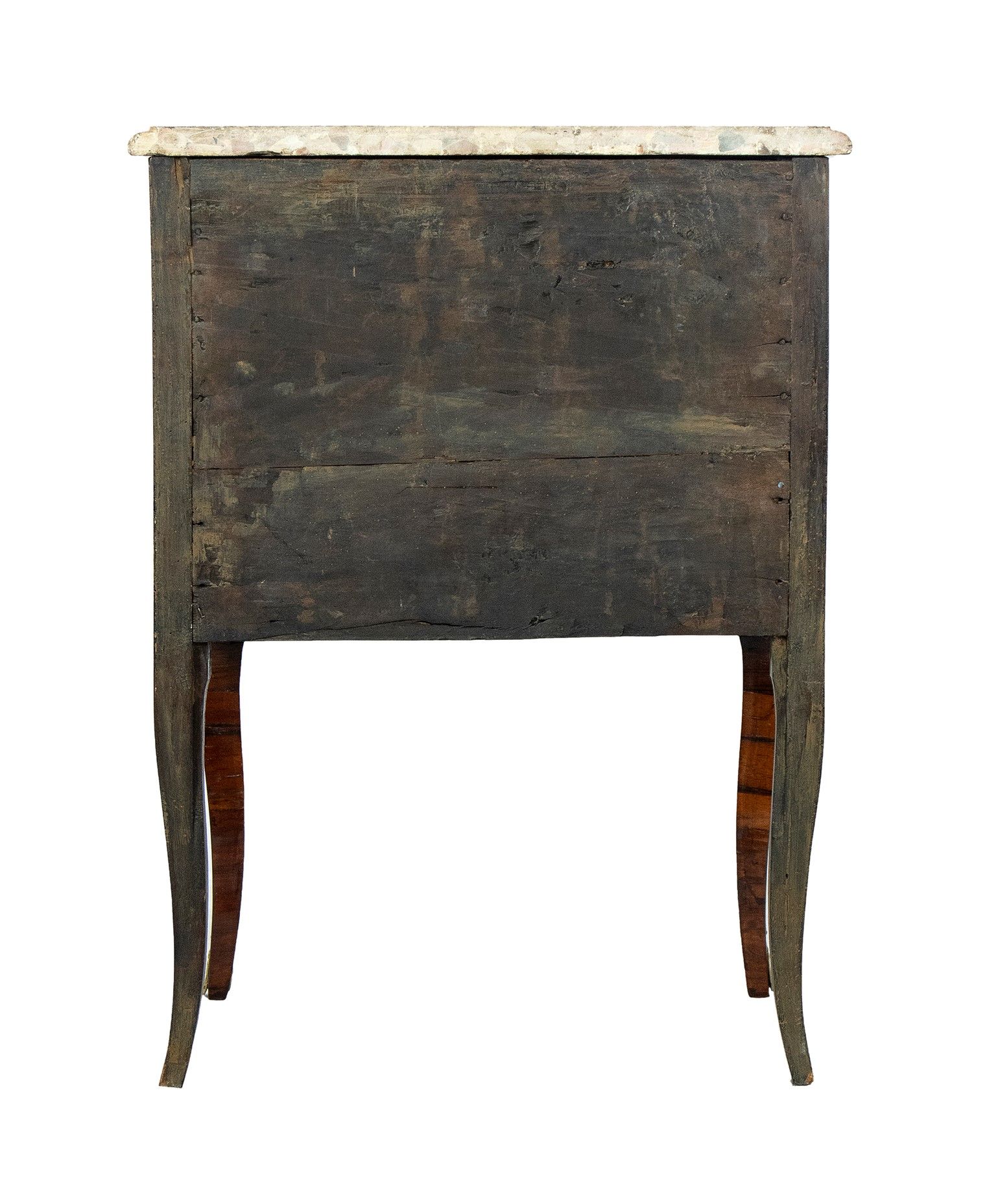 piano in marmo “breccia di Aleppo”, due cassetti intarsiati sul fronte del mobile, ornamenti in bronzo dorati.