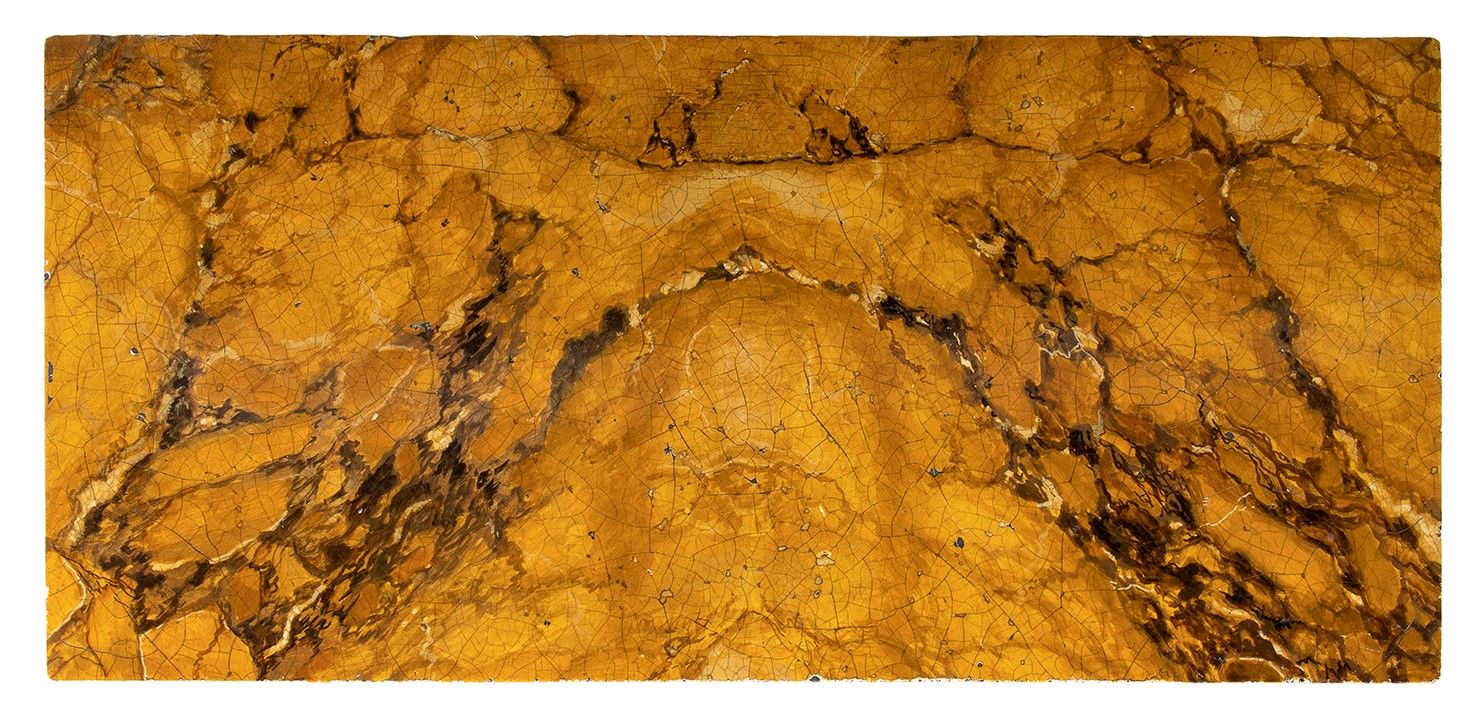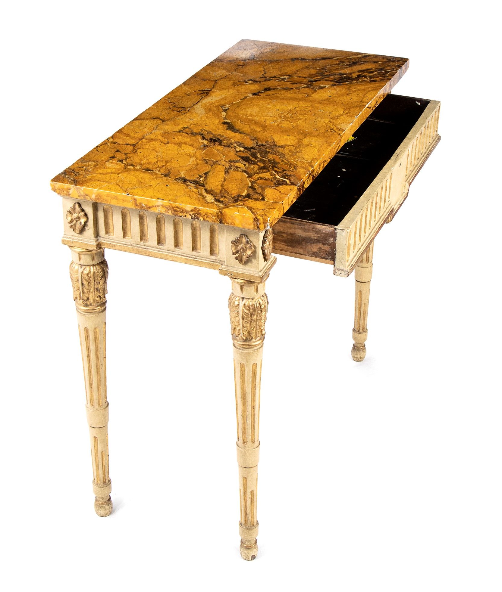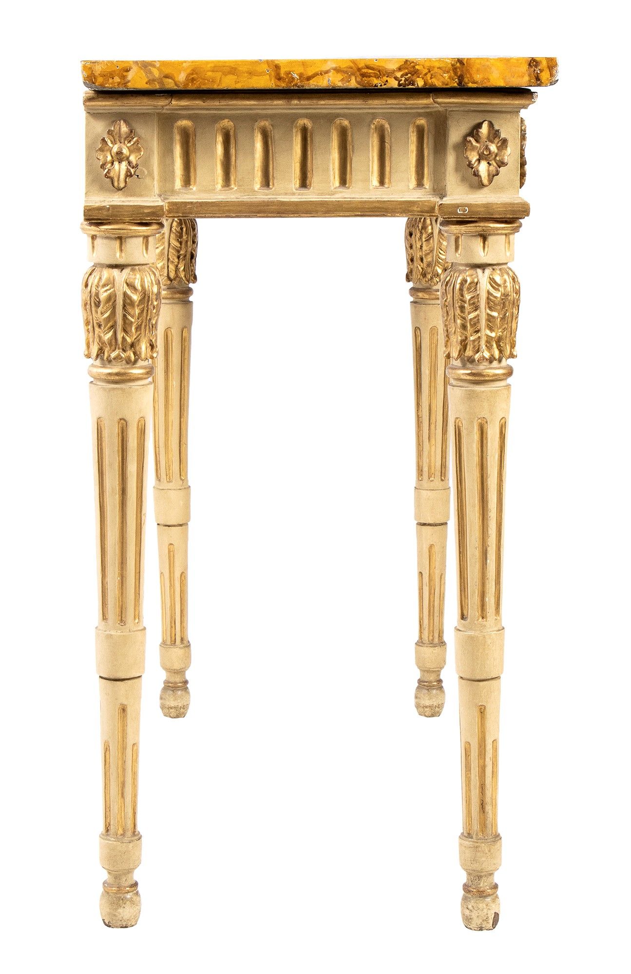 a bianco ed foglia d'oro, intagliata e scolpita su tutta la struttura a vista, il fronte ed i fianchi decorati con festoni a foglie di alloro. Le quattro gambe a forma troncoconica sono scanalate e adornate sia nella parte superiore che inferiore da foglie intagliate. Marmo non coevo. Altezza x larghezza x profondità : 92 x 119 x 56 cm. Stato di conservazione: ***** eccellente.