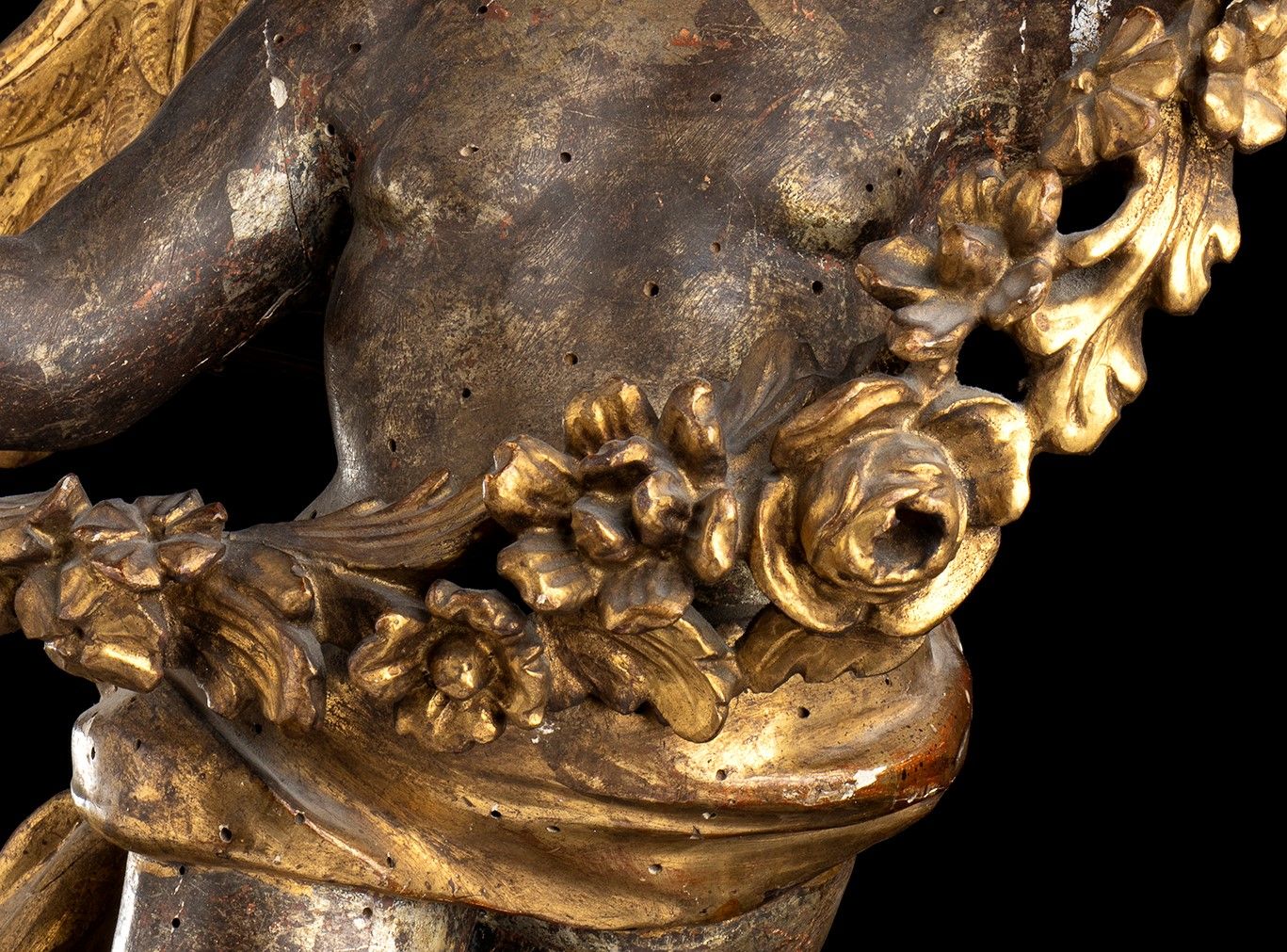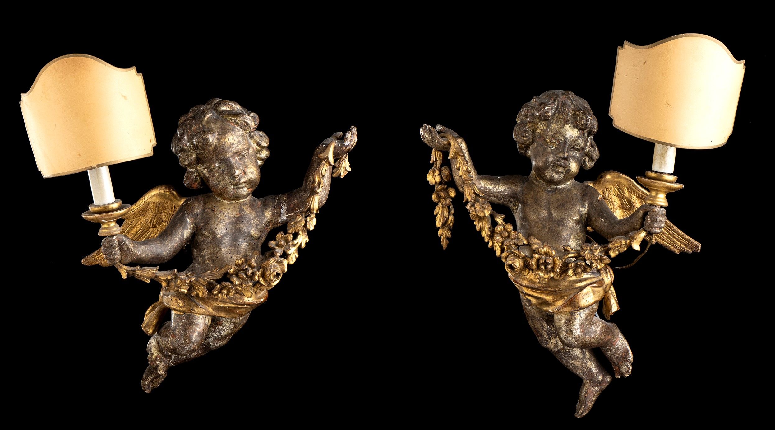 intagliati in legno laccati a colori e dorati. Elettrificati in secondo momento.
