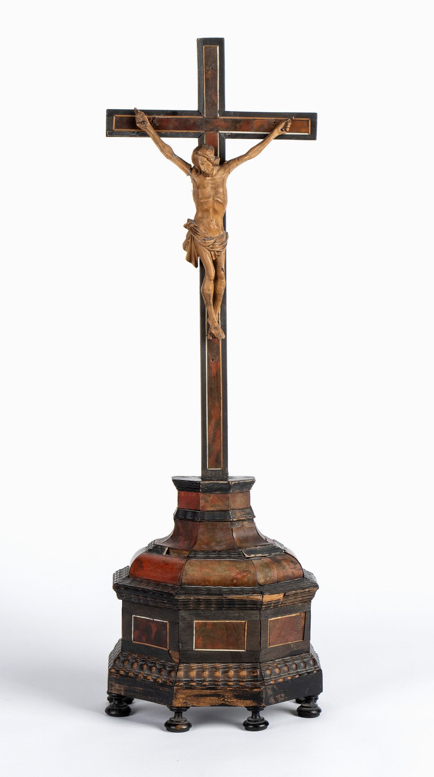 “Corpus Christi” in legno intagliato a tutto tondo e composto da tre pezzi corrispondenti alle braccia e al corpo, posto su una croce lignea con cbasamento in legno di pioppo ebanizzato con inserti in tartaruga (hawksbill sea turtle, Eretmochelys imbricata, Cheloniidae). Il Cristo è rappresentato con la testa leggermente inclinata verso la spalla destra barba che segue la mascella e piedi incrociati. Il perizoma si presenta drappeggiato verticalmente e ricade lungo il fianco destro.