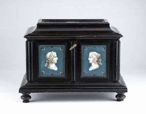 di forma rettangolare con coperchio incernierato, in legno ebanizzato con riserve in smalto. Firmato A Klein [..]