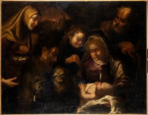 olio su tela, Sacra famiglia con personaggi in adorazione. Altezza x larghezza cornice: 102 x 68 cm. Altezza x [..]