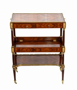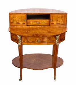 in stile Luigi XVI, con ripiani nascosti, doppio cassetto laterale alternati ad uno finto; due ripiani sottostanti, [..]
