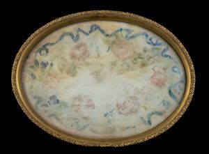 di forma ovale con bordo perimetrale a decori vegetali; il piano in marmo, dipinto in policromia con fiori e nastri, [..]