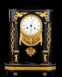 cassa a tempio in marmo nero del Belgio con putti, animali mitologici e decori in bronzo dorato, quadrante circolare [..]