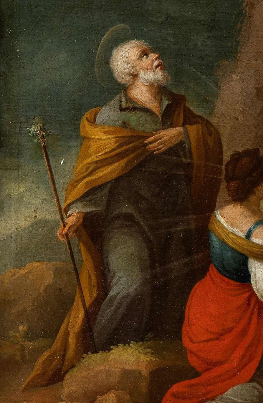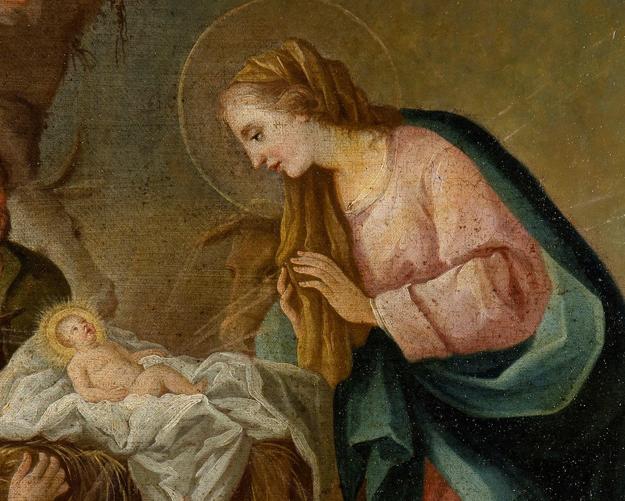 olio su tela, Sacra famiglia con personaggi in adorazione.