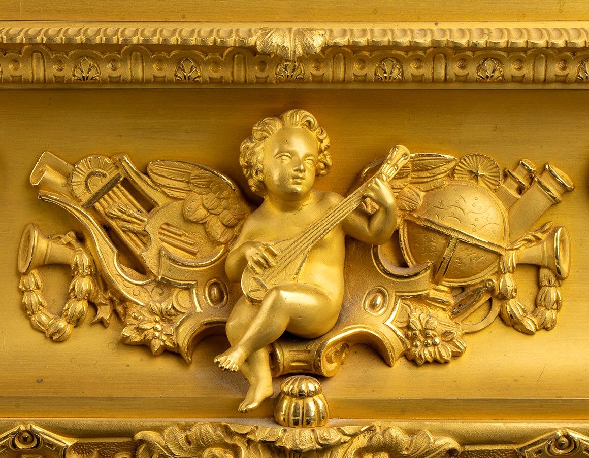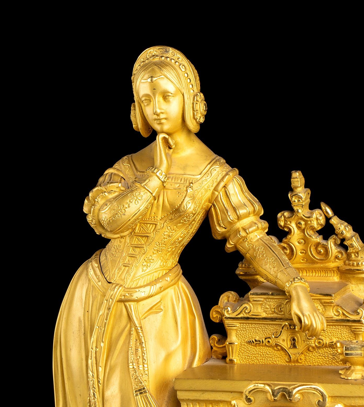 cassa in bronzo dorato, sormontata da una dama in abiti rinascimentali. Quadrante circolare con numeri romani firmato C. Detouche Bte. - 160 RUE ST MARTIN, movimento con sospensione a filo, regolatore a pendolo e suoneria delle ore e delle mezze su campana.