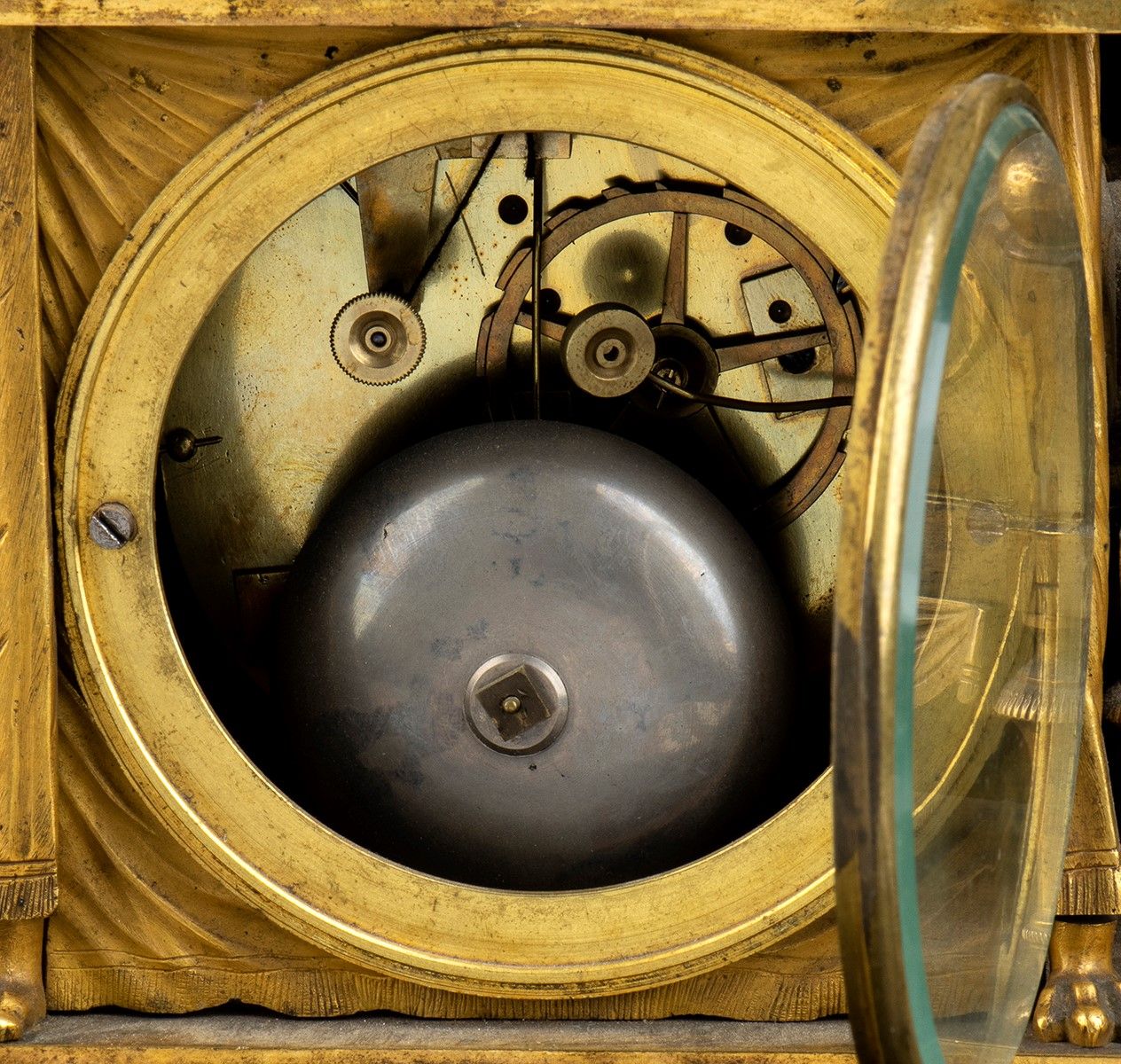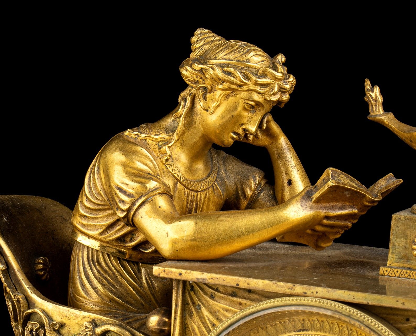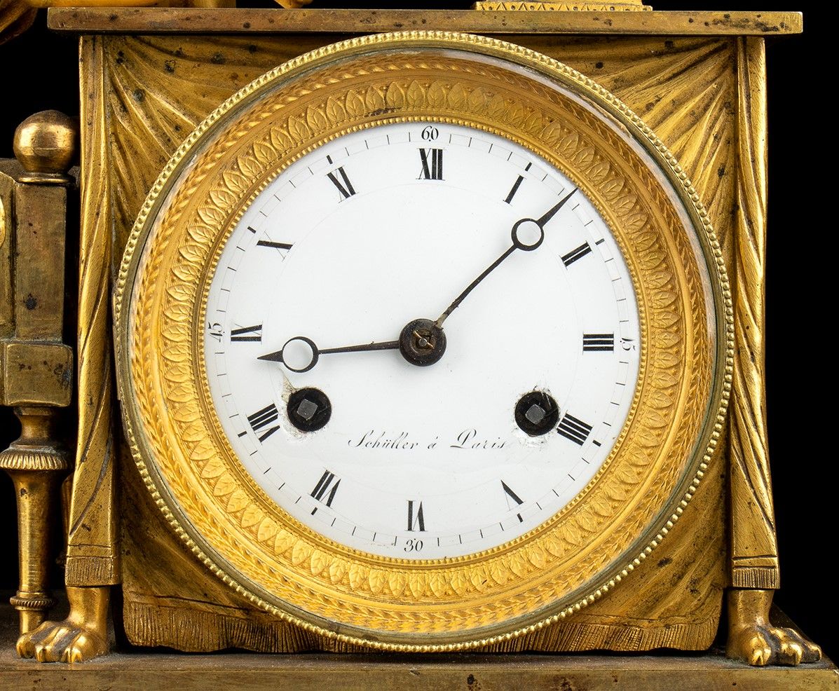 cassa con basamento in marmo verde e bronzo dorato, sormontata da una figura femminile che legge in bronzo dorato. Quadrante circolare con numeri romani firmato Schüller a Paris, movimento con sospensione a filo, regolatore a pendolo e suoneria delle ore e delle mezze su campana.Modello originale disegnato da J.A.Reiche nel 1805. Altezza x larghezza x profondità: 32 x 28,5 x 13,5 cm. Stato di conservazione: **** buono. (Ref. Encyclopédie de La Pendule Fraçaise” by Pierre Kjellberg” Pag 398 - “French bronze clocks” by Elke Niehüser pag.86 ft 132-133).