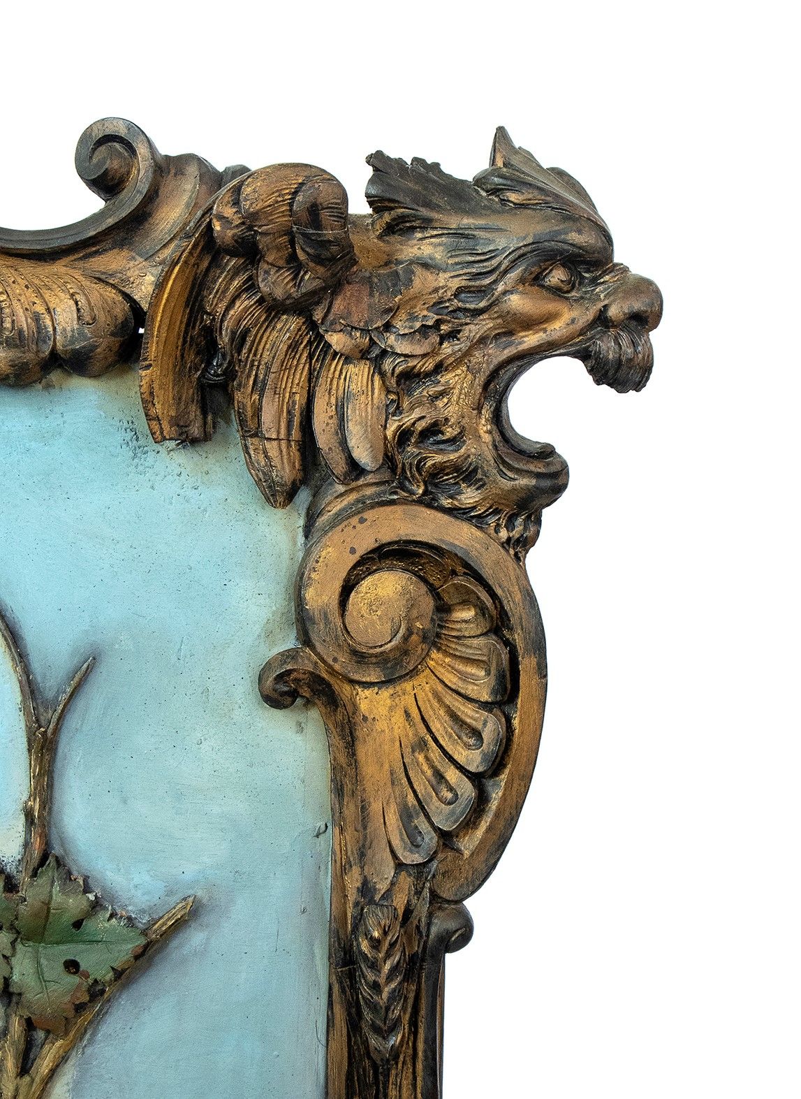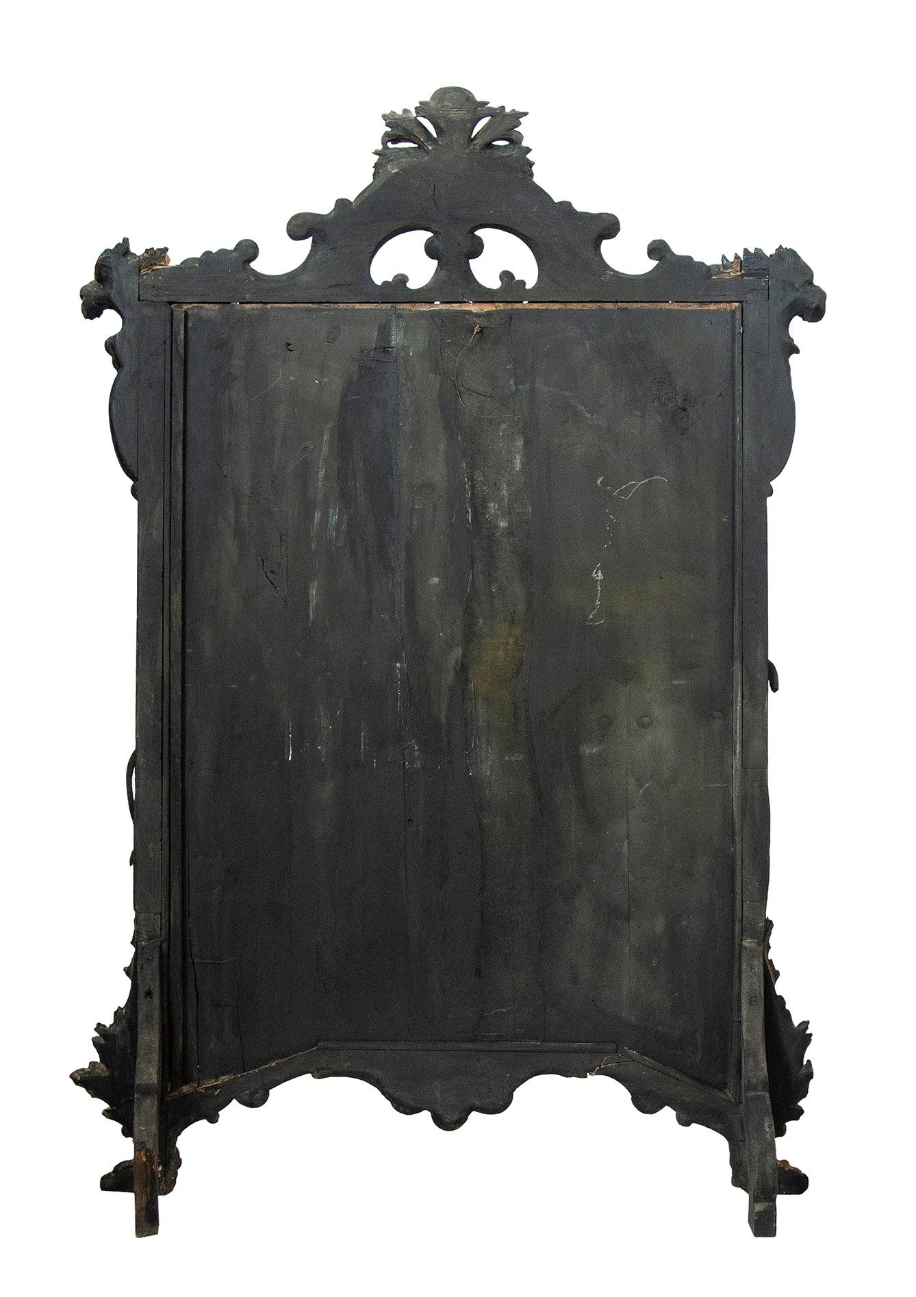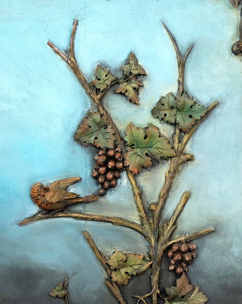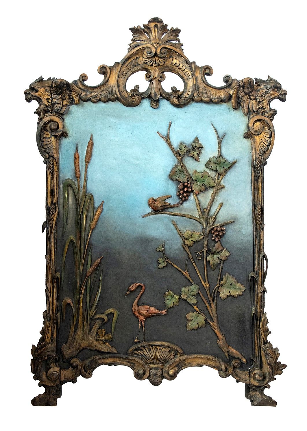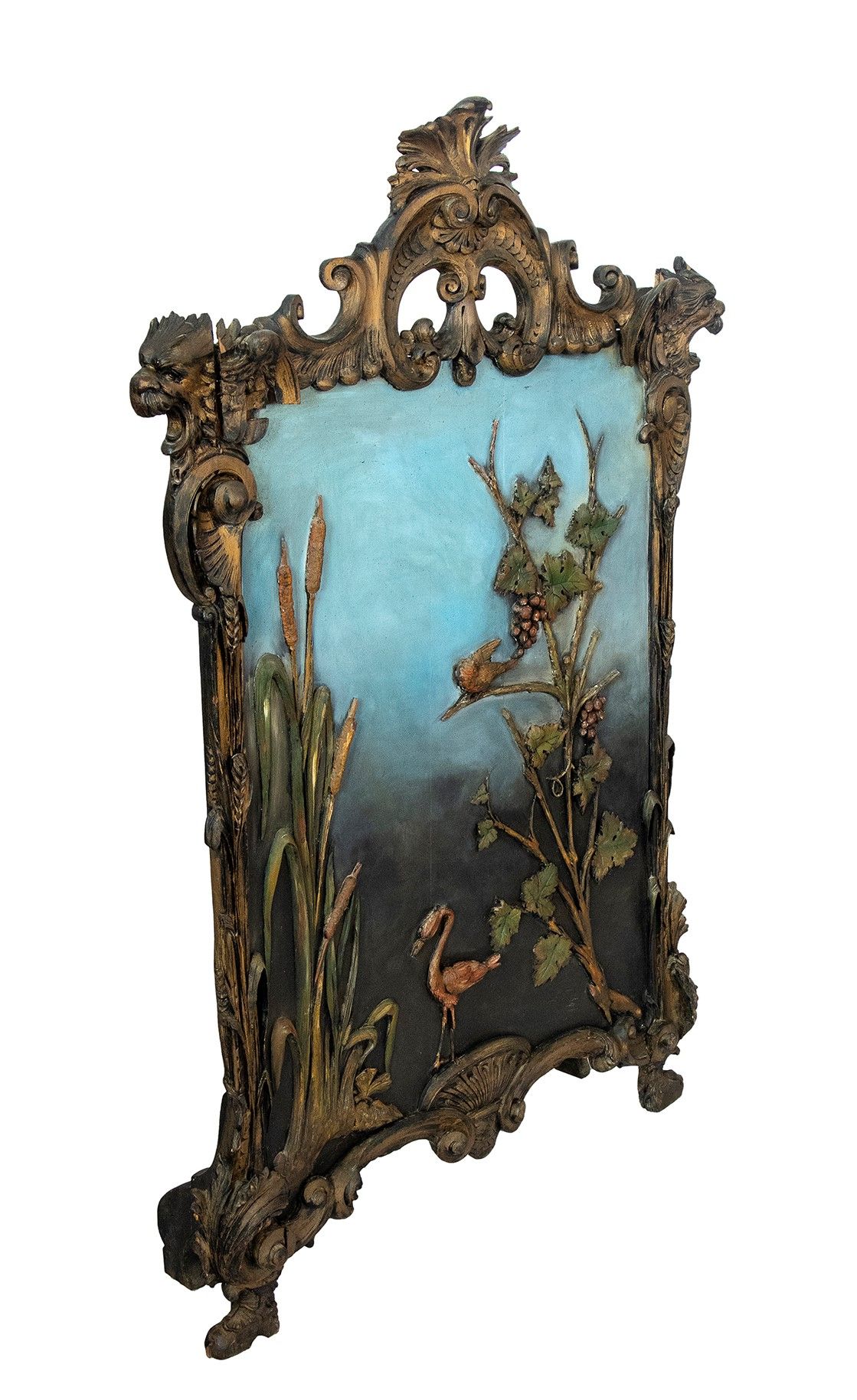 di grandi dimensioni con cornice in legno intagliato. Pannello centrale dipinto a colori pastello, con un airone affiancato da un canneto e da tralci di vite con grappoli d'uva. Altezza x larghezza x profondità : 169 x 115 x 27 cm. Stato di conservazione: **** buono.