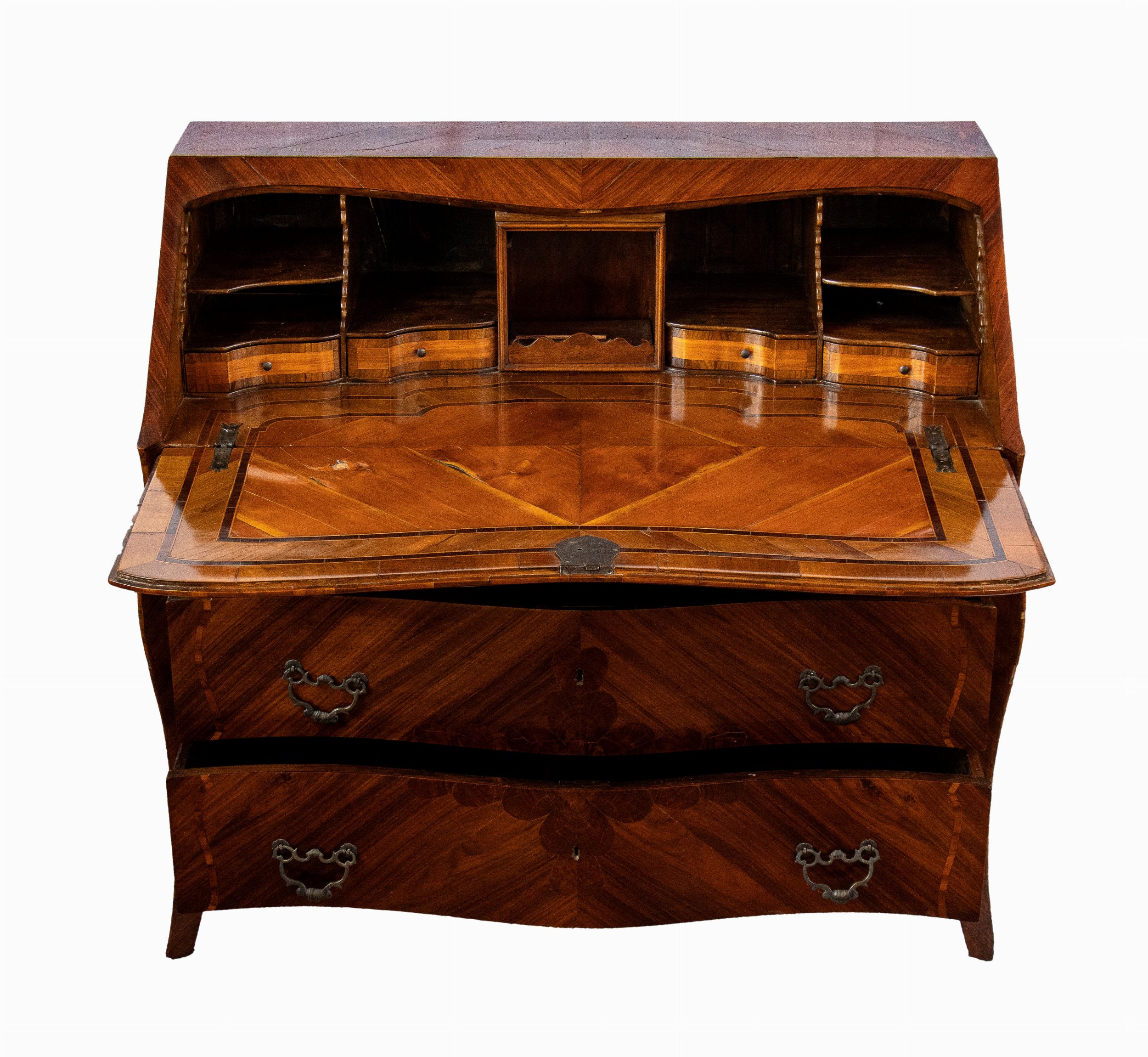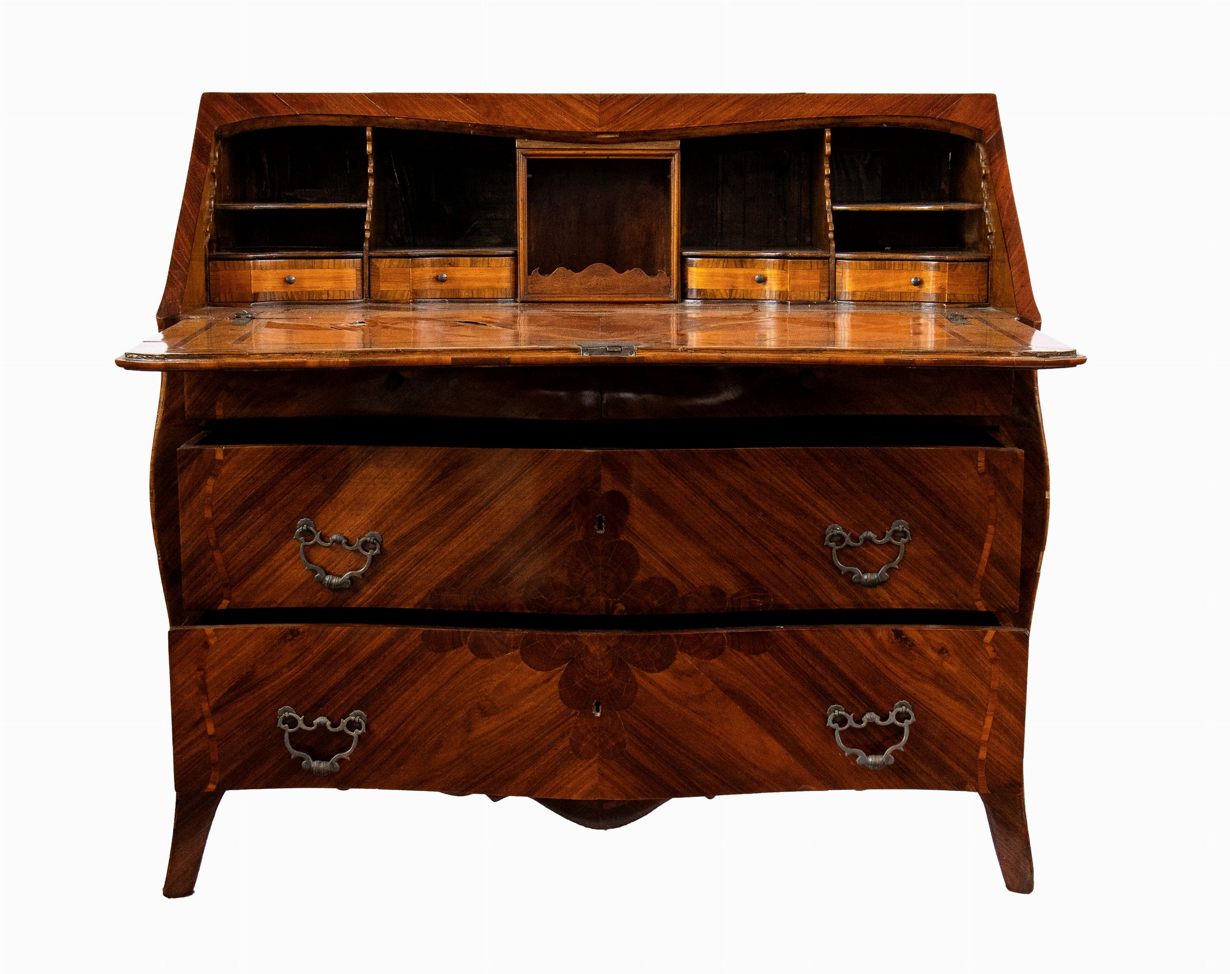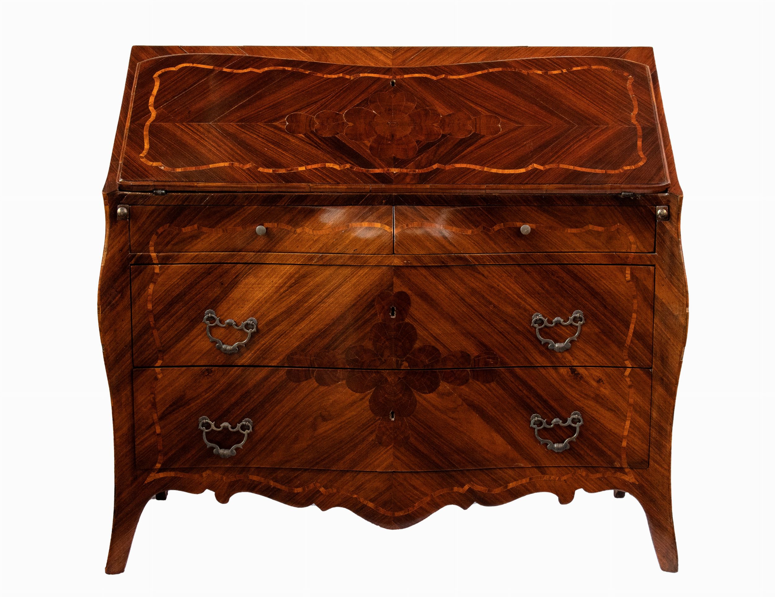 lastronata in ebano viola ad intarsi in legno di rosa con rosoni cuoriformi. Sagomata con doppia bombatura, fronte e lati. L'intarsio a rosoni è nel tipico decoro a quadrifoglio allungato, in questo caso partocolarmente raro in quanto allungato su tutto il fronte mosso. La base poggia su piedi cabriolet. Maniglie, bocchette e montature in bronzo dorato. Altezza larghezza profondità : 111 x 122 x 56 cm Stato di conservazione: **** buono.