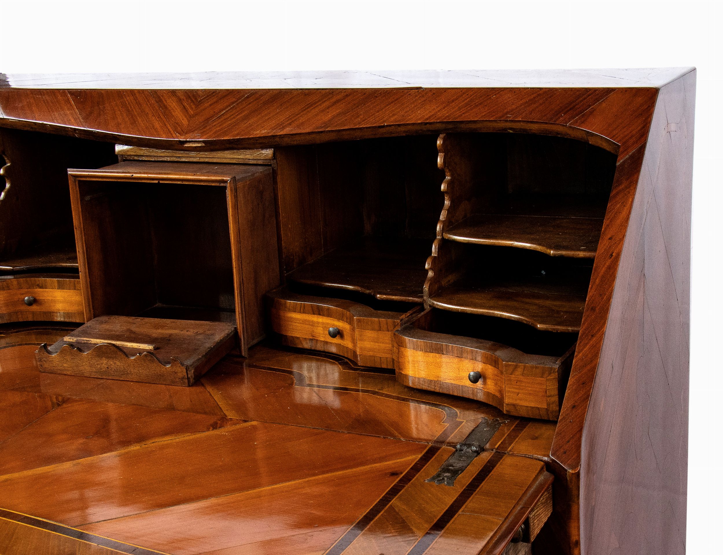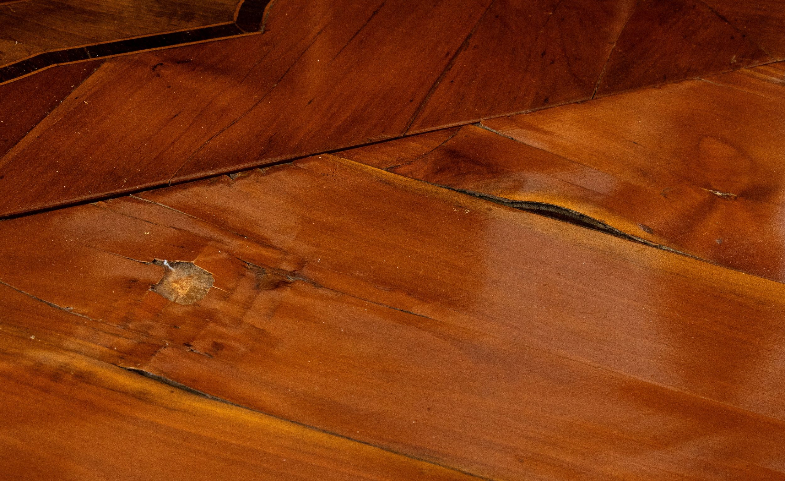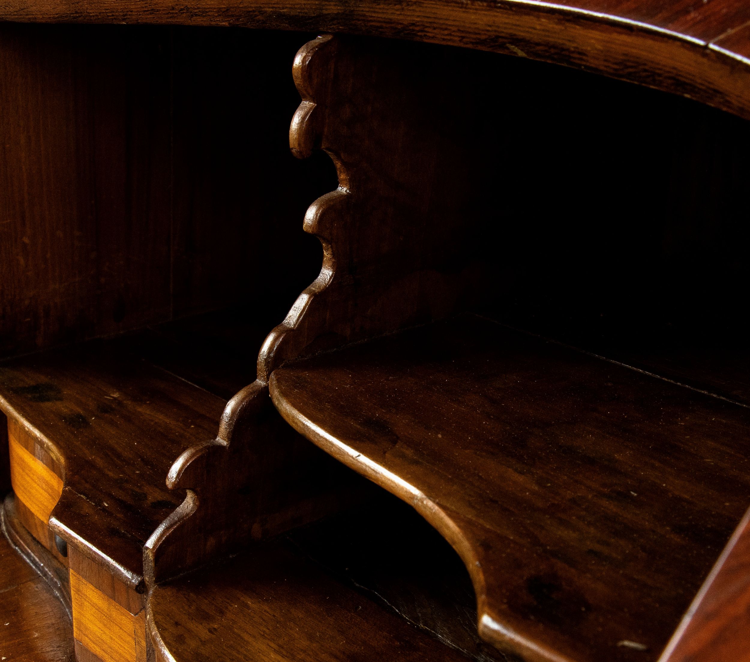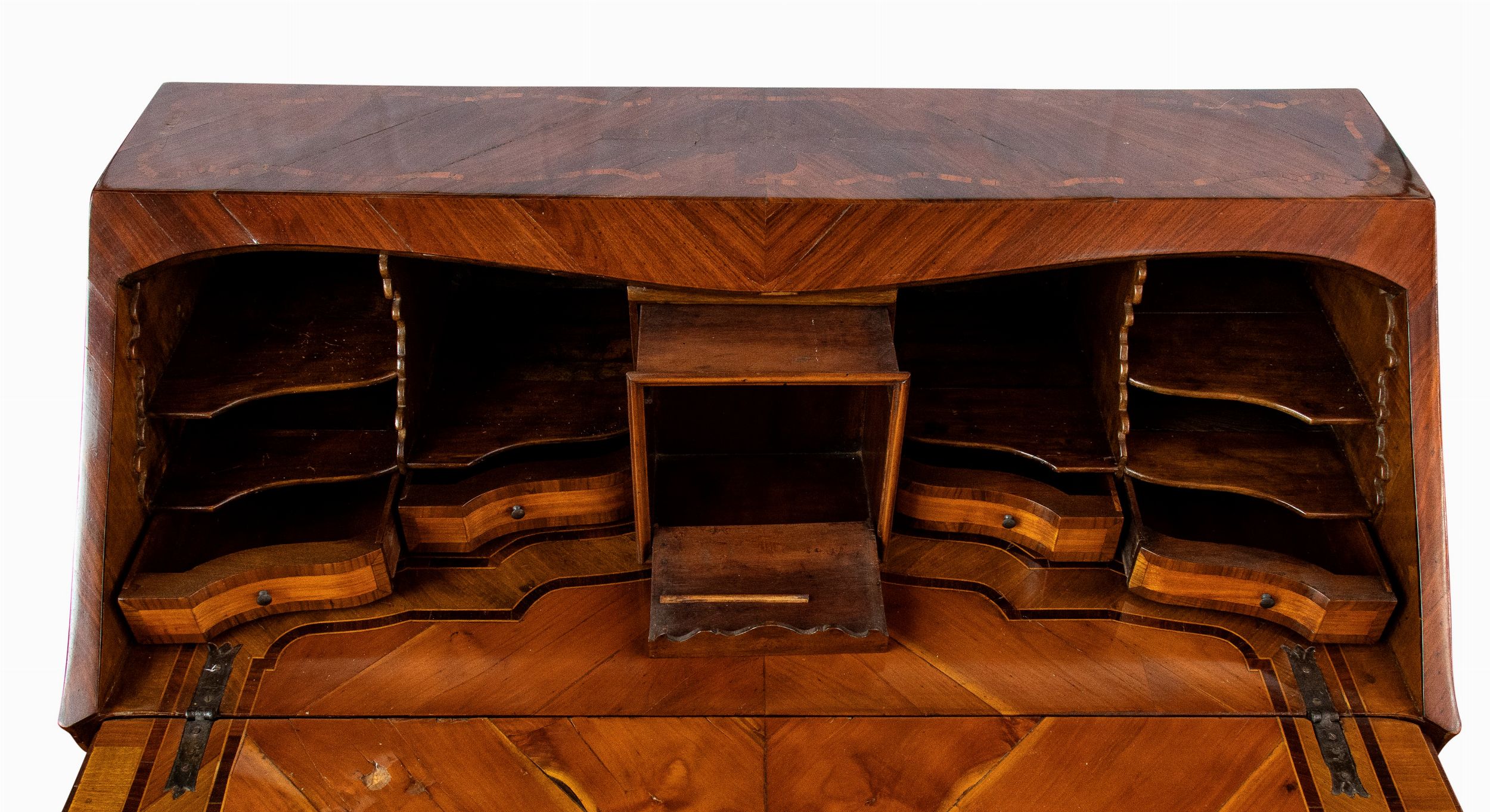 lastronata in ebano viola ad intarsi in legno di rosa con rosoni cuoriformi. Sagomata con doppia bombatura, fronte e lati. L'intarsio a rosoni è nel tipico decoro a quadrifoglio allungato, in questo caso partocolarmente raro in quanto allungato su tutto il fronte mosso. La base poggia su piedi cabriolet. Maniglie, bocchette e montature in bronzo dorato. Altezza larghezza profondità : 111 x 122 x 56 cm Stato di conservazione: **** buono.