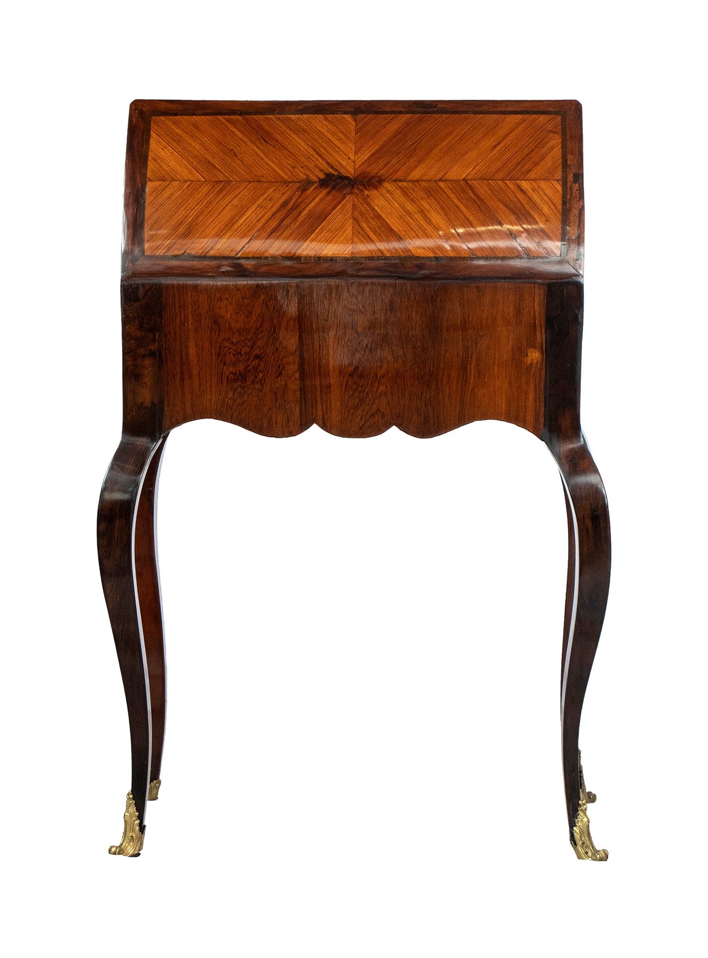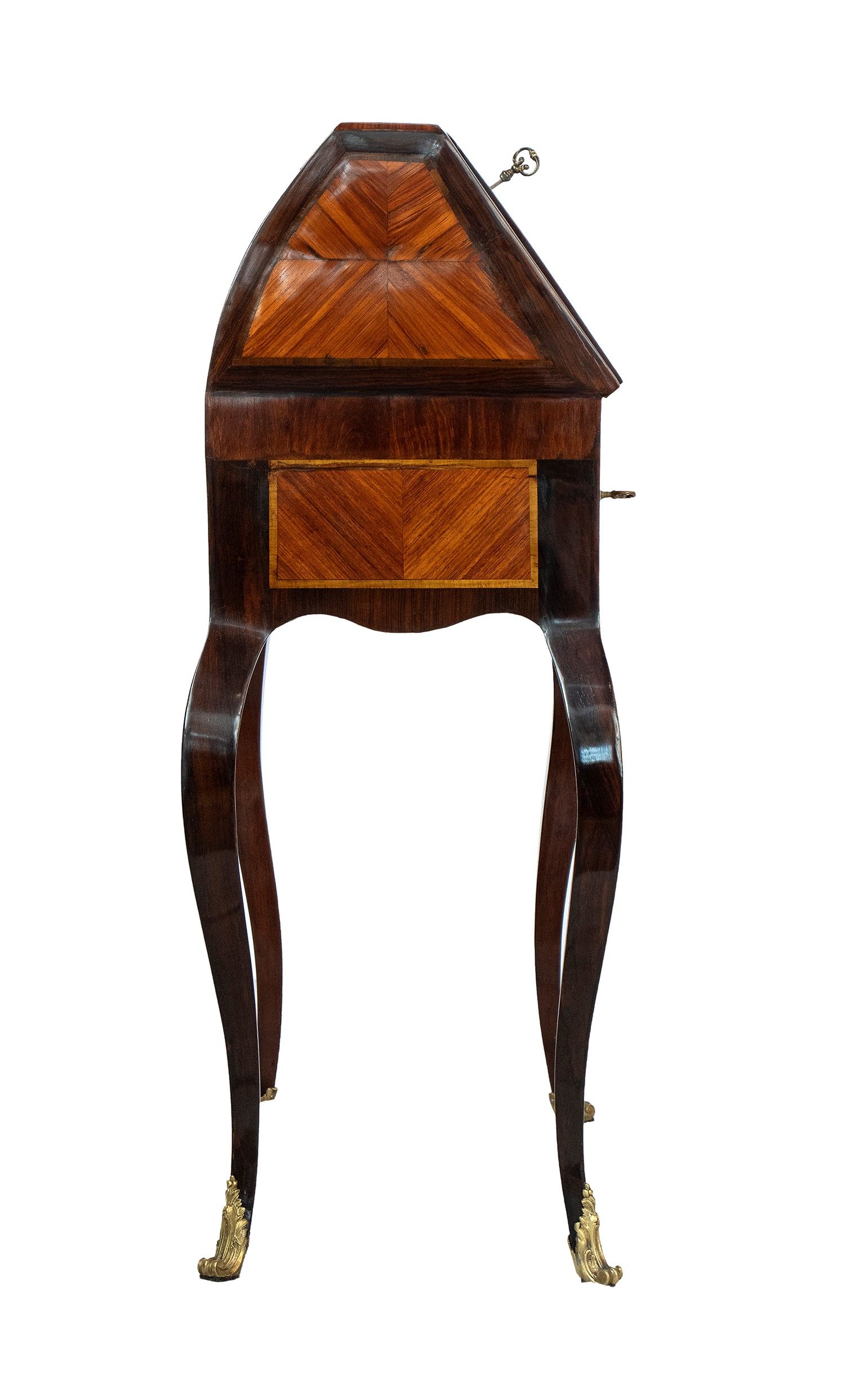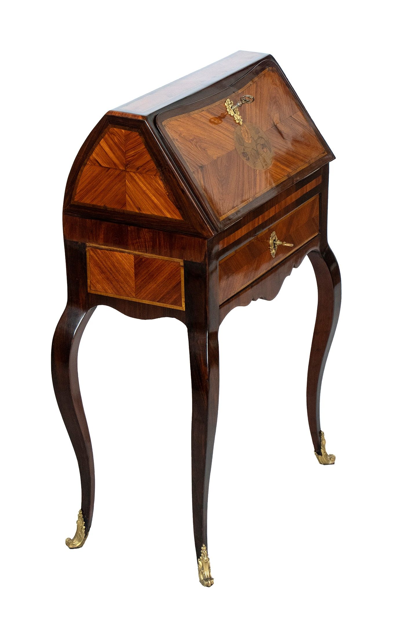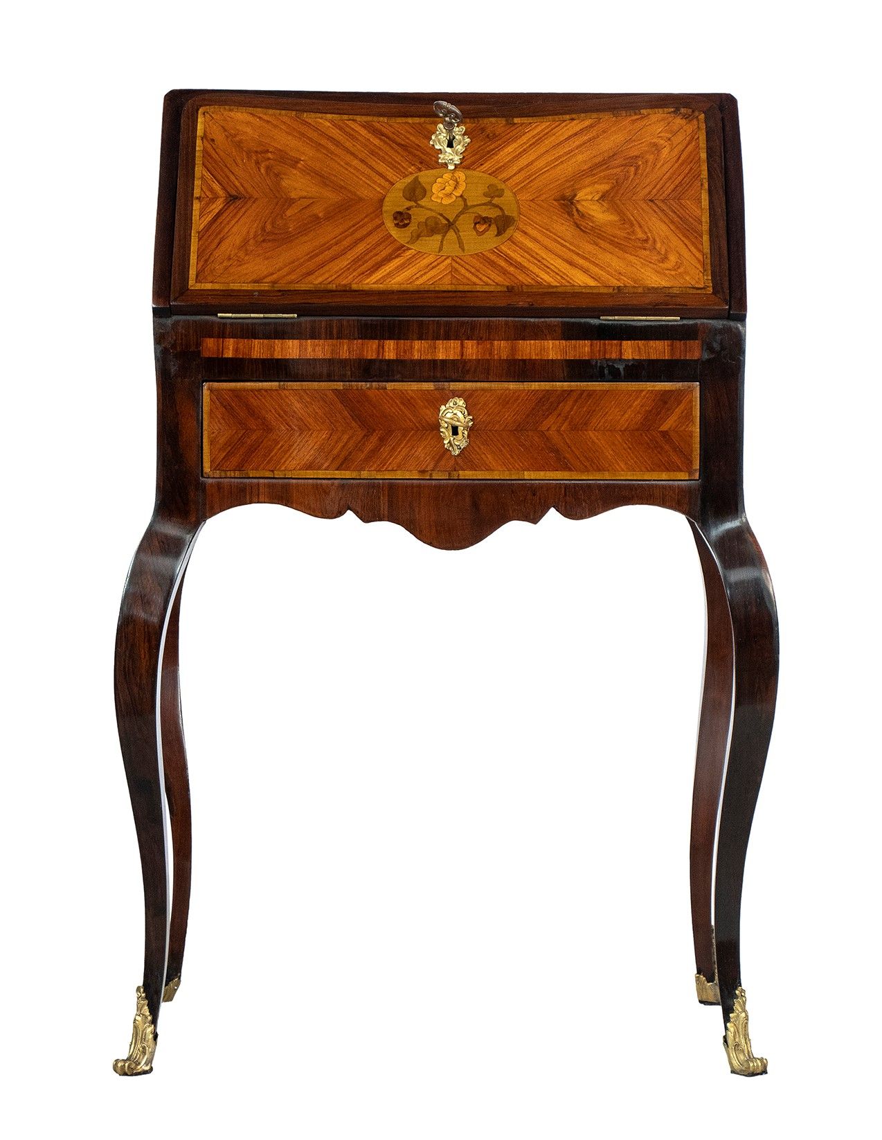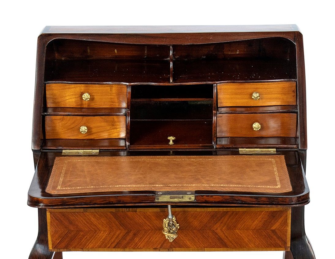 nella rara forma di bauletto con gambe cabriolet, piano scrittoio con inserto in pelle, impreziosita da intarsi in legno di frutto e applicazioni in bronzo dorato.