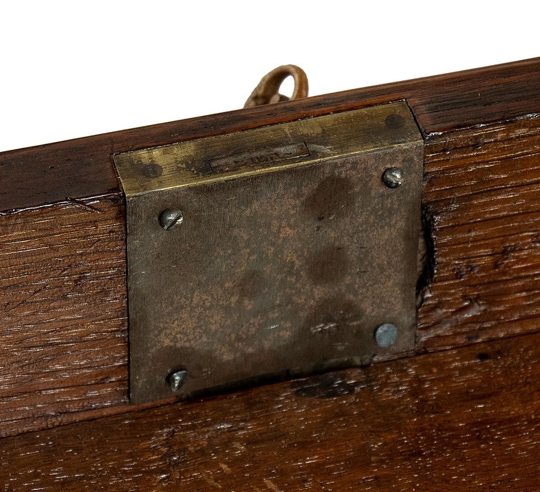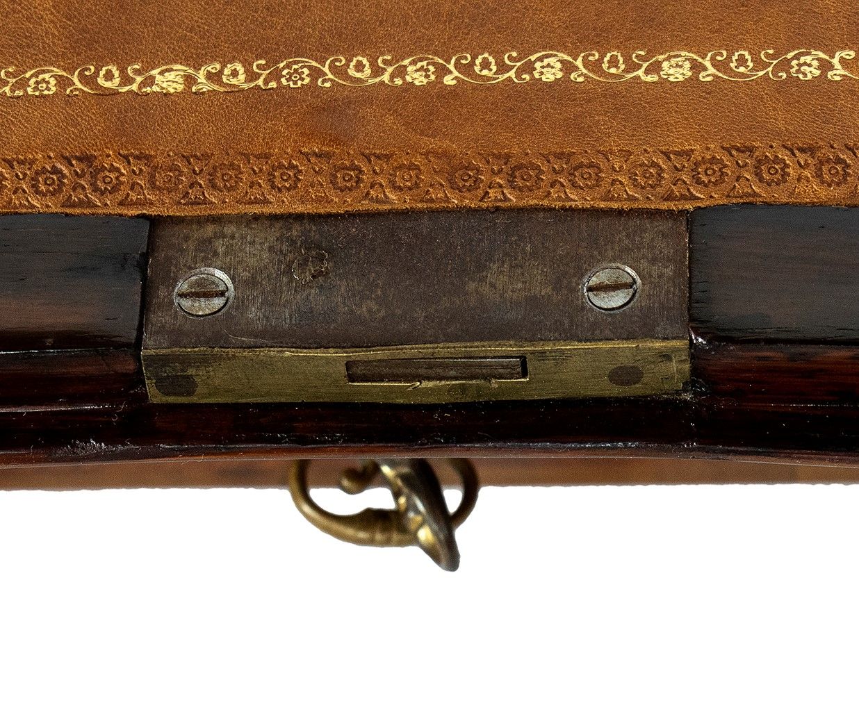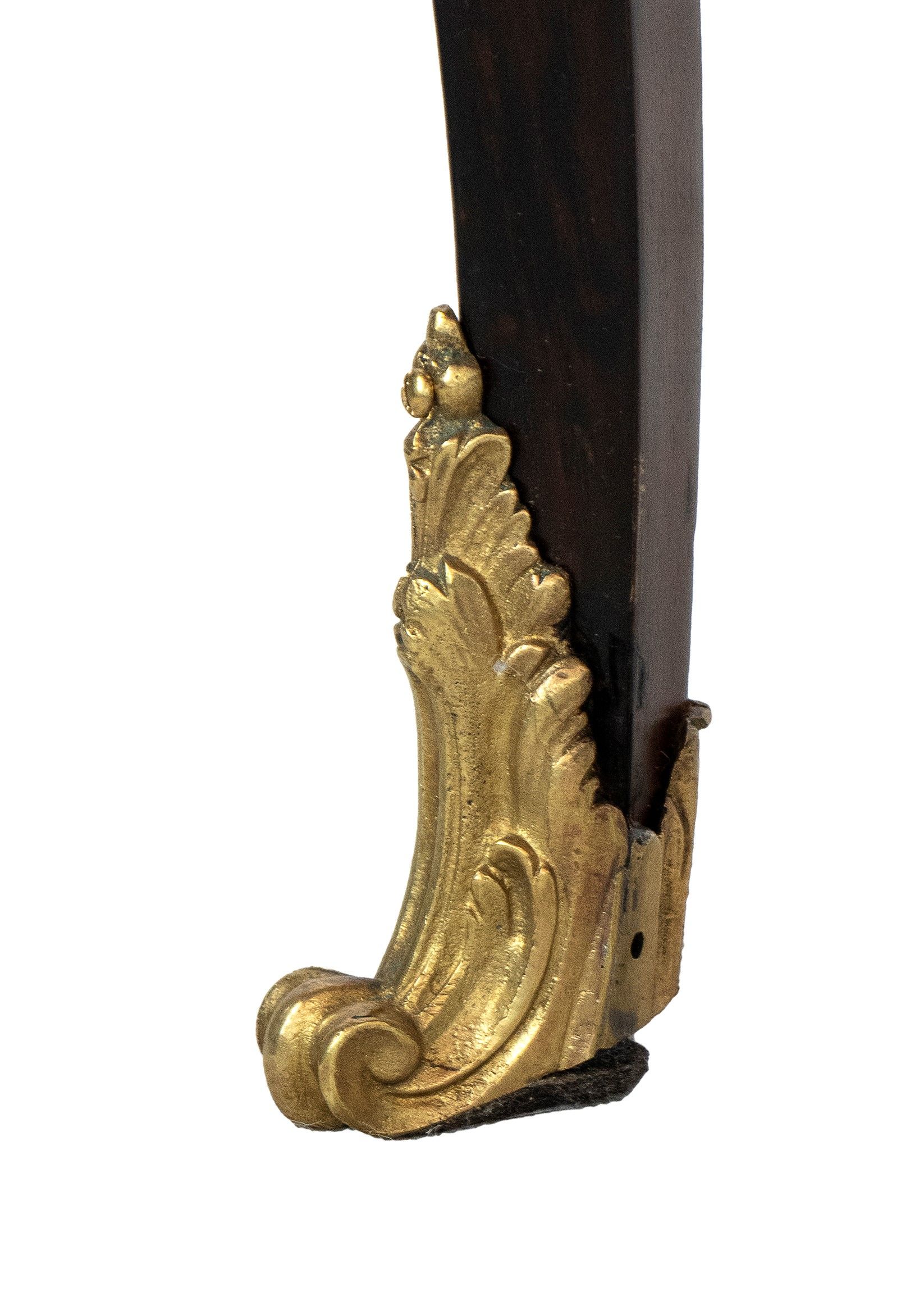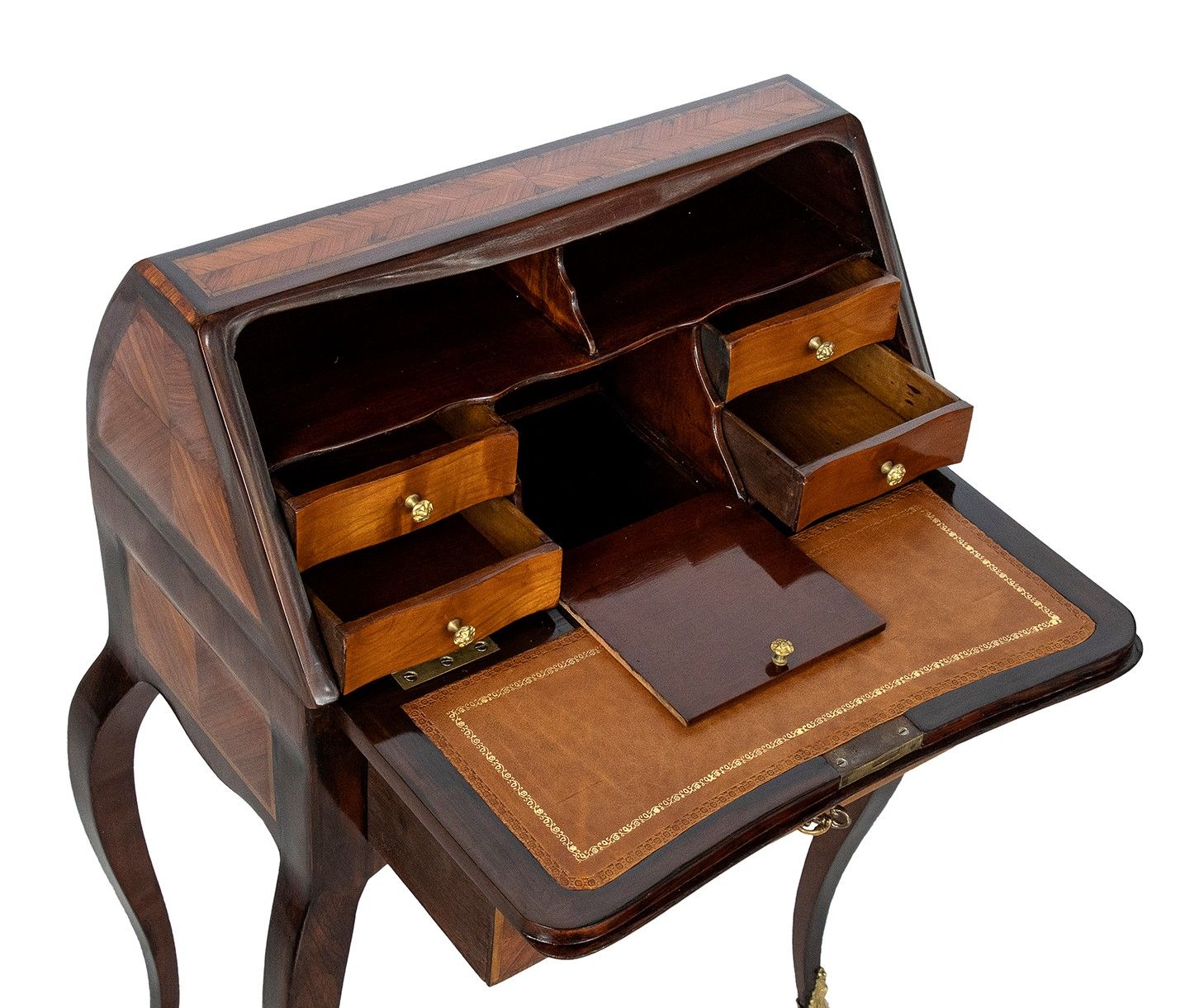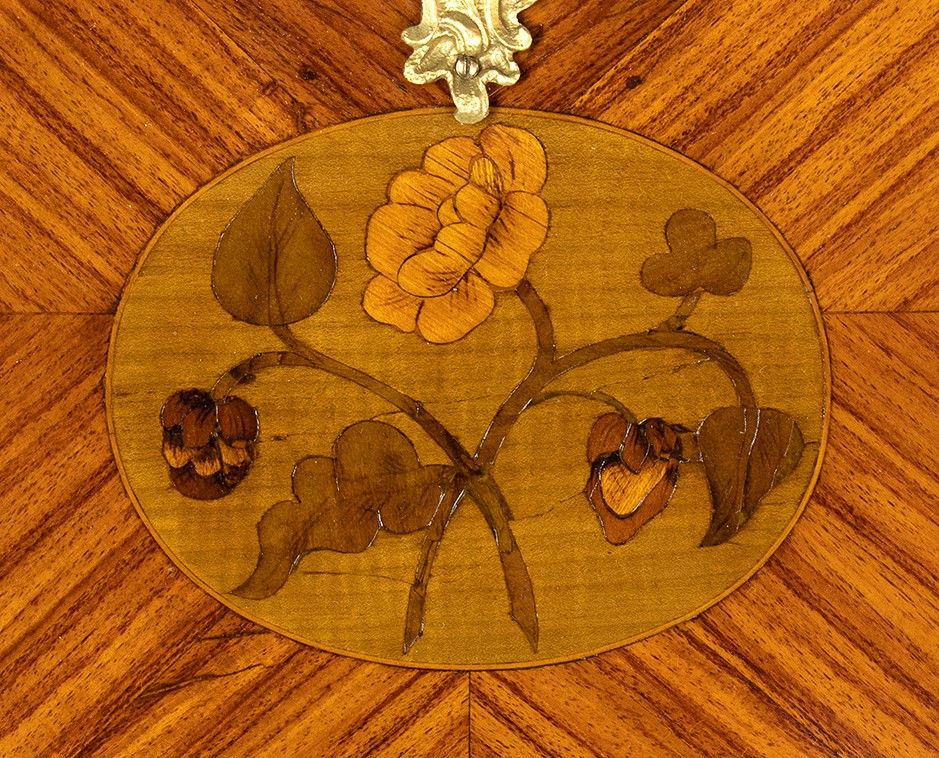nella rara forma di bauletto con gambe cabriolet, piano scrittoio con inserto in pelle, impreziosita da intarsi in legno di frutto e applicazioni in bronzo dorato.