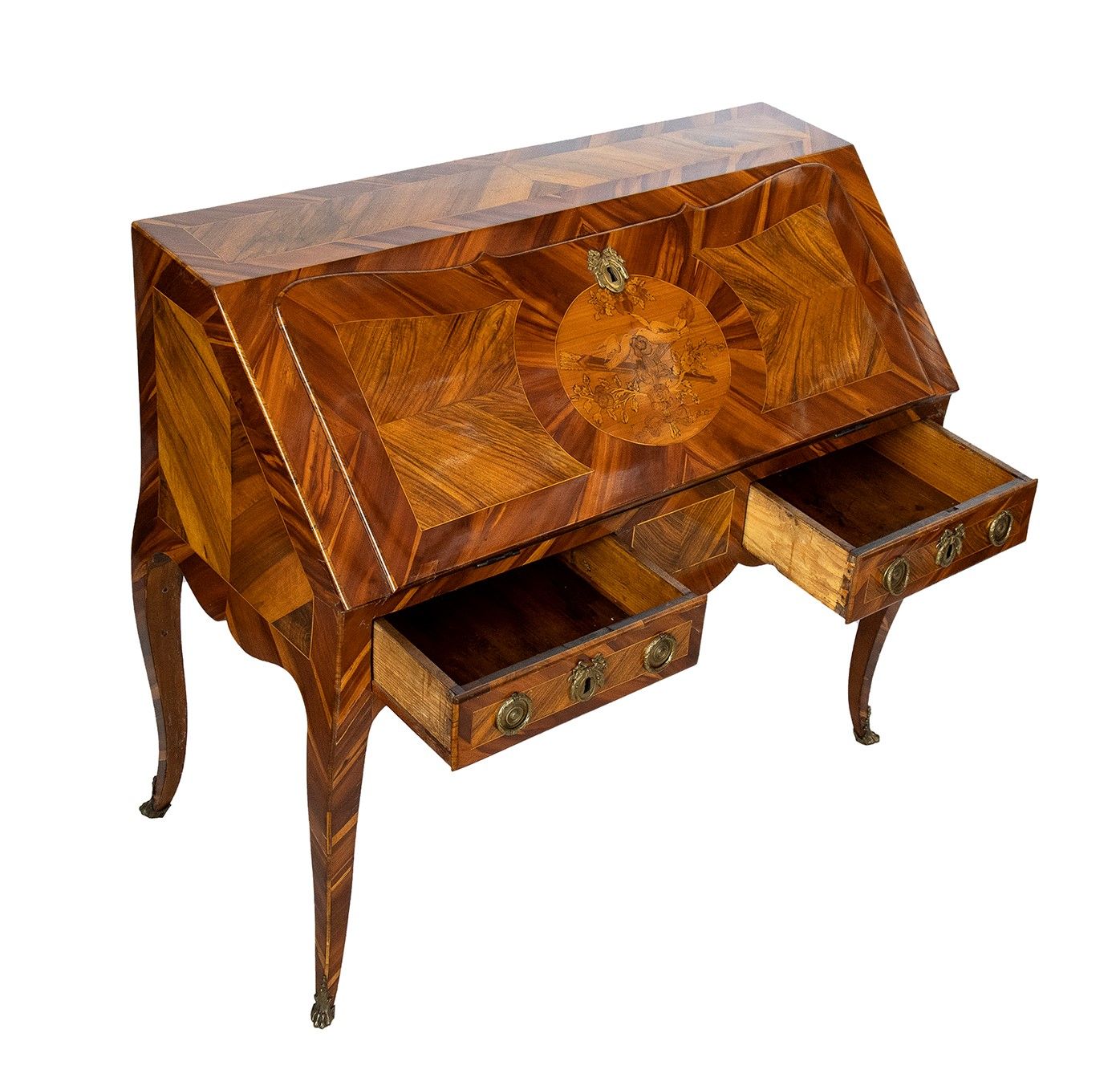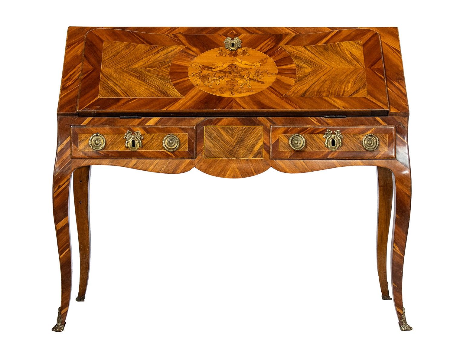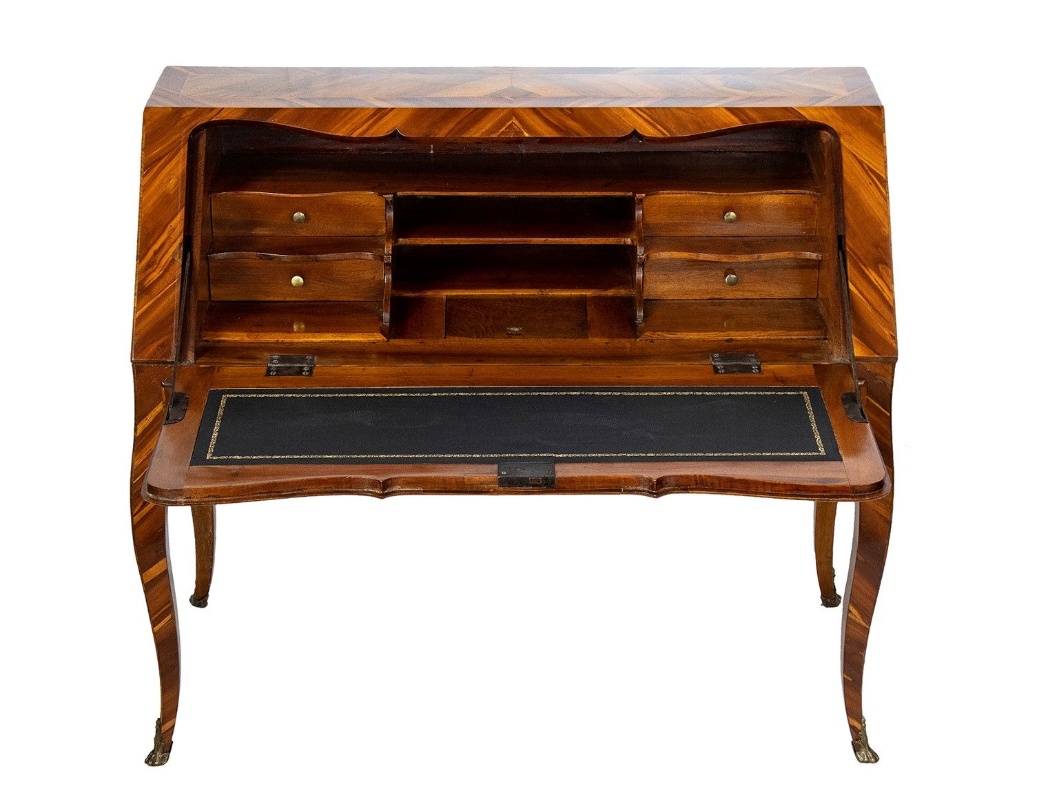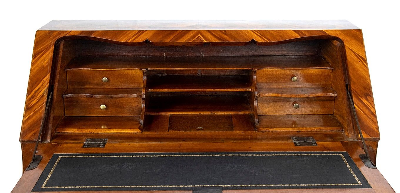 a tre casseti con gambe cabriolet, calatoia intarsiata con filettature in legno di bosso con scomparti a giorno ed pozzetto segreto, piano interno in pelle nera.
