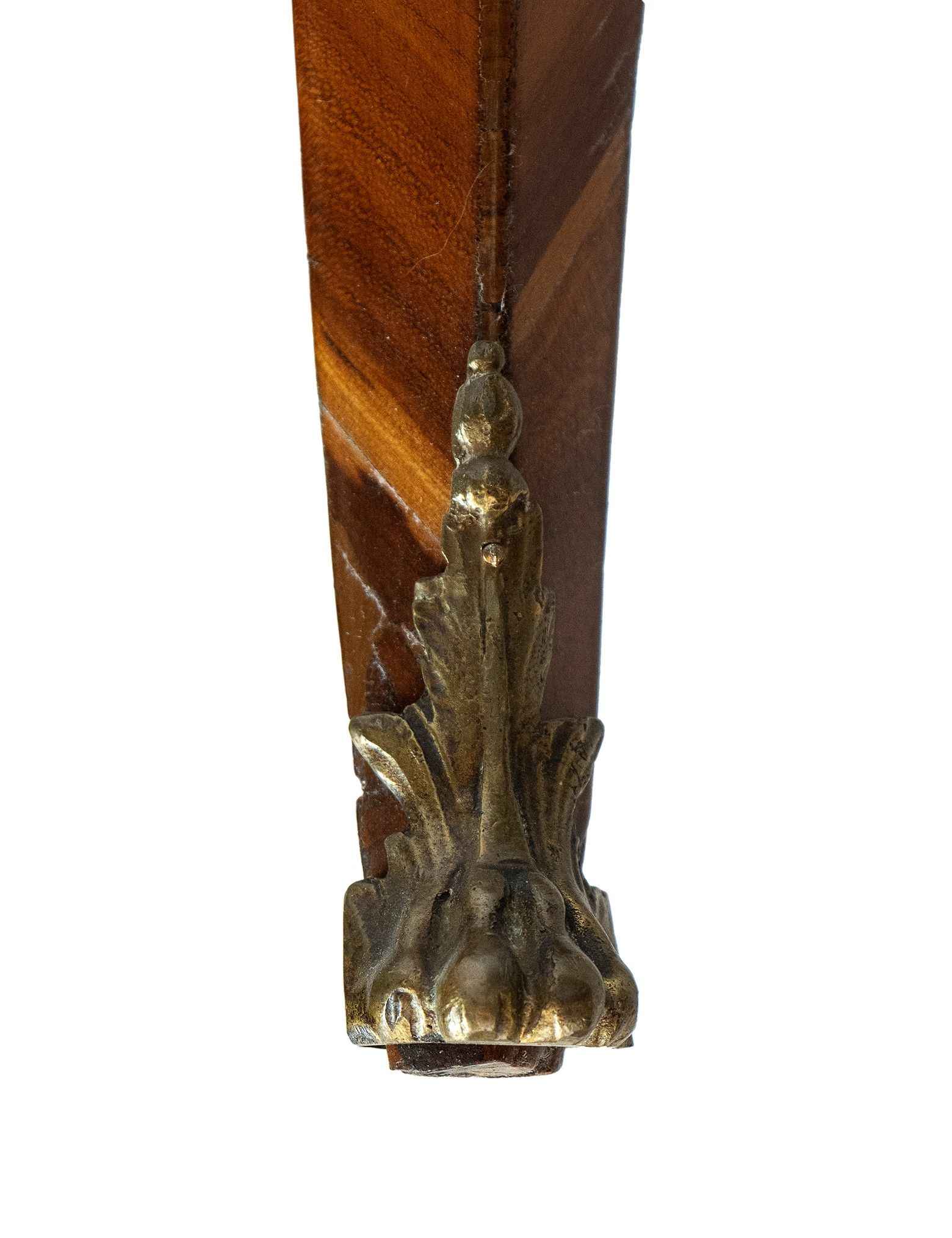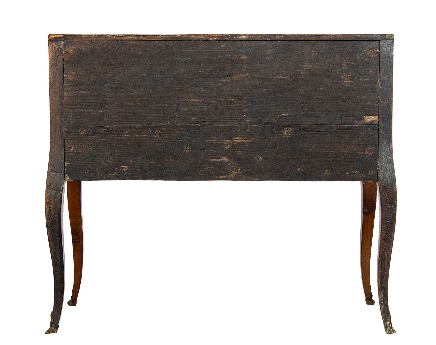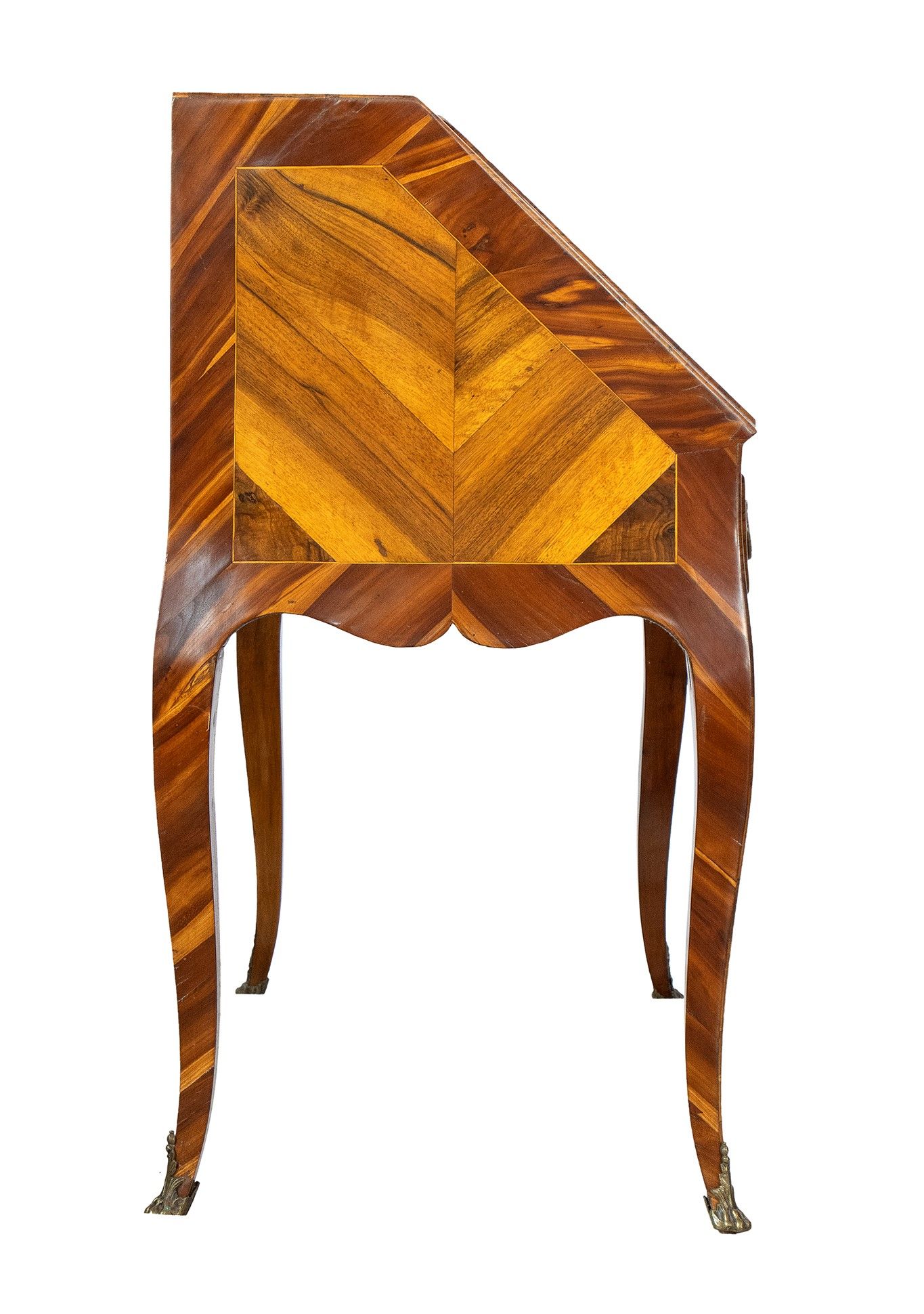a tre casseti con gambe cabriolet, calatoia intarsiata con filettature in legno di bosso con scomparti a giorno ed pozzetto segreto, piano interno in pelle nera.