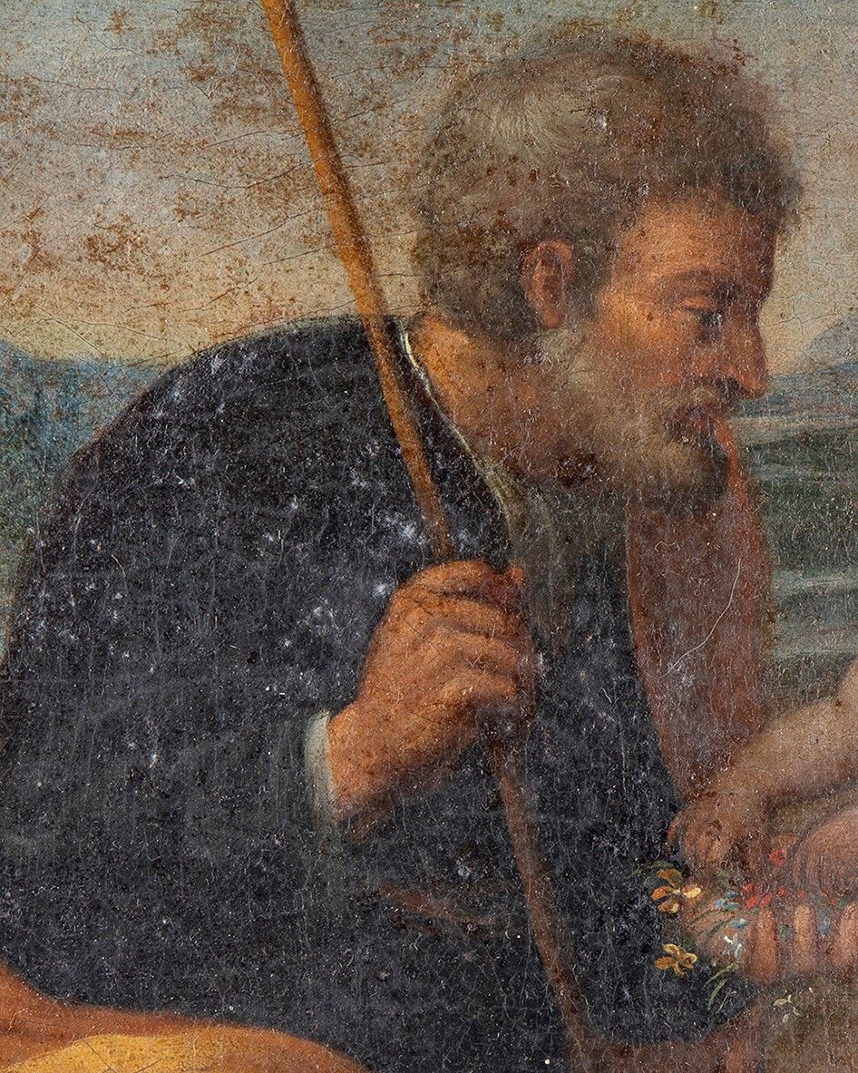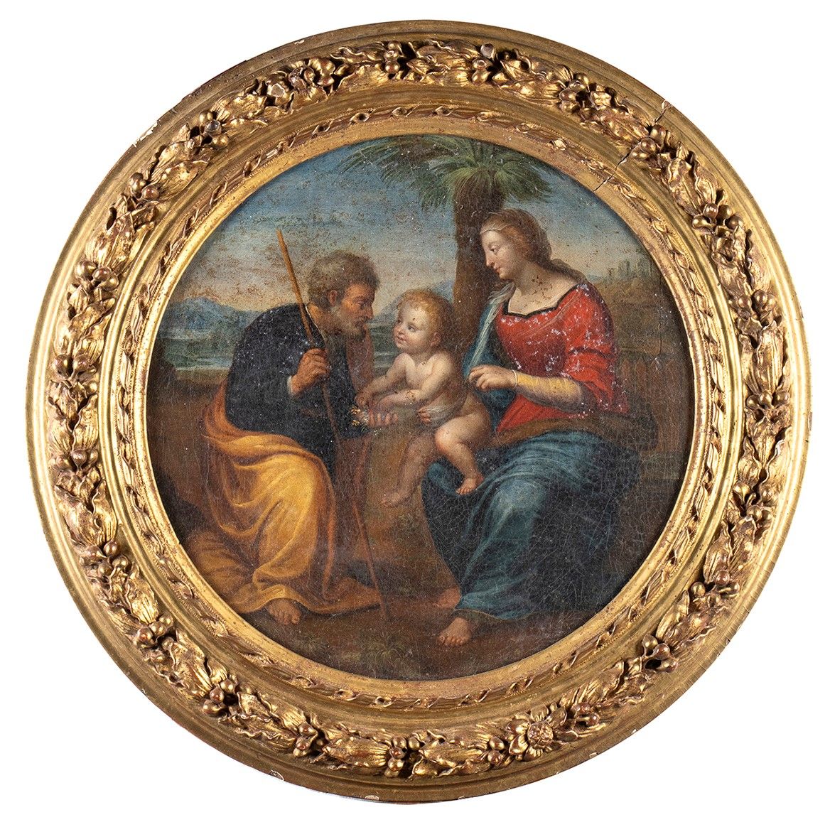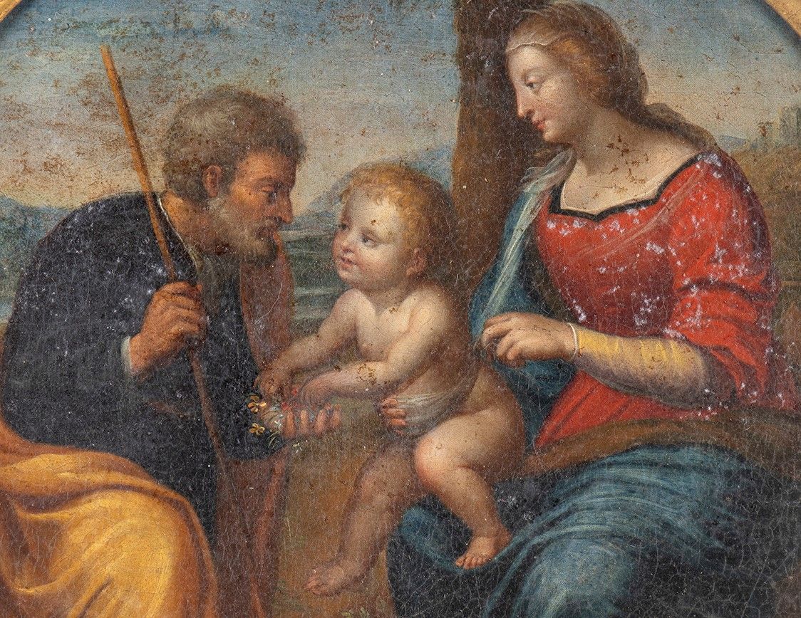 olio su tela, ispirata alla Sacra Famiglia con Palma di Raffaello, un dipinto a olio su tavola trasferita su tela (diam. 101,50 cm) di Raffaello Sanzio, databile al 1506 circa e conservato nella National Gallery of Scotland a Edimburgo. Diametro cornice: 59 cm. Diametro tela: 43 cm. Stato di conservazione: **** buono.