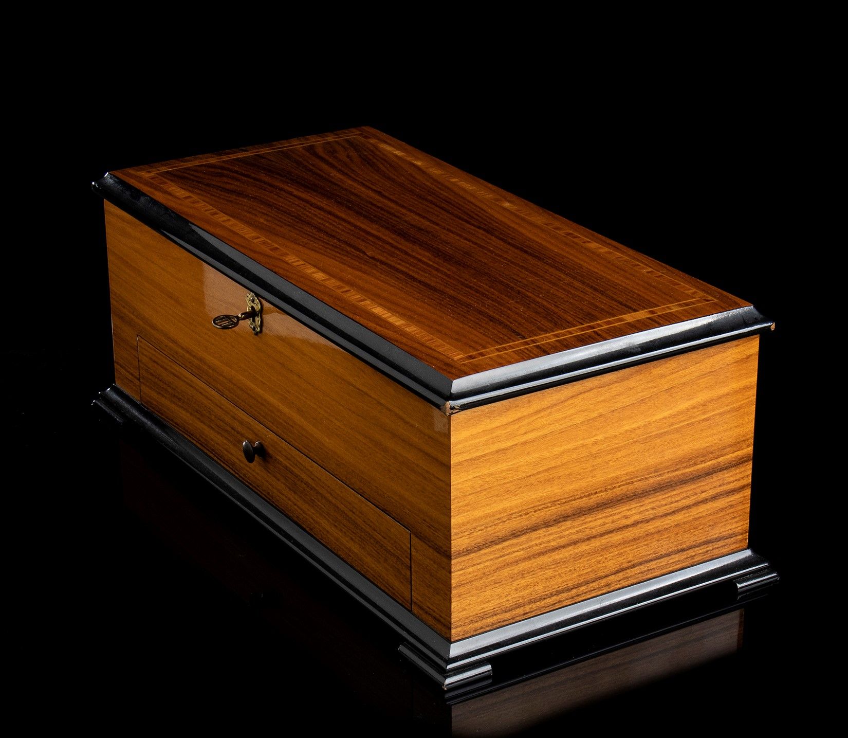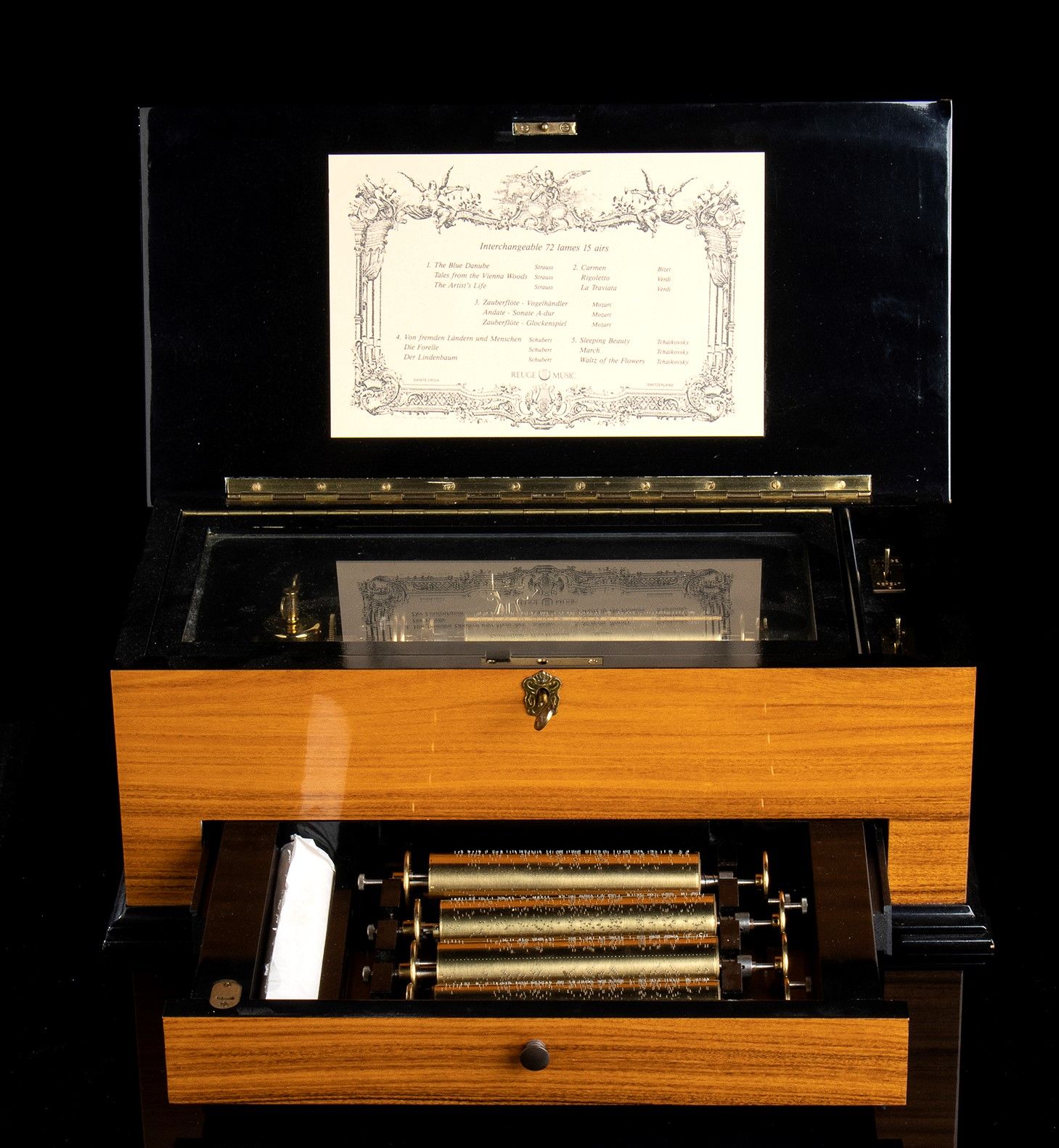 in legno di noce con intarsi in ebano viola. Il meccanismo è a cilindro, in ottone con pettine in acciaio a 72 denti e può suonare fino a 15 melodie mediante cinque cilindri intercambiabili; due leve di comando nella parte destra, una per il play/stop e l'altra per il cambio/ripetizione della melodia. Altezza x larghezza x profondità : 15 x 38,5 x 20 cm. Stato di conservazione: ***** eccellente, perfettamente funzionante.
