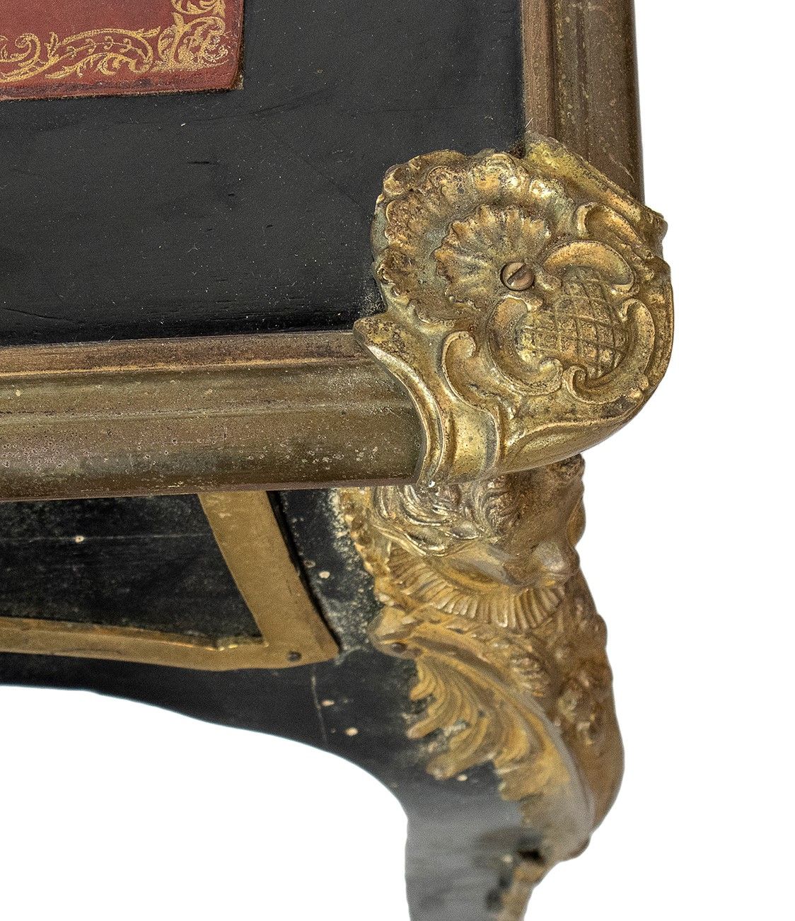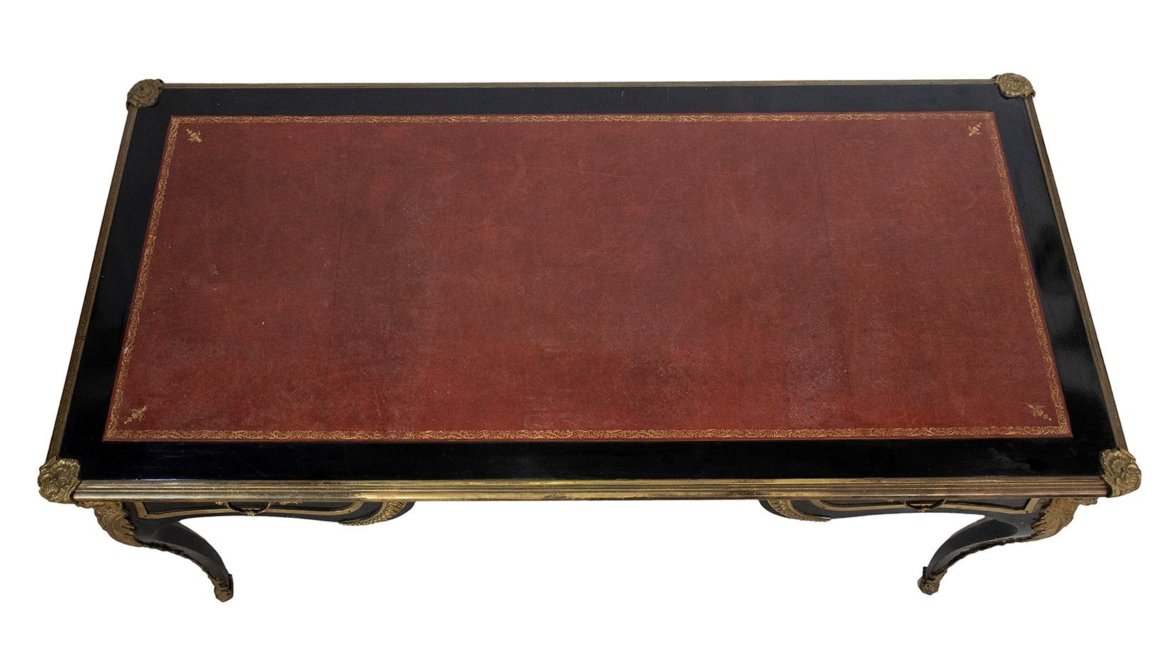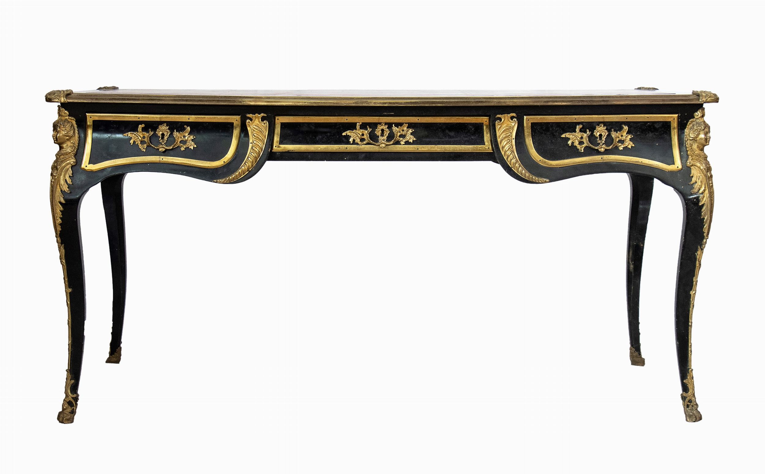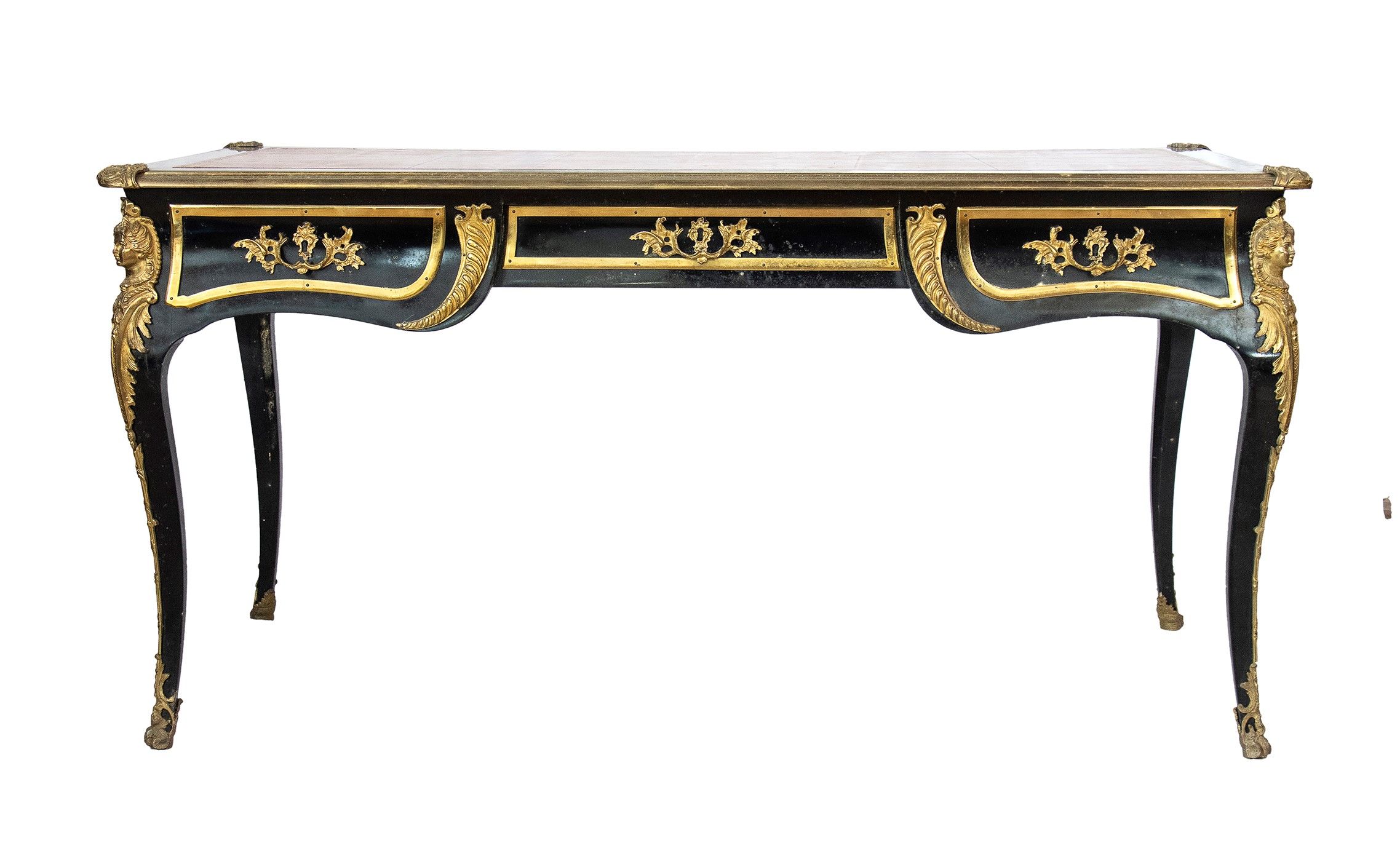 piano in pelle con marcature in oro, tre cassetti sul lato frontale evidenziati da cornici in bronzo, le gambe adornate da sculture in bronzo raffiguranti volti femminili,i piedi vengono chiusi da calzari in bronzo.