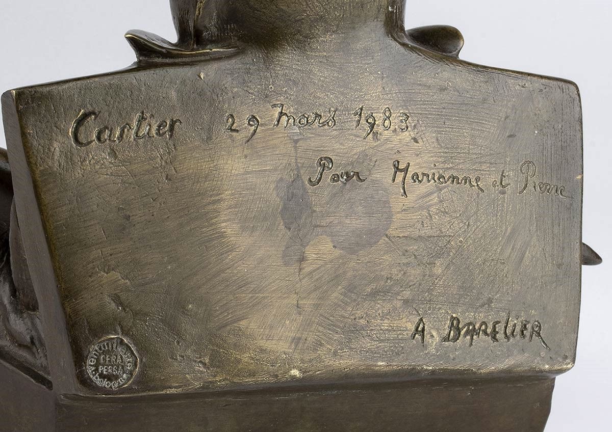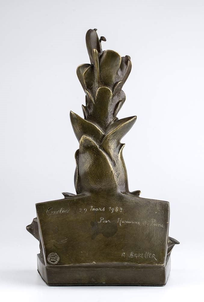 Andre Barelier, 1934-2021, ha studiato all'Accademia d'Arte di Marsiglia e all'Ecole des Beaux Arts di Parigi. Questa scultura in bronzo è la rappresentazione di un premio Cartier del 1985: da uno scrigno emerge una divinità femminile da cui si dipartono foglie, fiori e frutti.Sul retro in alto Cartier 29 mars 1983, pour marianne et pierre. Firmata in basso a destra A. Barelier; sulla sinistra il marchio della fonderia.