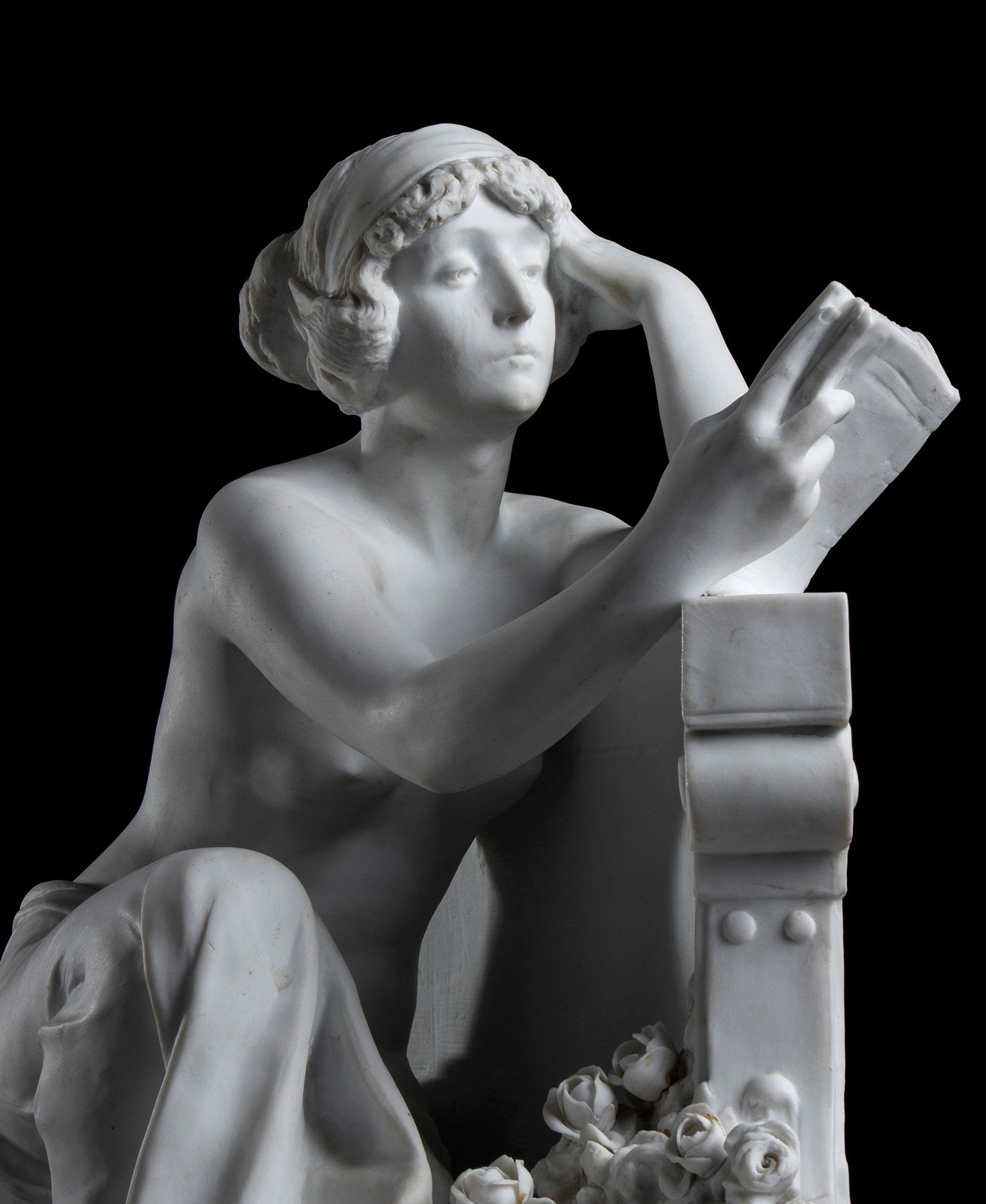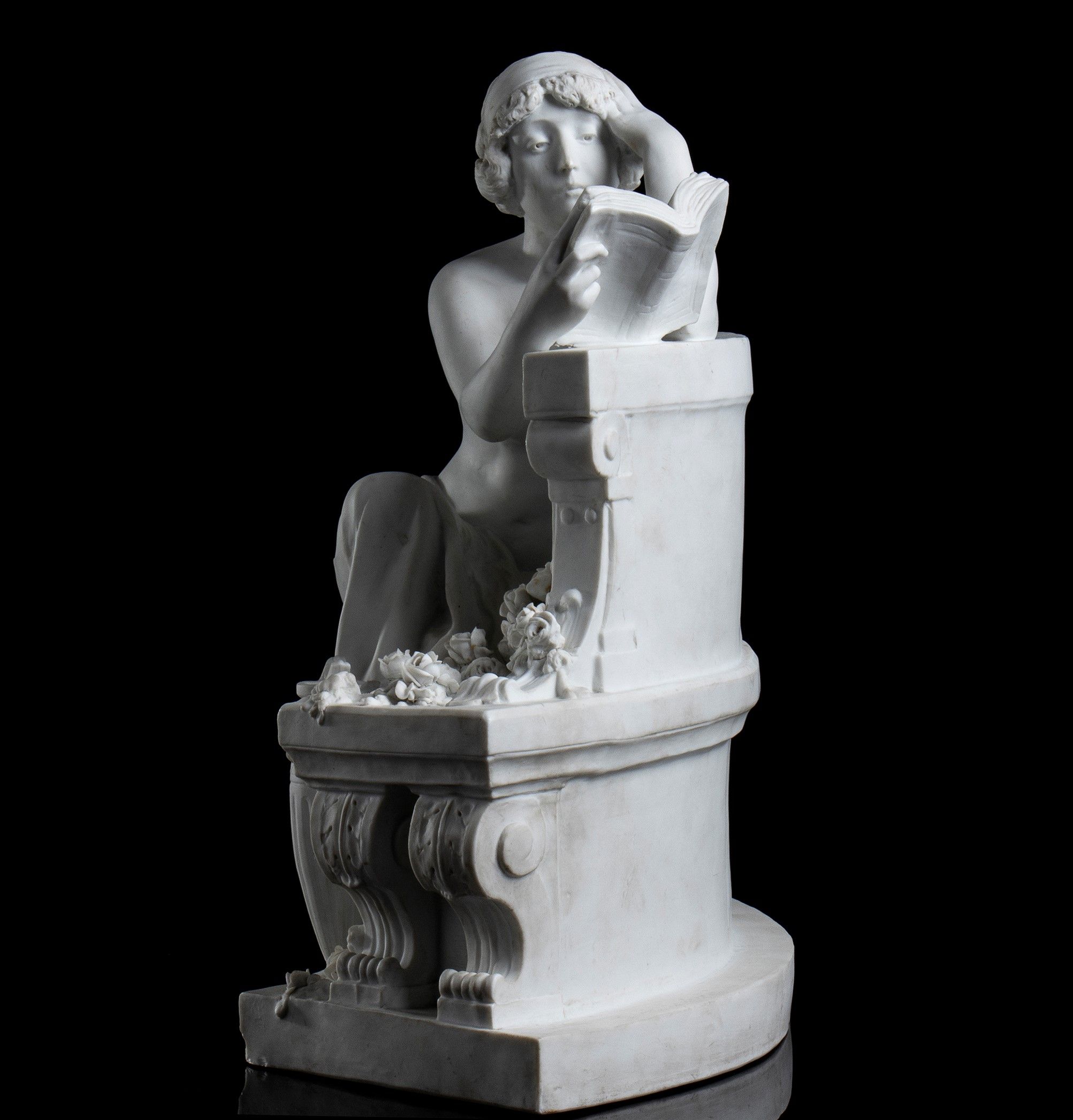 “Giovane donna che legge”, in posa di lettura, su panca curva realizzata e firma nella parte posterioreAltezza x larghezza x profondità: 44 x 49 x 22 cm.