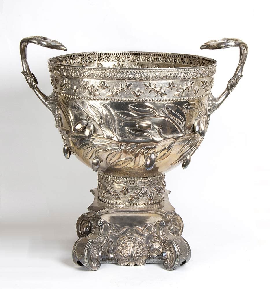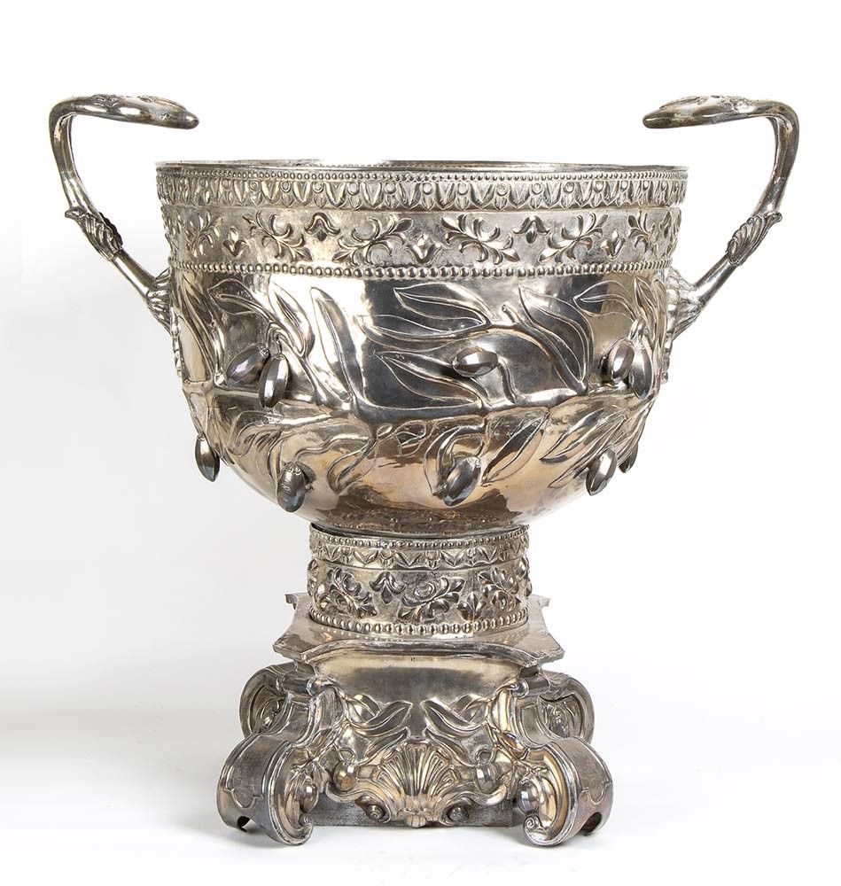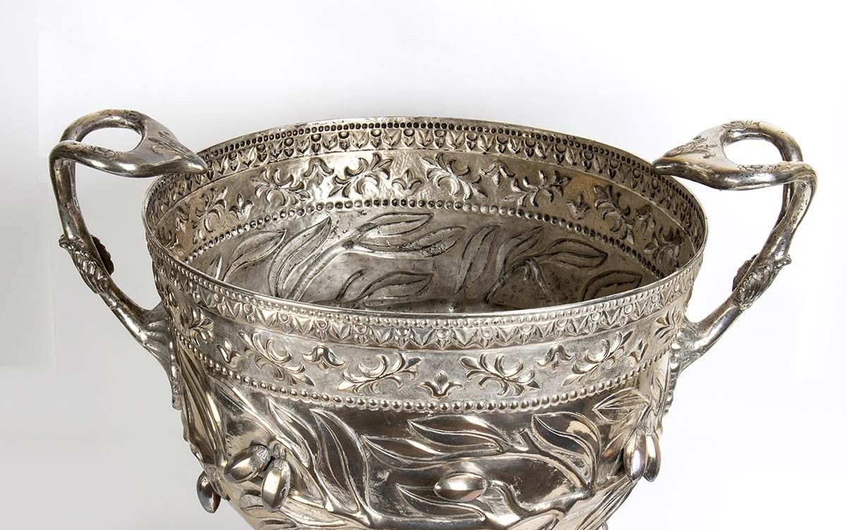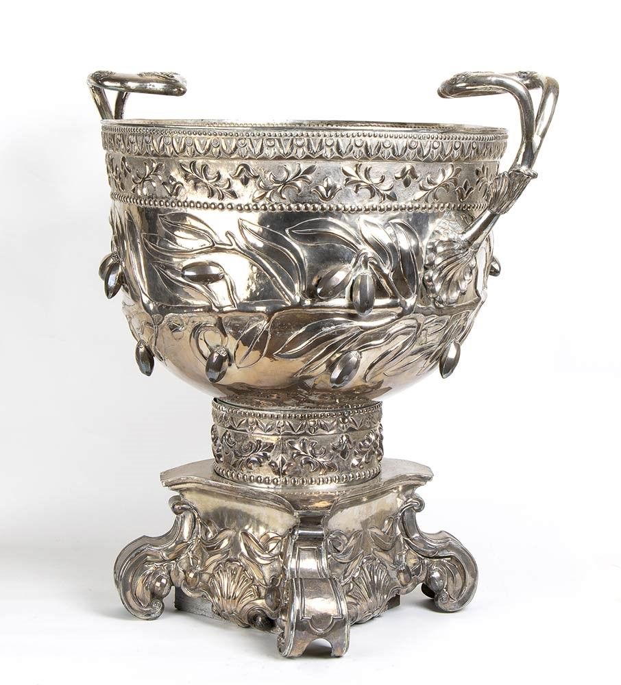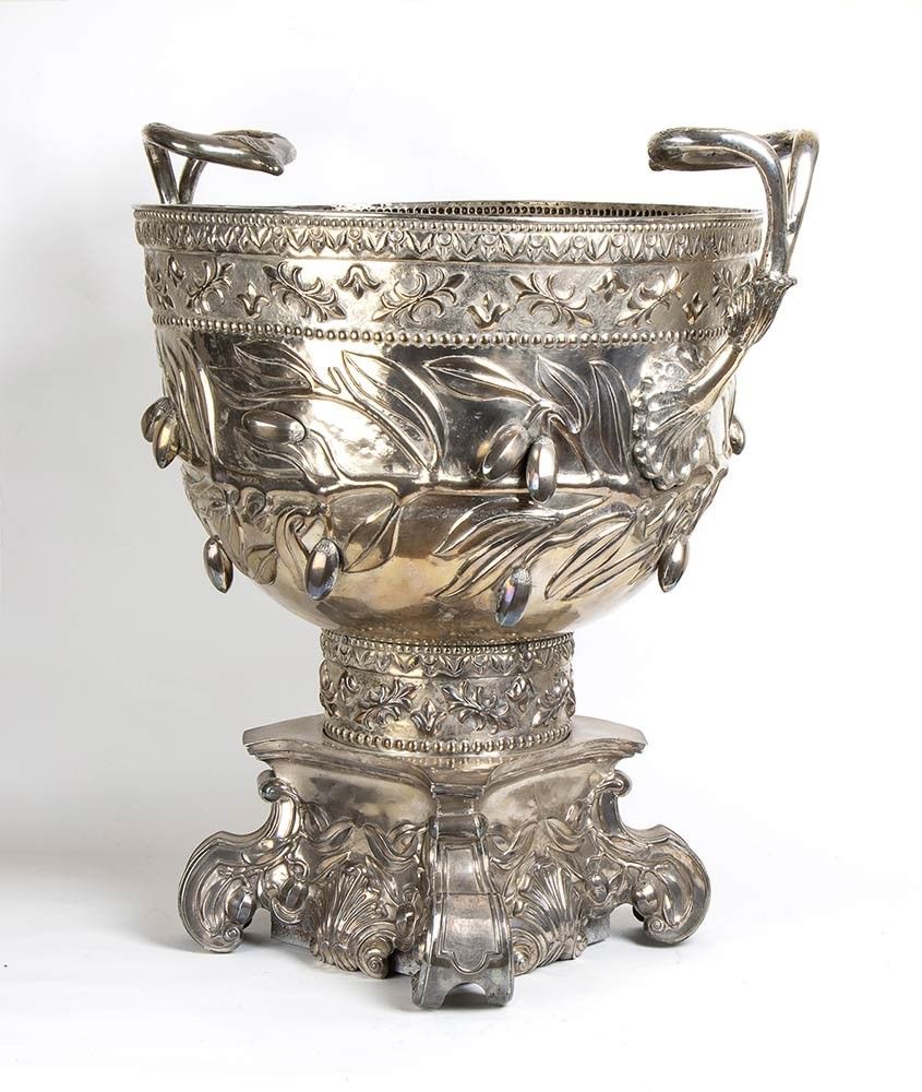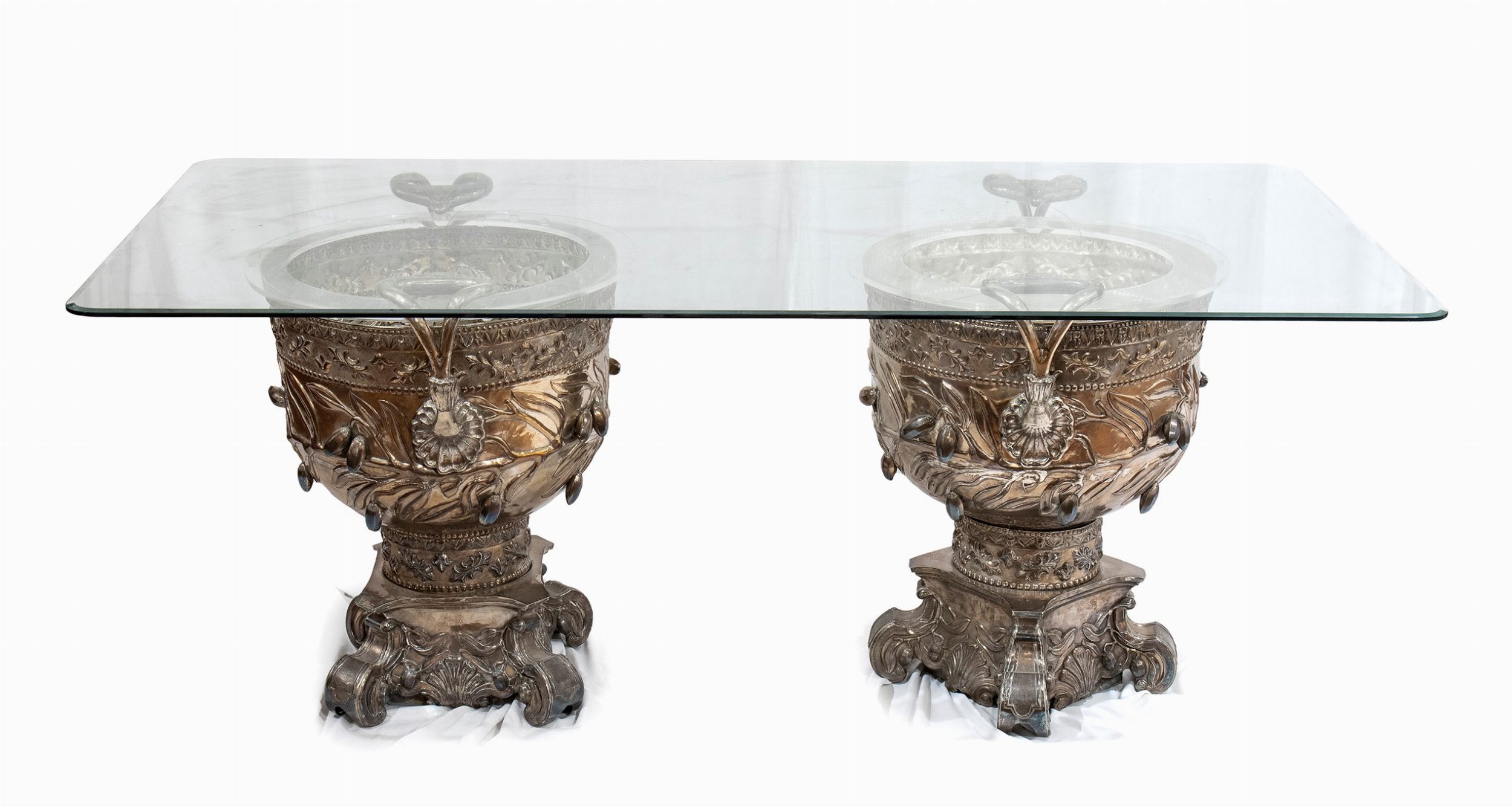 piano in cristallo moderno, vasi di linea classicheggiante, interamente sbalzati e cesellati con rami d'ulivo e poggianti su un basamento con quattro piedi a doppia voluta intervallati da conchiglie. Argento 925/1000. Basamento con anima lignea. Dimensioni piano: 193 x 99,5 x 1 Altezza 79 cm, diametro 59 cm, larghezza con manici 80 cm. Pesi lordi: 18,1 kg e 19,6 kg. Stato di coservazione: **** buono.