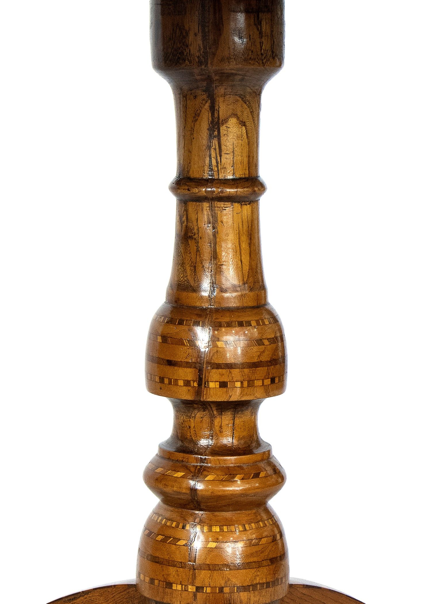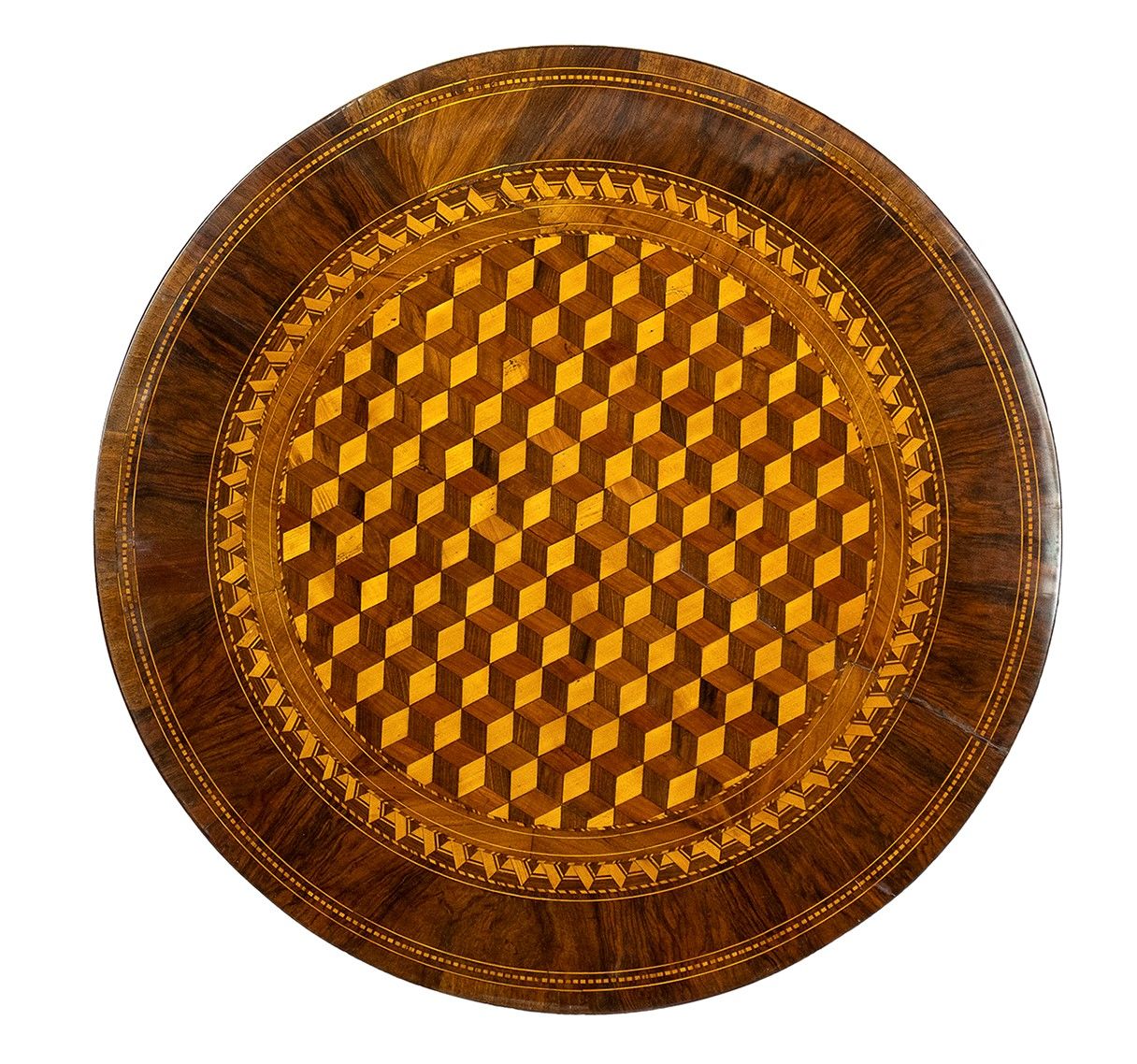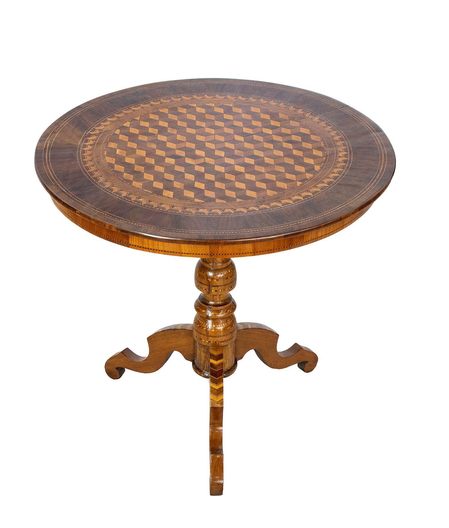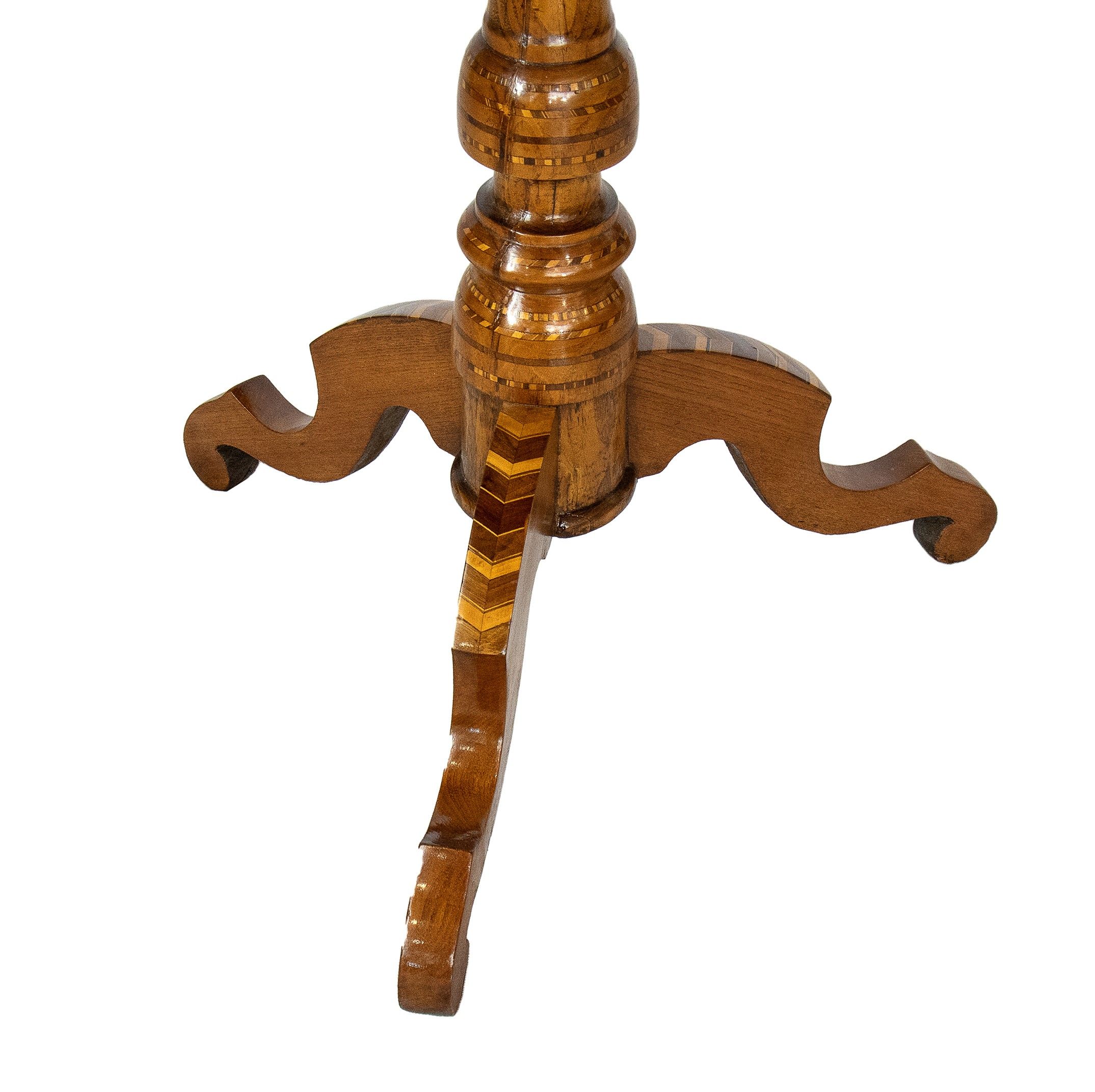 struttura ed intarsi in legno di noce e bosso. L'intarsio sul piano è a figure geometriche, gamba tripode intarsiata sui piedi.