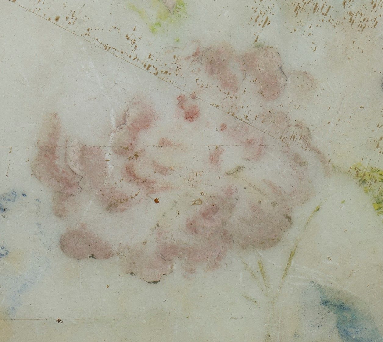 di forma ovale con bordo perimetrale a decori vegetali; il piano in marmo, dipinto in policromia con fiori e nastri, è protetto da una lastra di vetro. Altezza x larghezza x profondità : 8 x 63 x 47 cm. Stato di conservazione: **** buono.