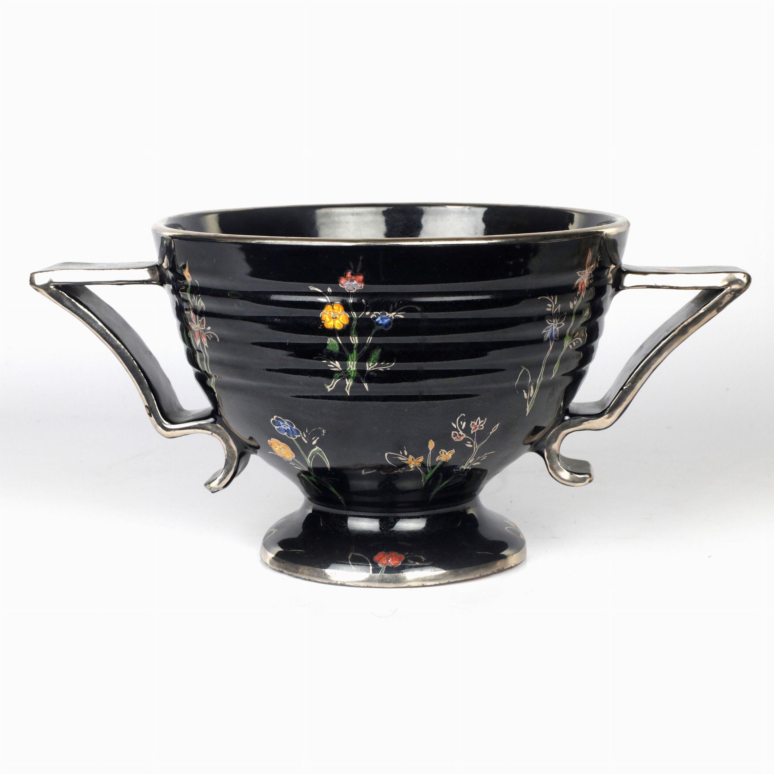 1938/1943 con decoro a fiorellini e finiture in platino, corpo della coppa a costoloni orizzontali. Manifattura Alfredo Santarelli Gualdo Tadino
