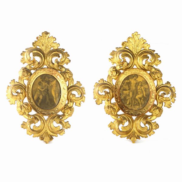 XIX secolo con scene del paradiso, entro cornici in legno dorato ovali scolpite ed incise a volute e motivi vegetali