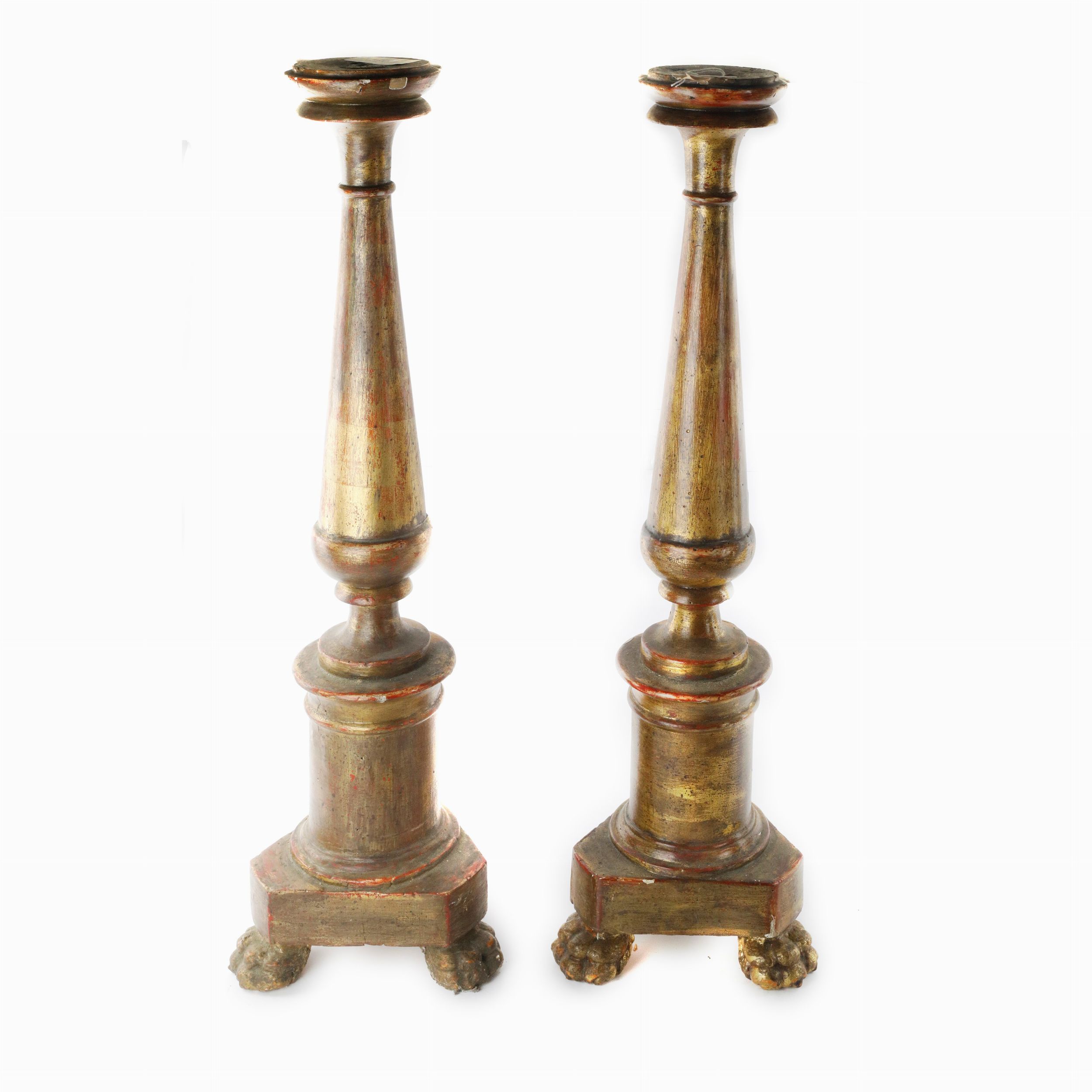 prima metà XIX secolo corpo a balaustro con base triangolare e piede d'appoggio ferini, dorature usurate e mancanti di gorgiera.