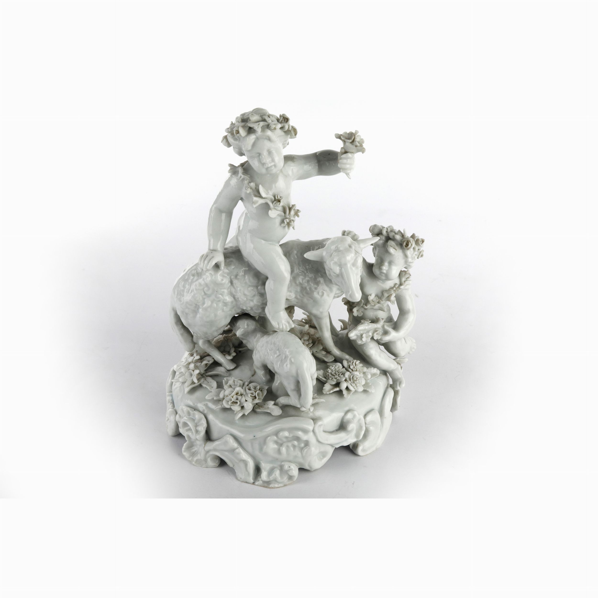 prima metà XX secolo putti con pecore , marca n coronata in blu sottosmalto, manifattura francese.