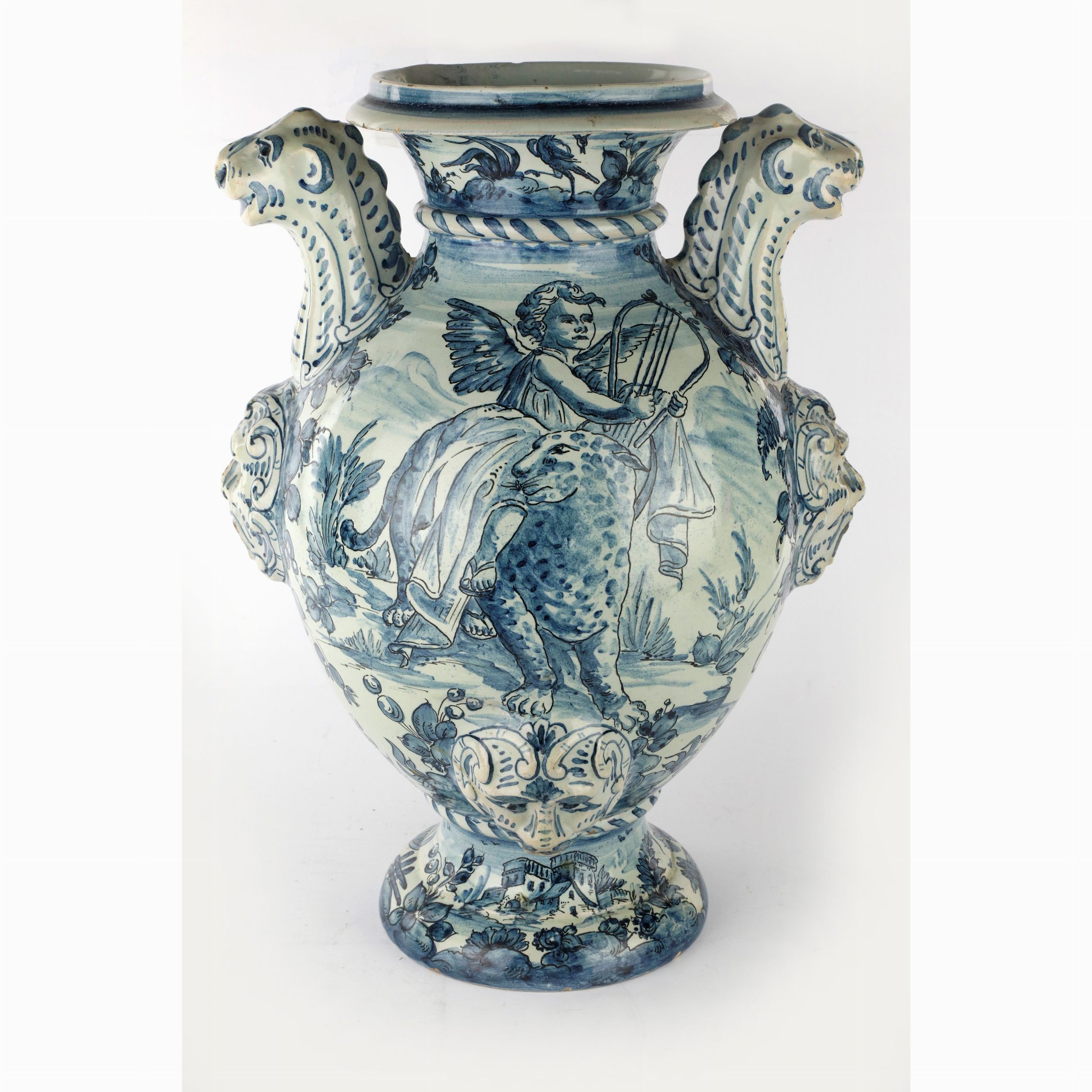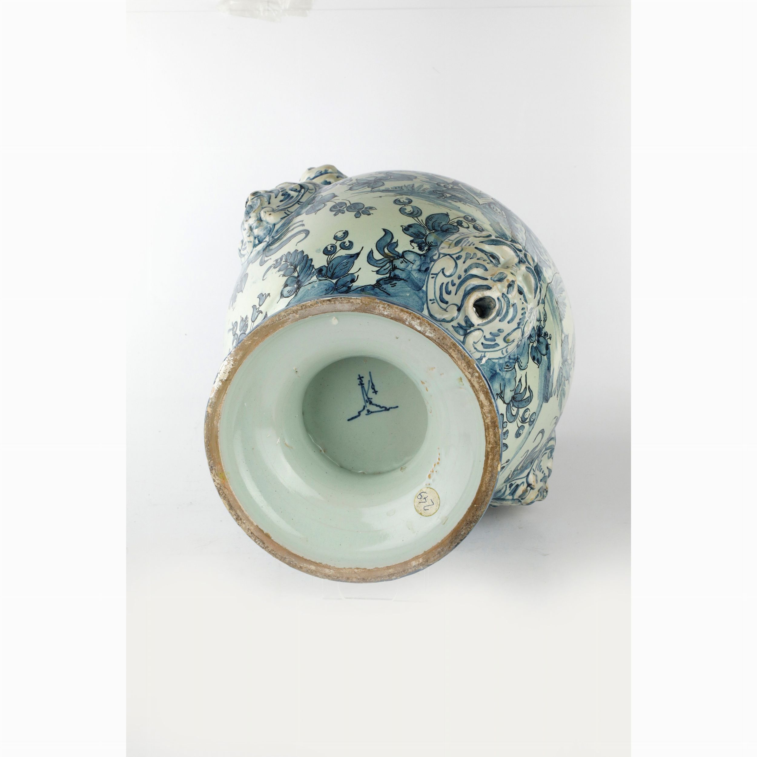 inizio XX secolo decoro in bleu su fondo bianco , anse a protome leonine , mascherone sulla pancia per la fuoriuscita dei liquidi. Marca sotto la base di Savona