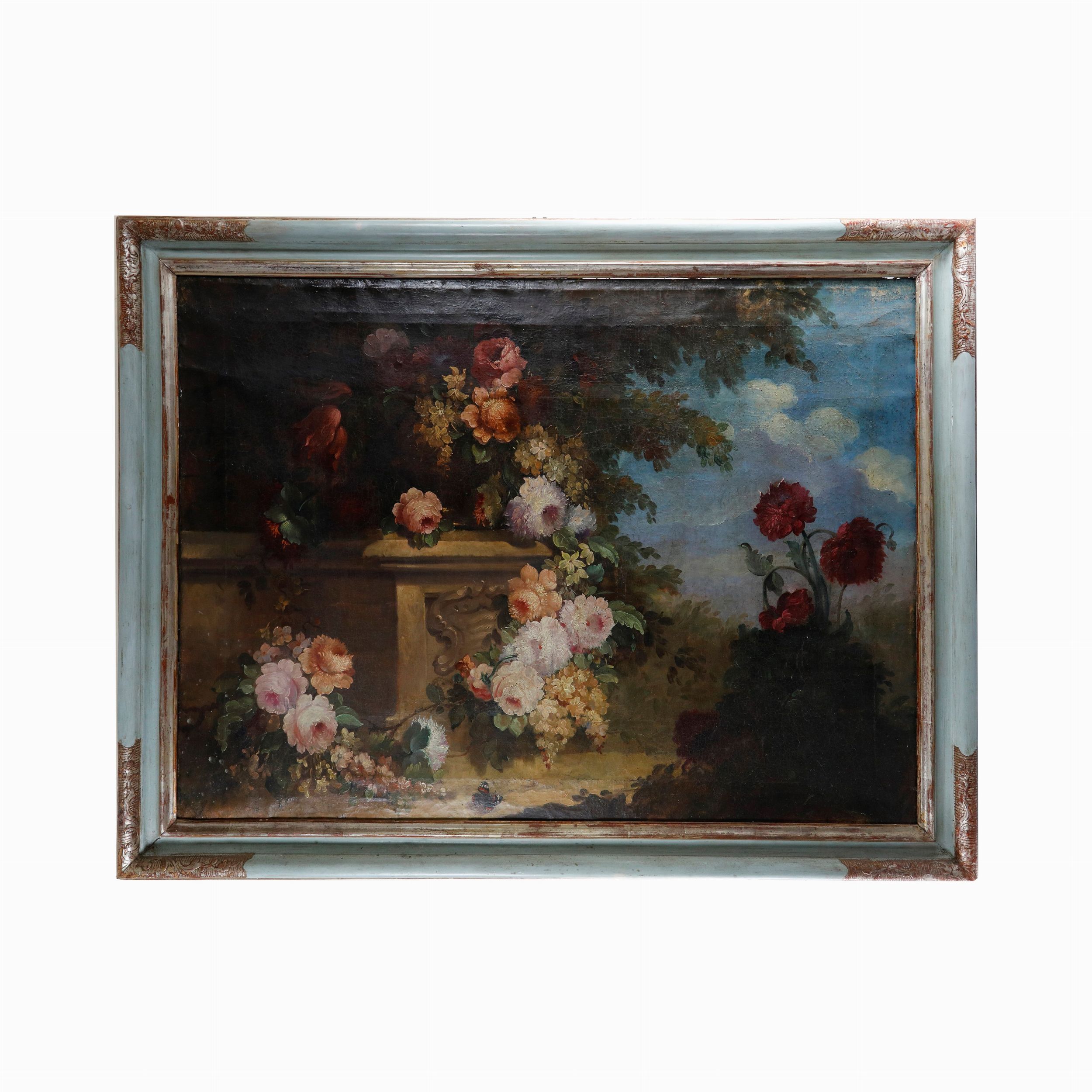 Natura silente con fiori e paesaggio