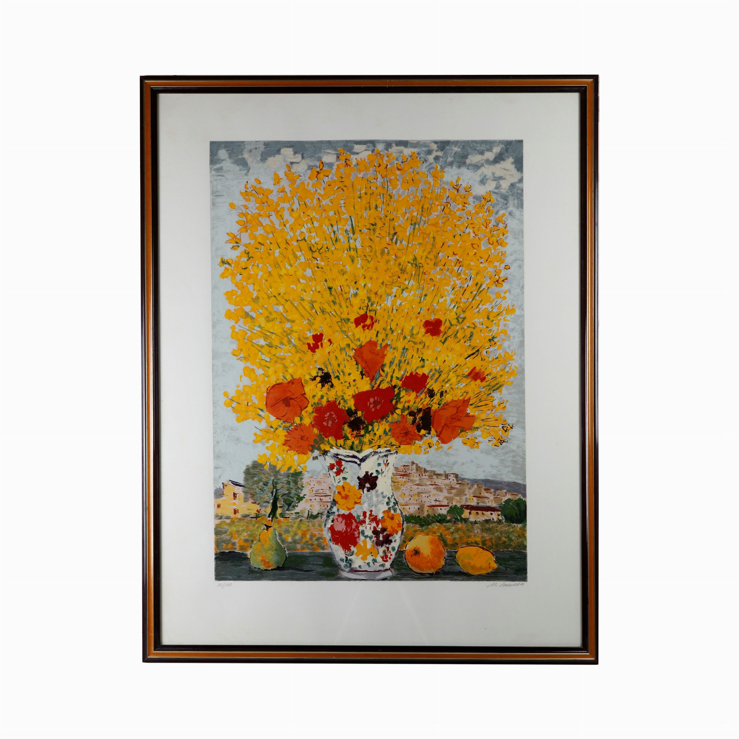 Scorcio di paese con mazzo di fiori, multiplo su carta