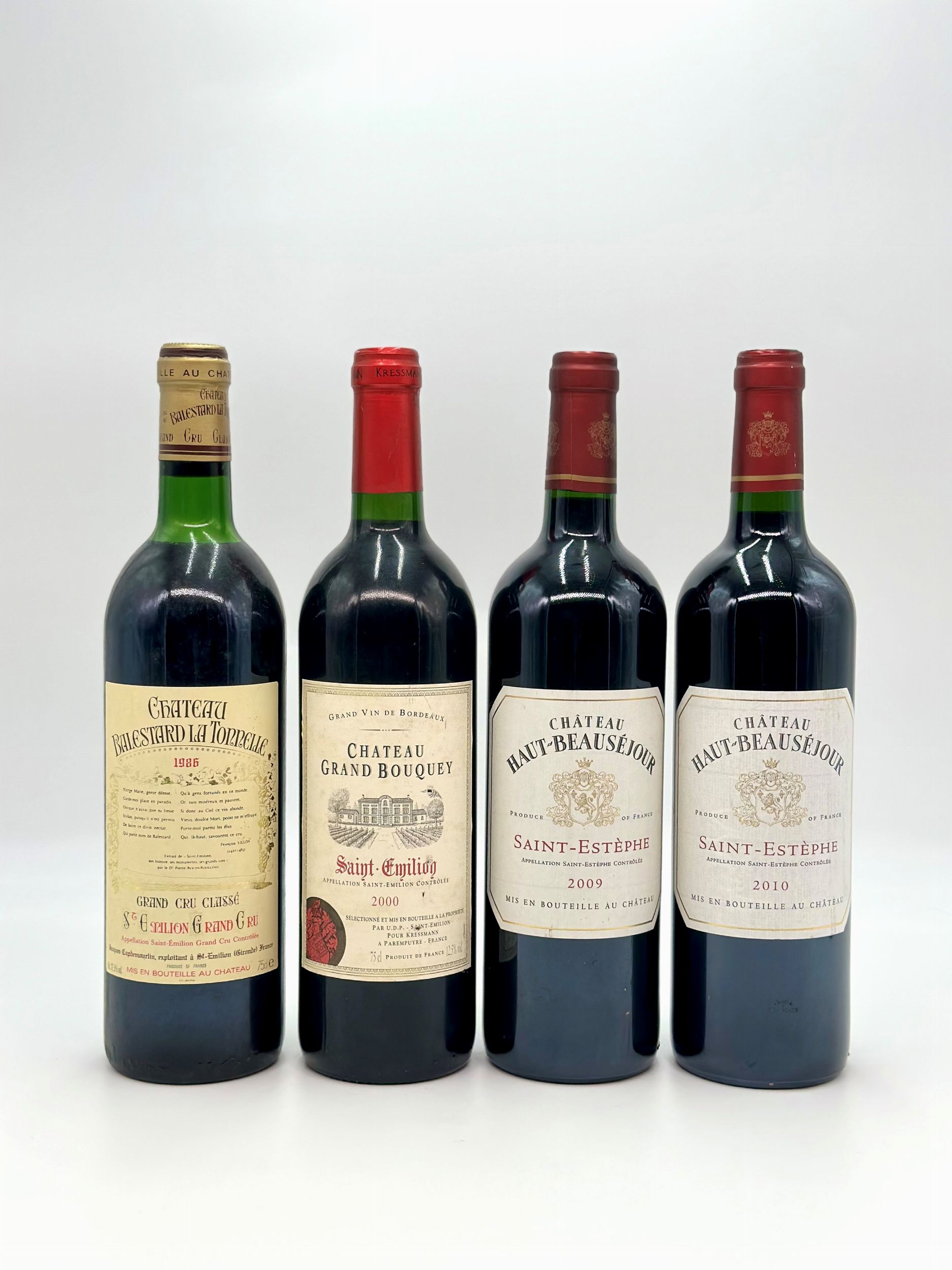 2000 a) Francia, Saint-Emilion - 1 bottiglia (bt), annata 1986.Livello: sommità della spalla (TS), livello normale per i vini di oltre 15 anni d'età .Condition report: etichetta e capsula in buone condizioni.b) Francia, Saint-Emilion - 1 bottiglia (bt), annata 2000.Livello: collo inferiore (BN), nella norma per i vini di qualsiasi età .Condition report: etichetta con leggeri segni d'usura e capsula in buone condizioni.c) Francia, Saint-Estèphe - 1 bottiglia (bt), annata 2009.Livello: entro il collo (WN), è il livello di colmatura standard.Condition report: etichetta e capsula in buone condizioni.d) Francia, Saint-Estèphe - 1 bottiglia (bt), annata 2010.Livello: entro il collo (WN), è il livello di colmatura standard.Condition report: etichetta e capsula in buone condizioni.