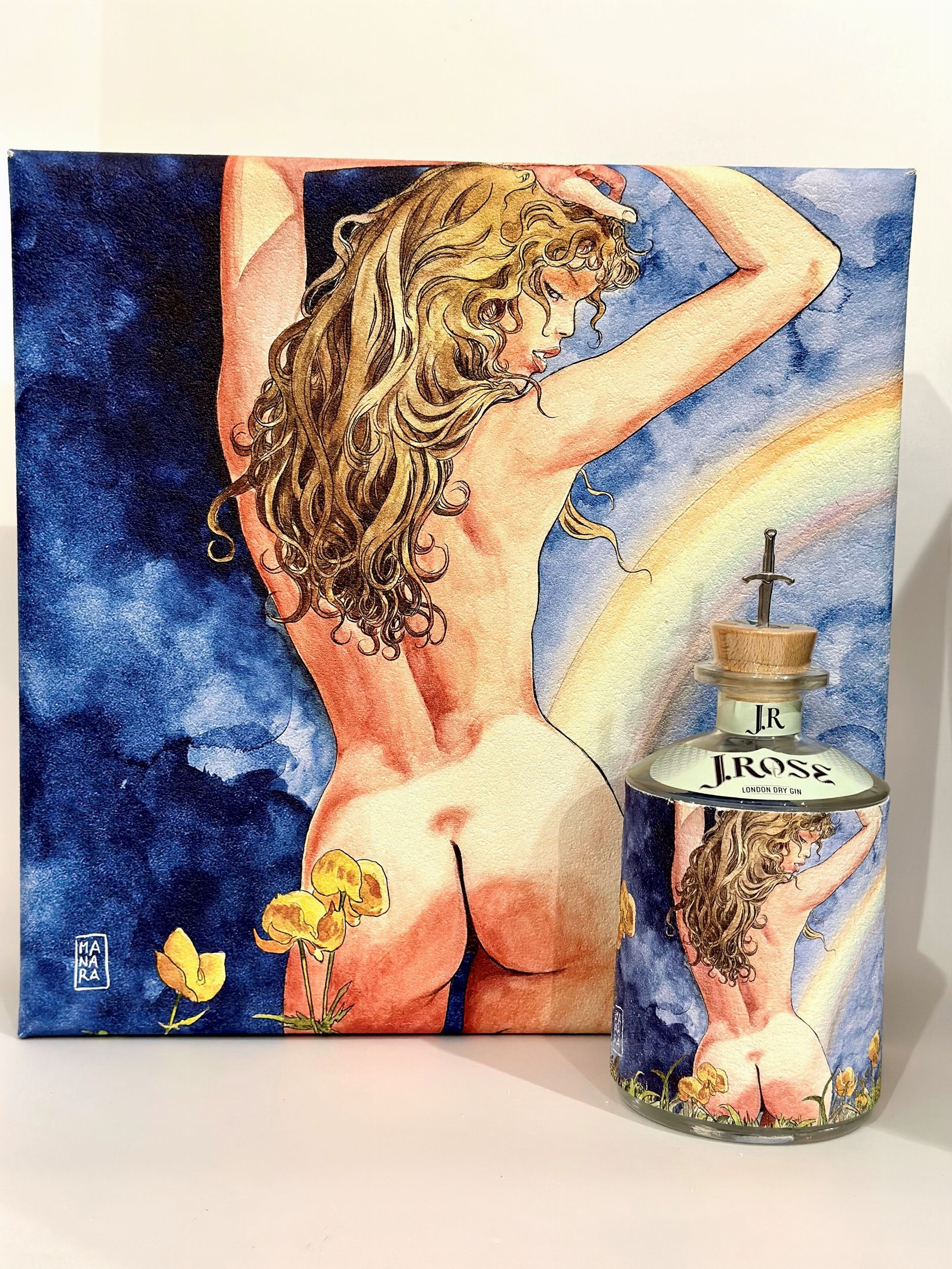 Italia, Gin 75 cl. - 43% vol.Livello: entro il collo (WN).Confezione: scatola originale (OC).Condition report: etichetta e capsula in perfette condizioni.Note: lotto comprensivo di 2 bicchieri, la scatola diventa un opera di Milo Manara.