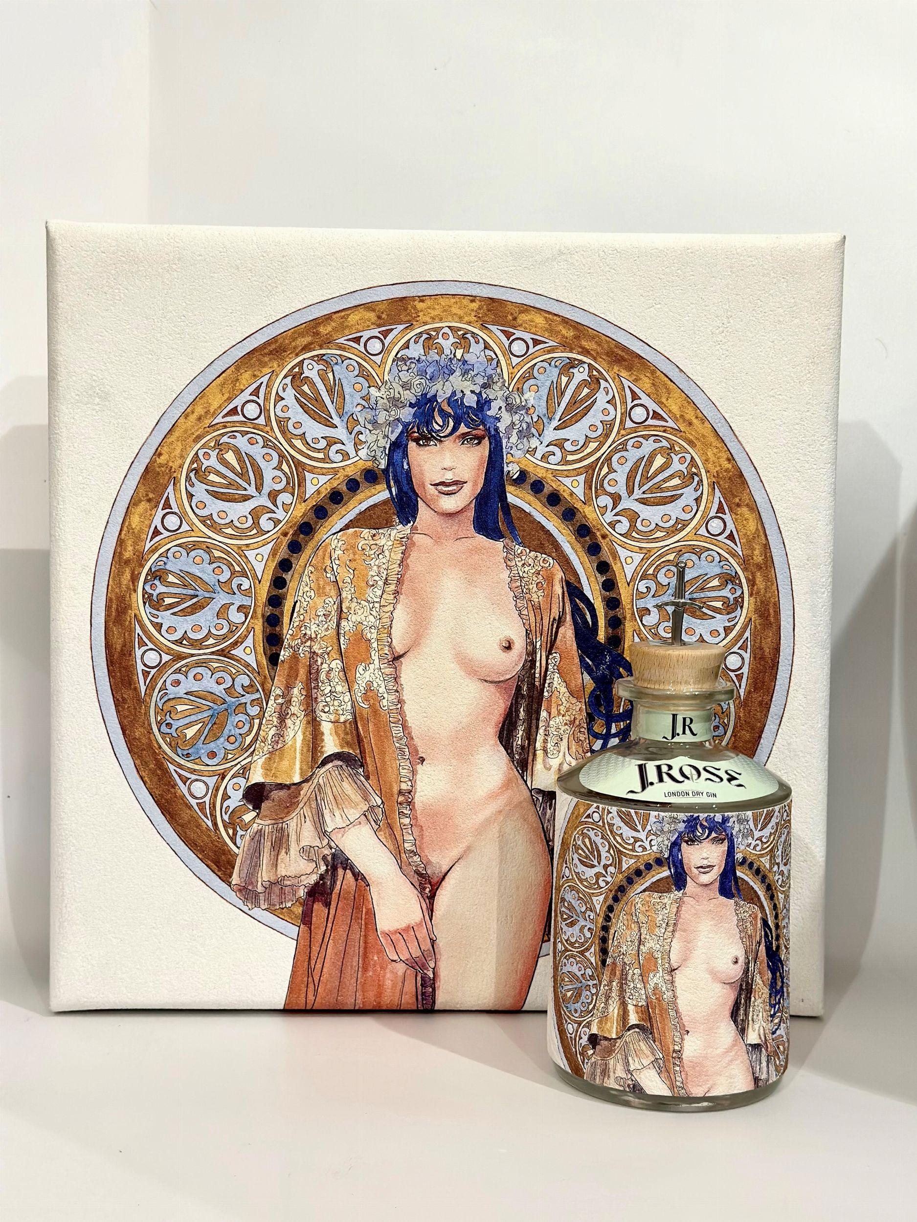 Italia, Gin 75 cl. - 43% vol.Livello: entro il collo (WN).Confezione: scatola originale (OC).Condition report: etichetta e capsula in perfette condizioni.Note: lotto comprensivo di 2 bicchieri, la scatola diventa un opera di Milo Manara.