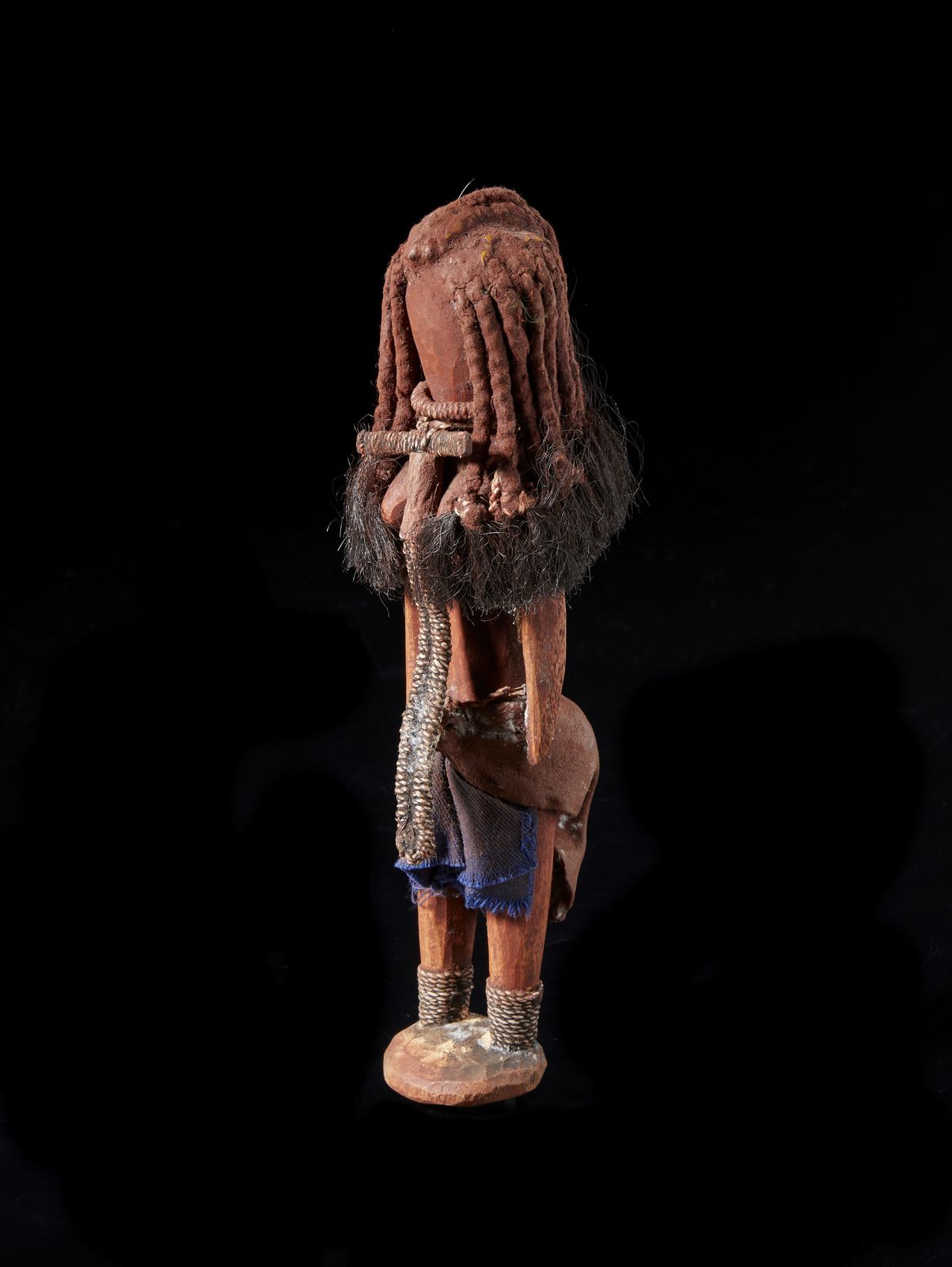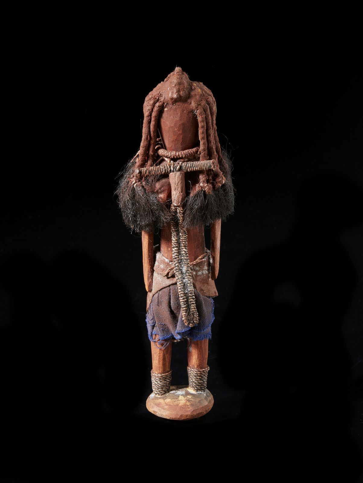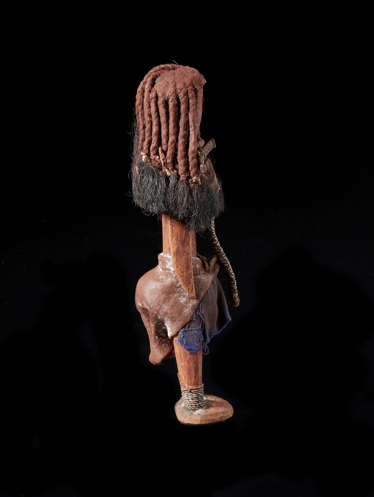 Bambola antropomorfa. Legno, fibre, tessuto, pelle e pigmento rosso.