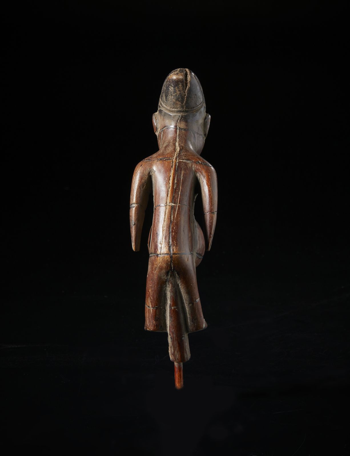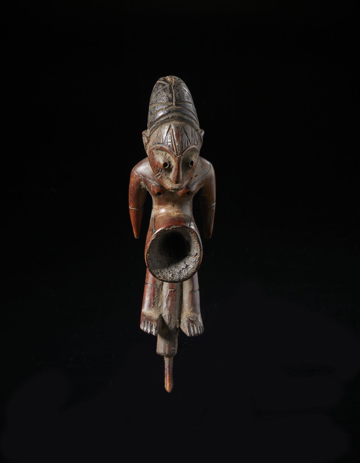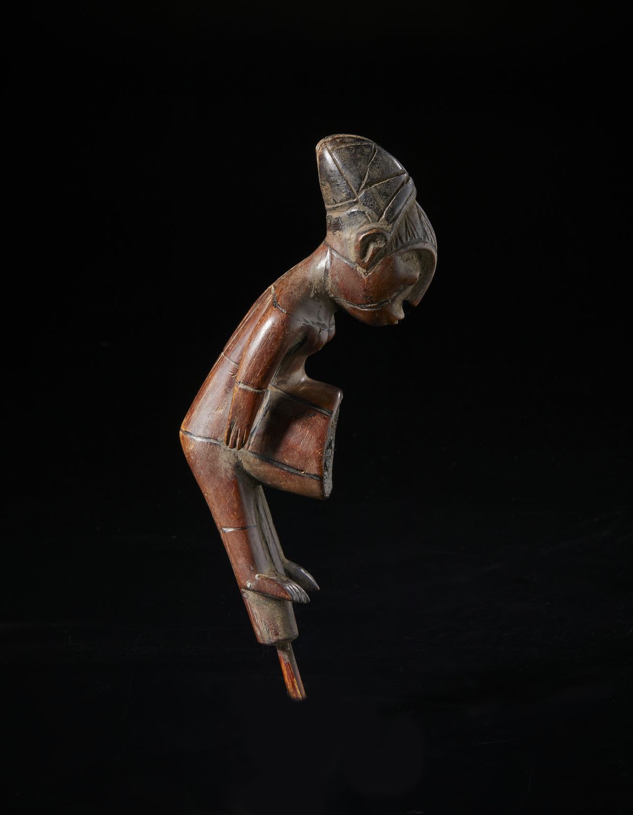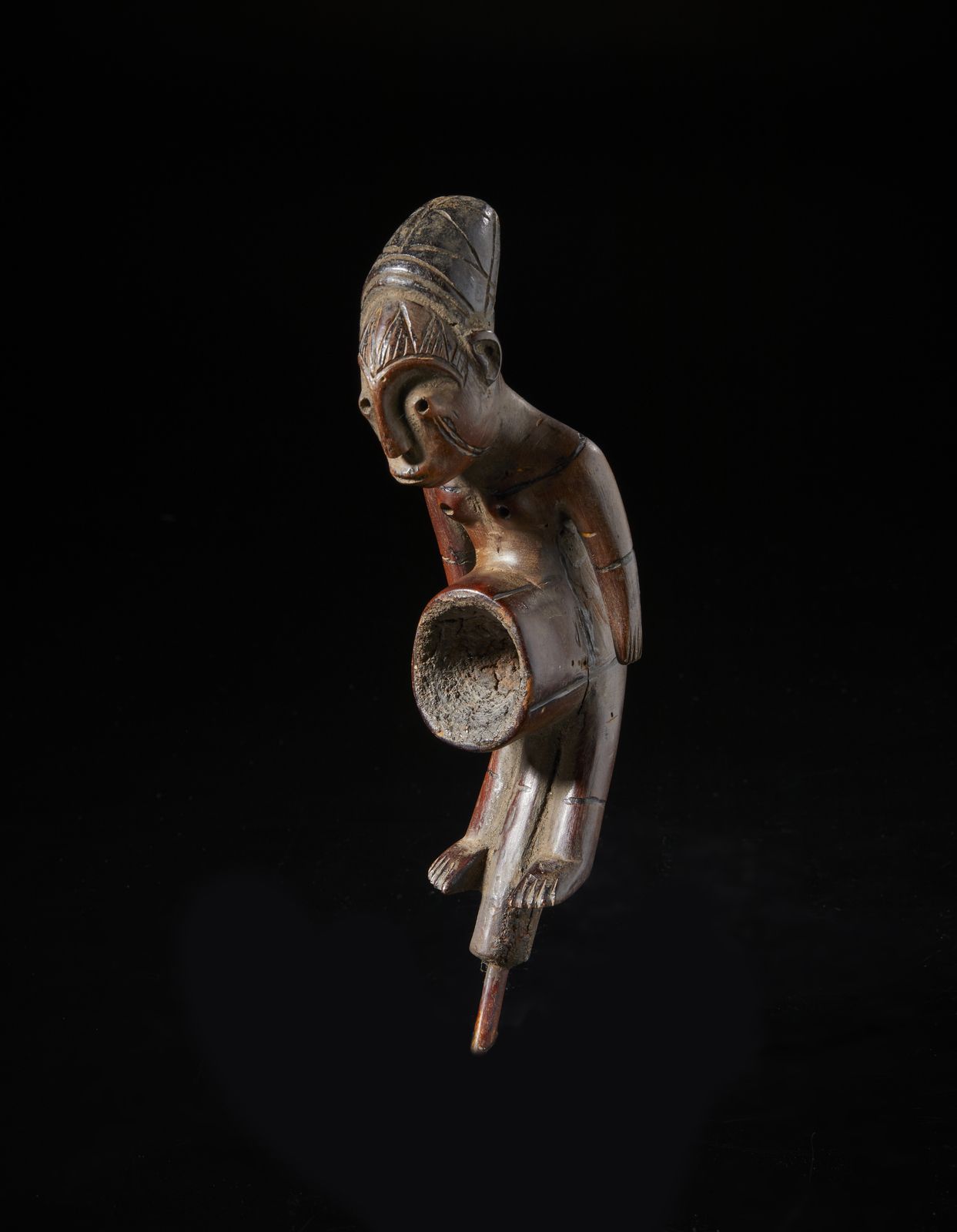 Braciere per pipa in forma antropomorfa. Legno duro a patina bruno rossastra e p [..]