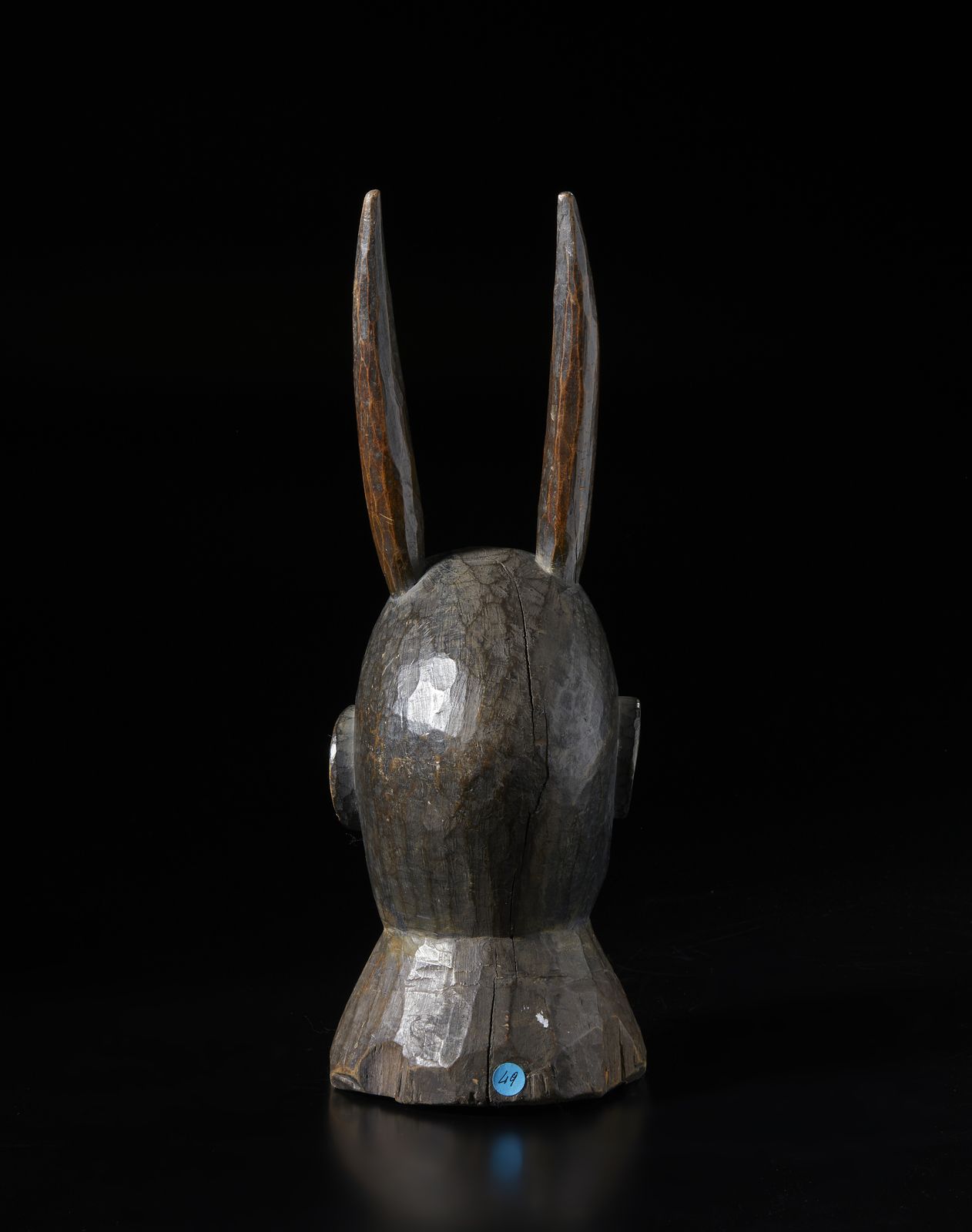Cimiero con testa antropozoomorfa.Legno duro a patina scura.