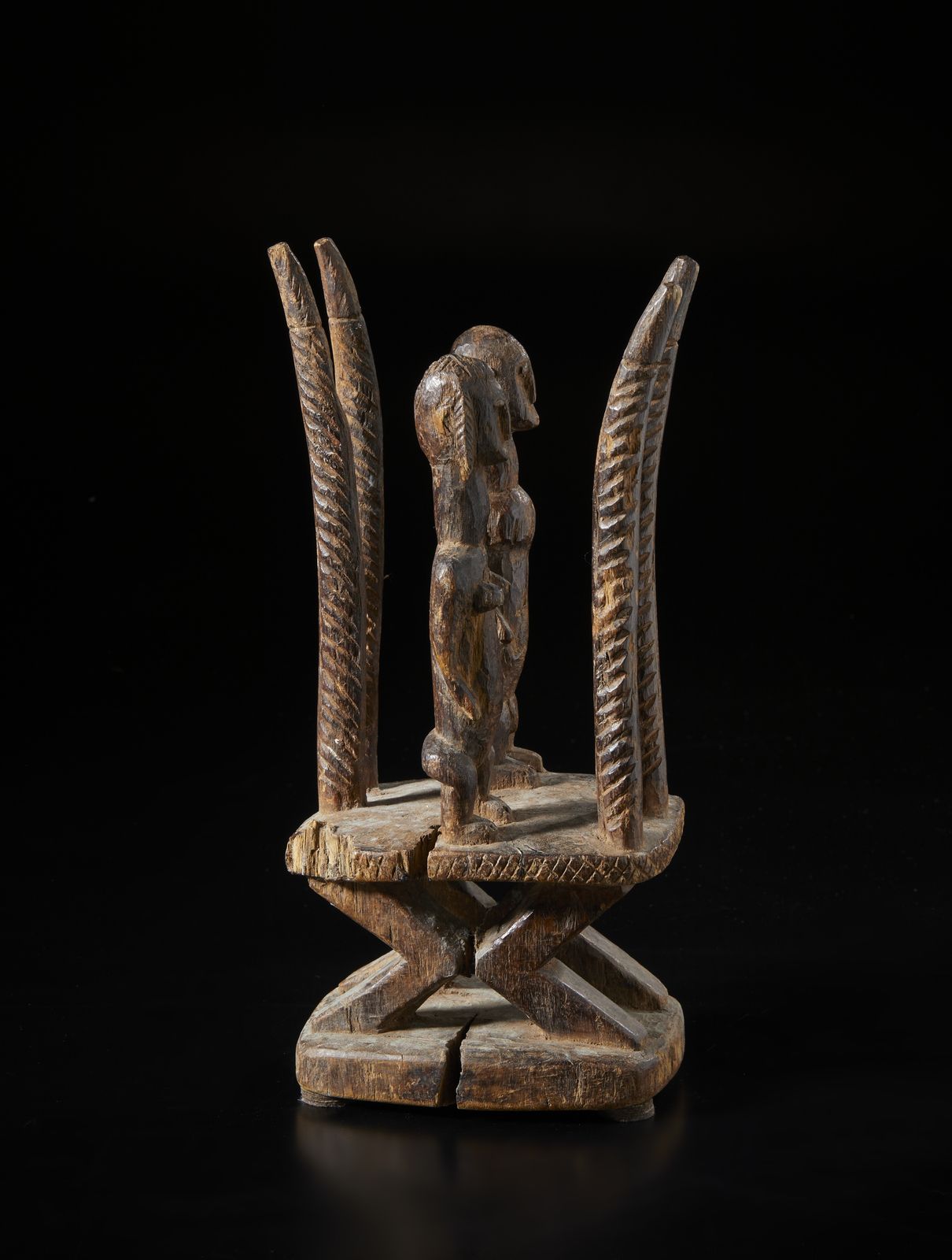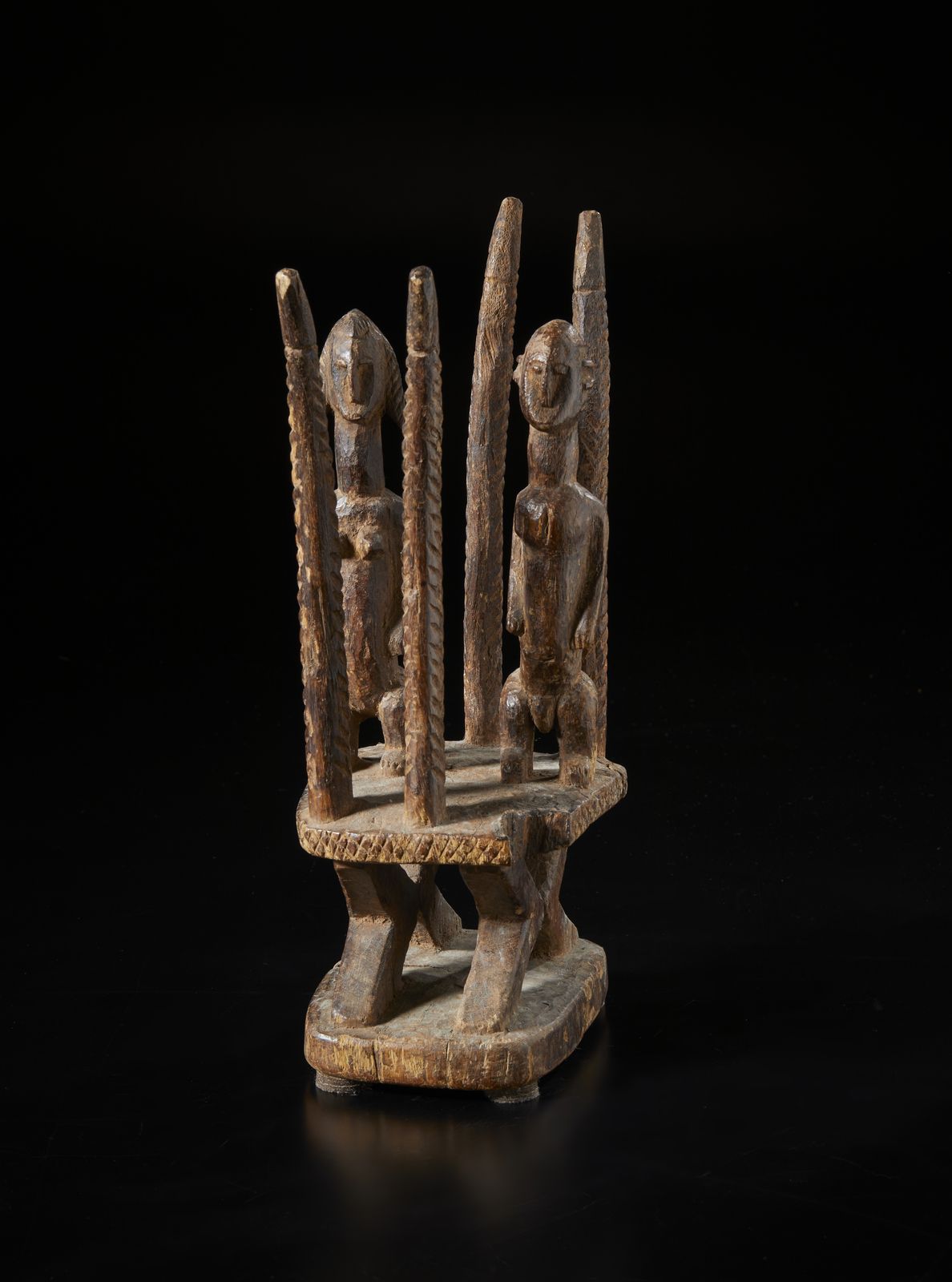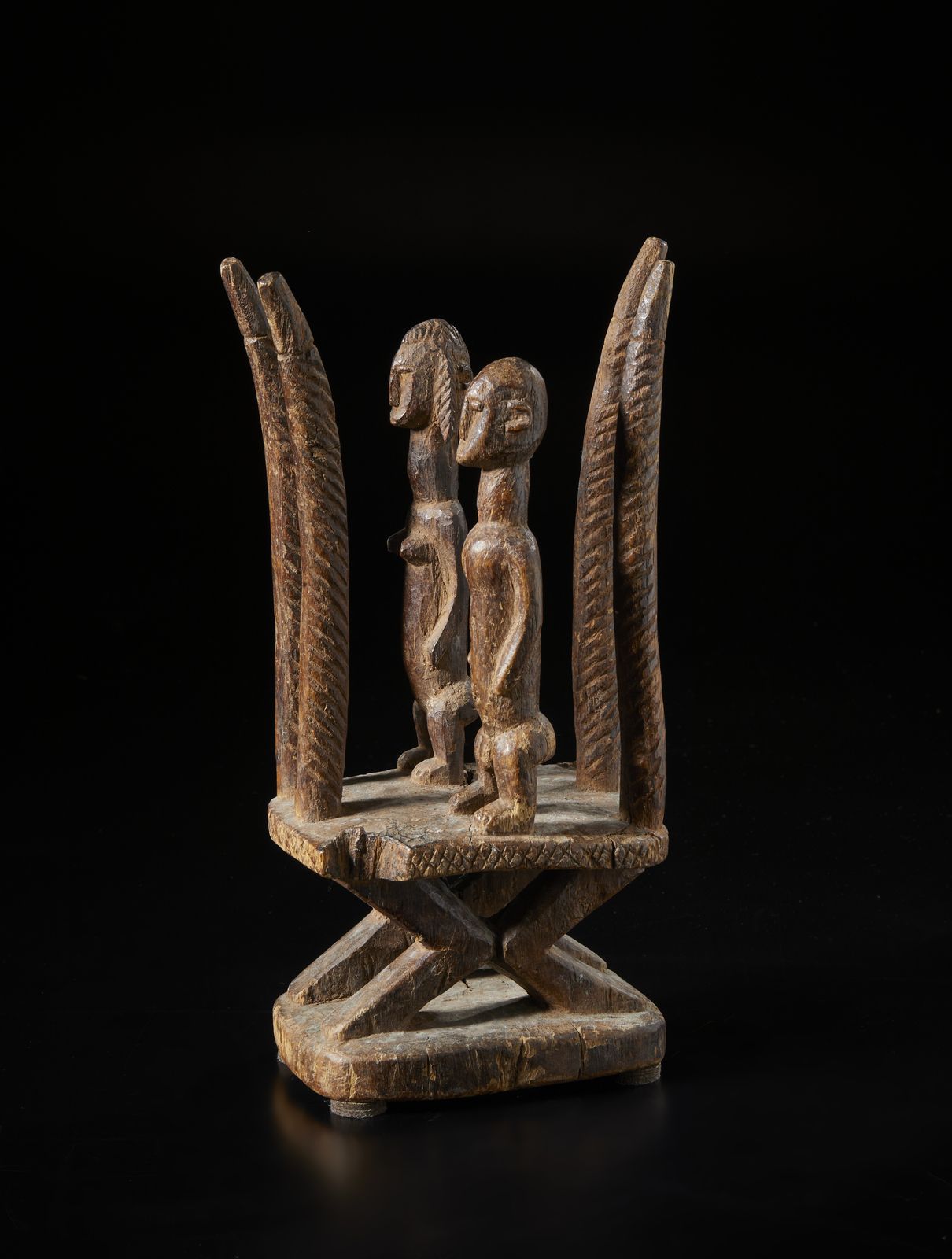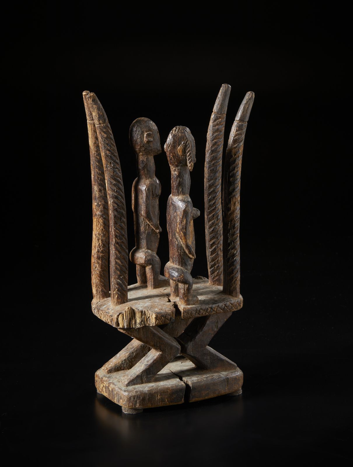 Cimiero in forma di altare o Cy Wara con due figure antropomorfe e quattro corna.Legno [..]