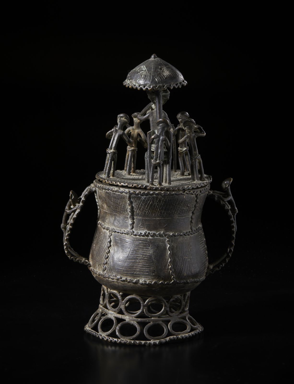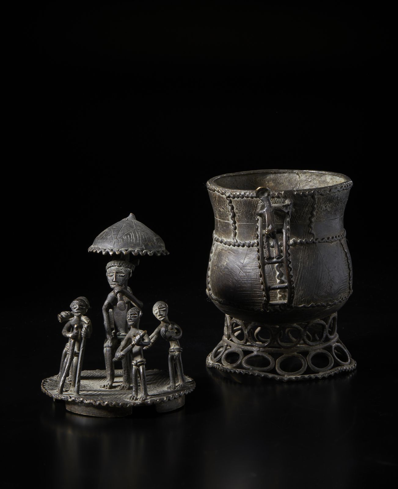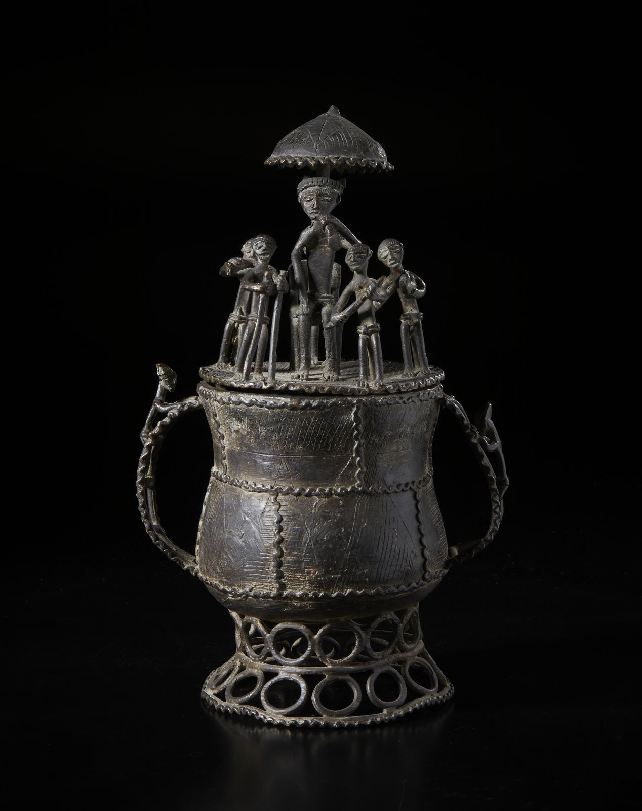 Contenitore con coperchio con diverse figure antropomorfe raffigurate sotto un ombrello.Lega [..]