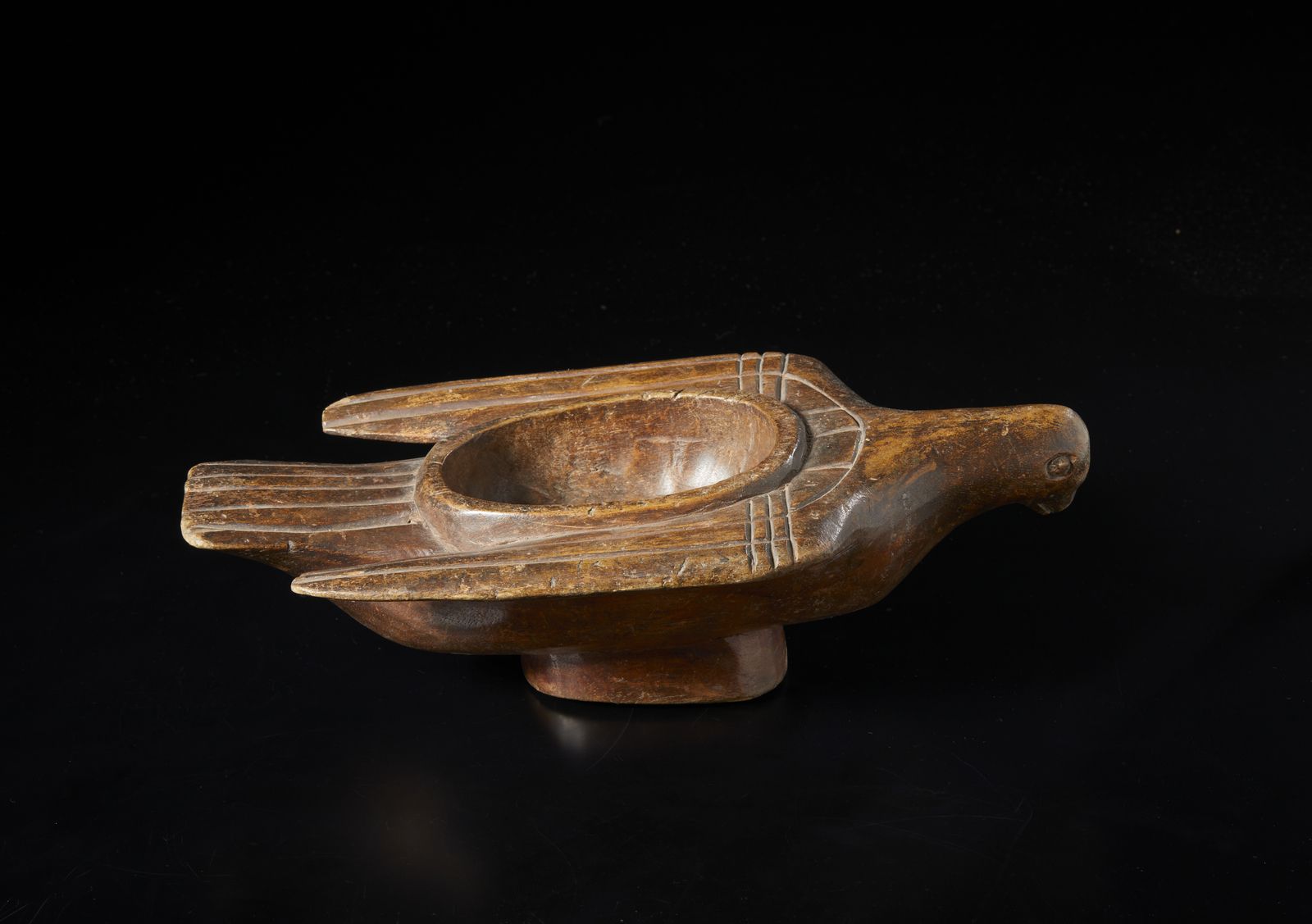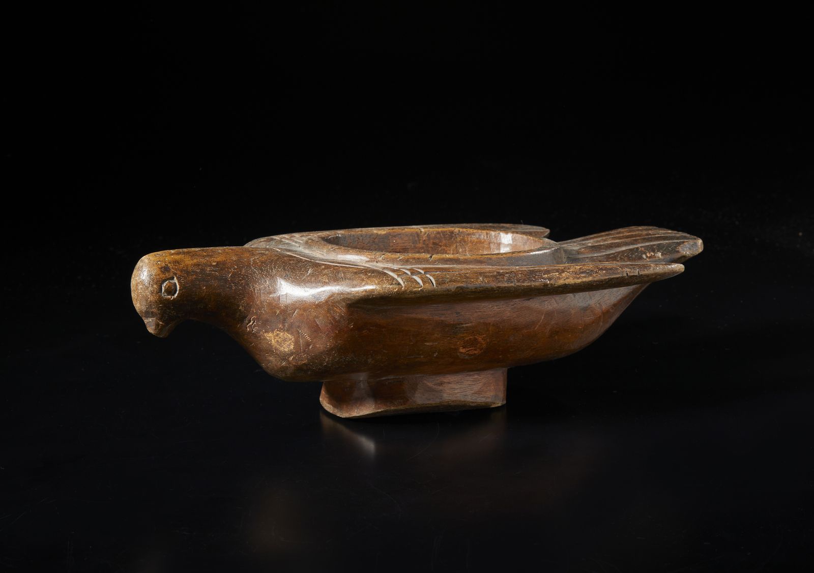 Contenitore zoomorfo in forma di uccello. Legno a patina marrone.
