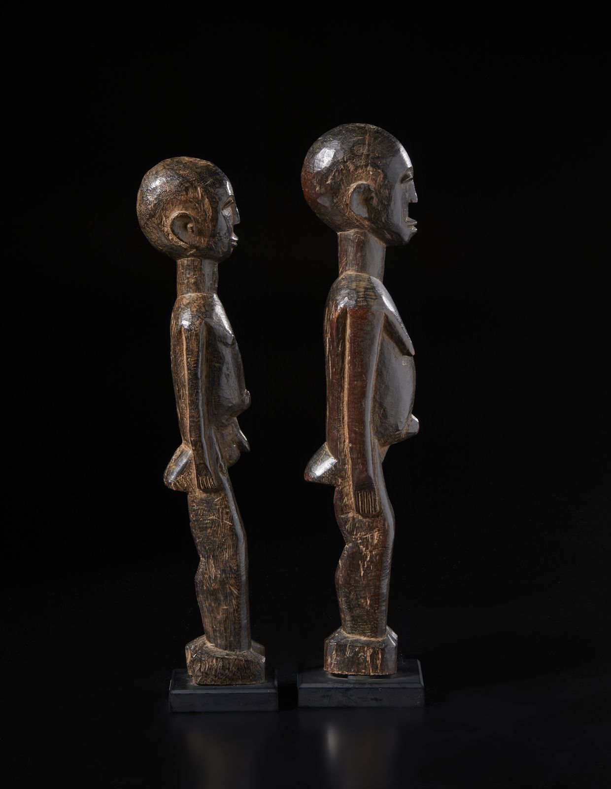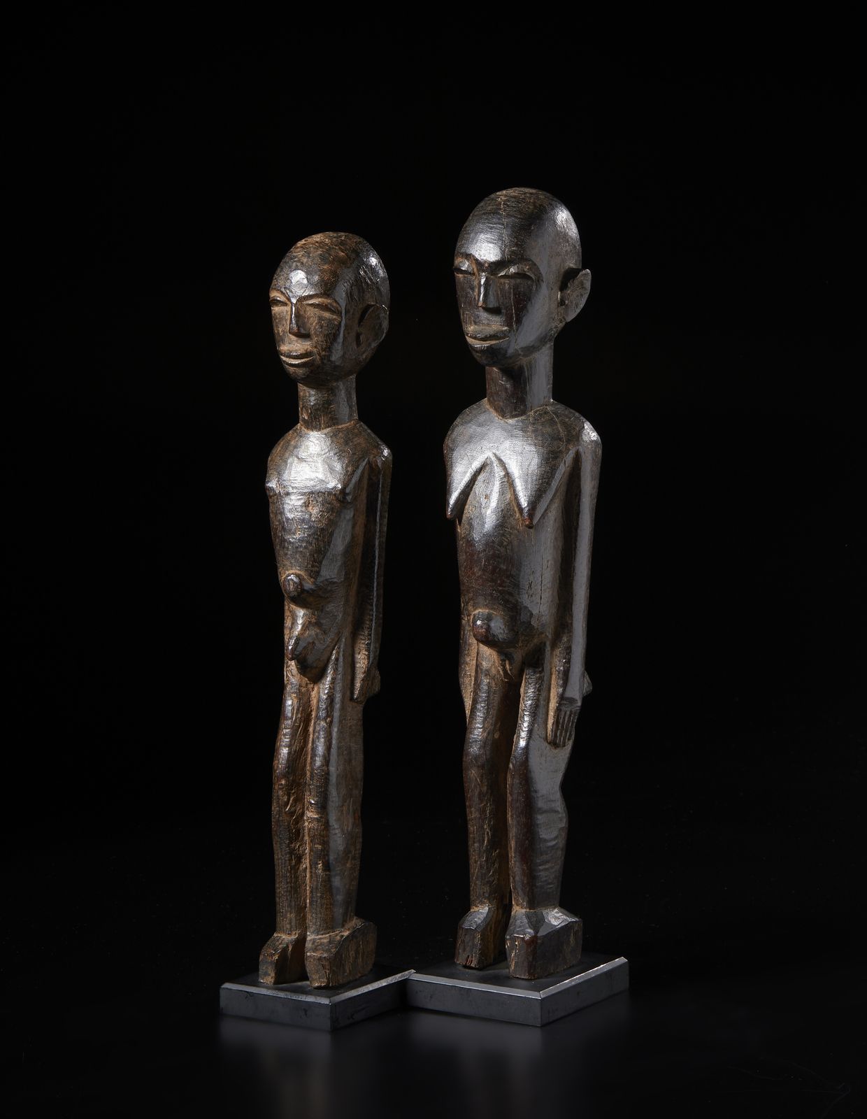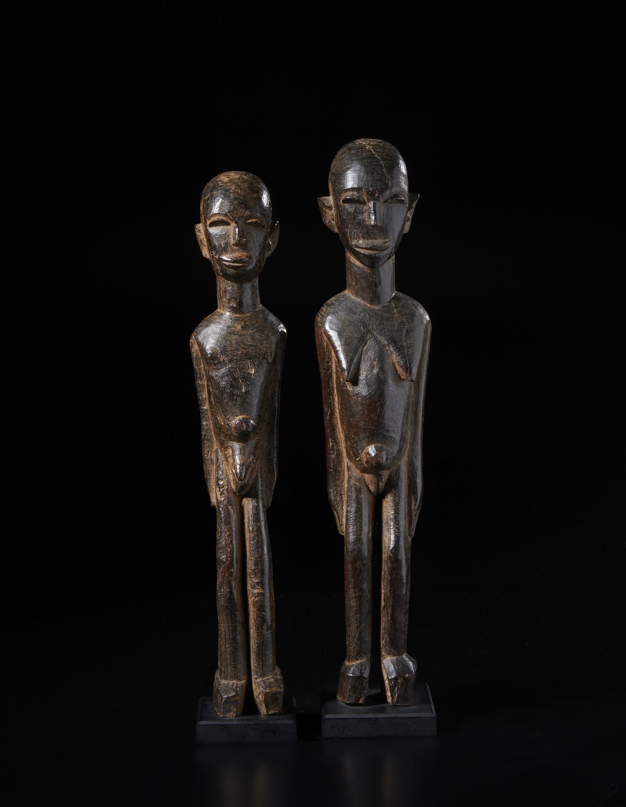 Coppia di sculture antropomorfe maschio e femmina.Legno duro a patina marrone.