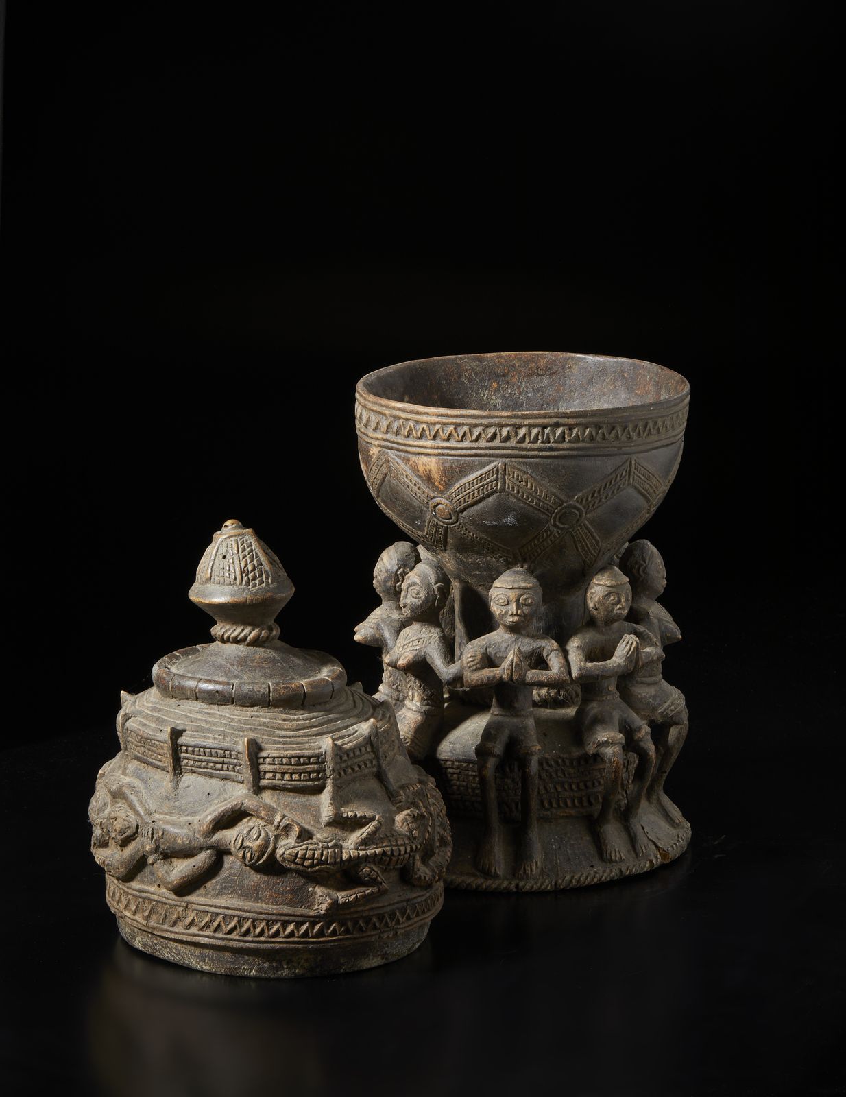 Grande coppa con coperchio. Legno a patina scura scolpito con figure antropomorfe, [..]