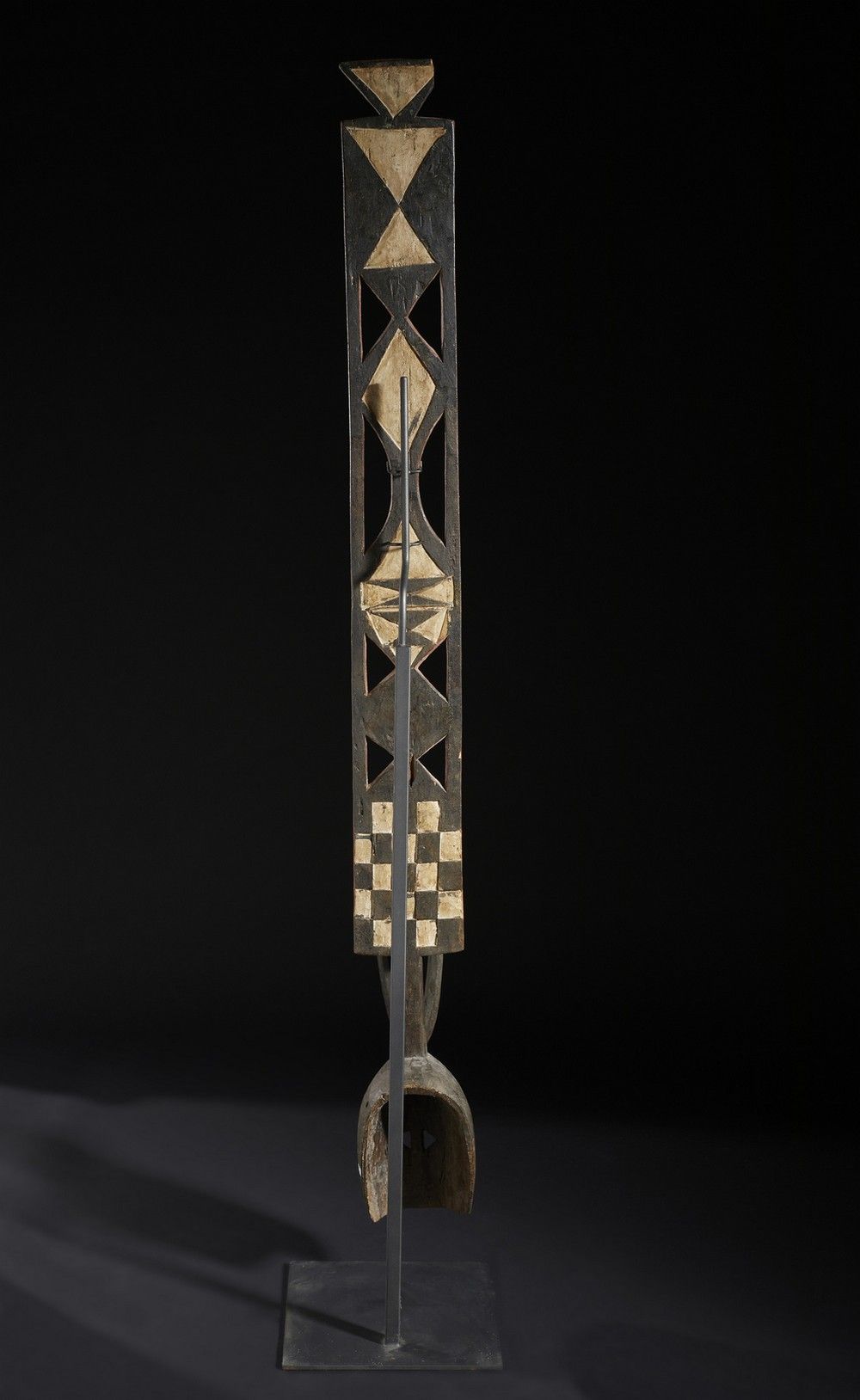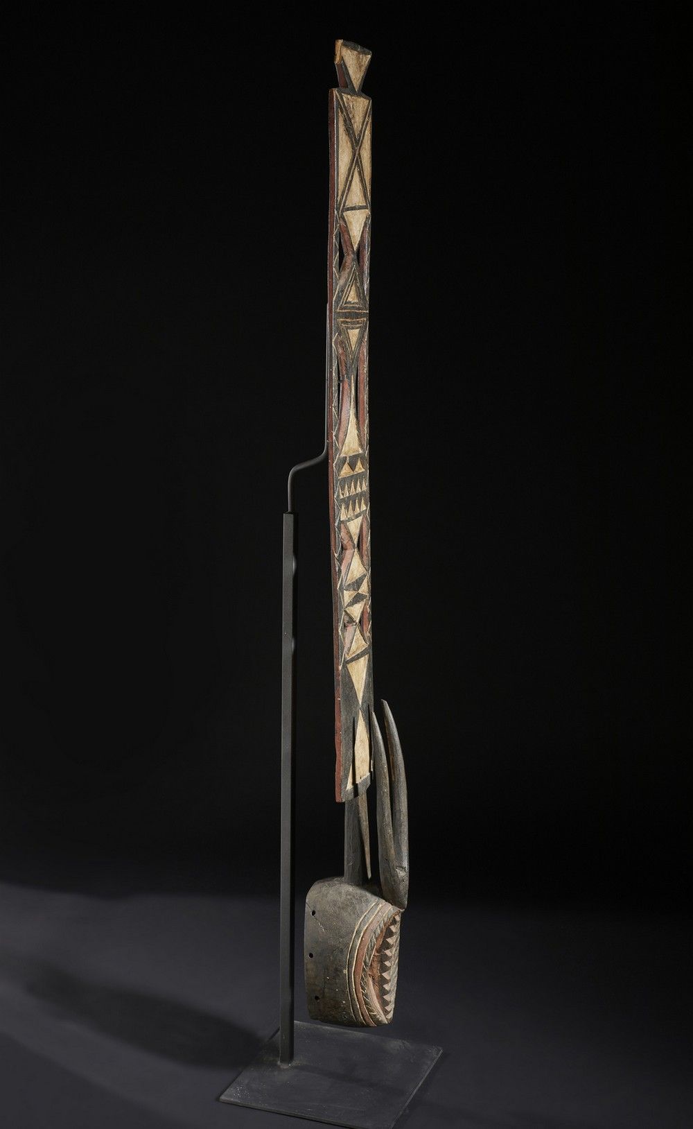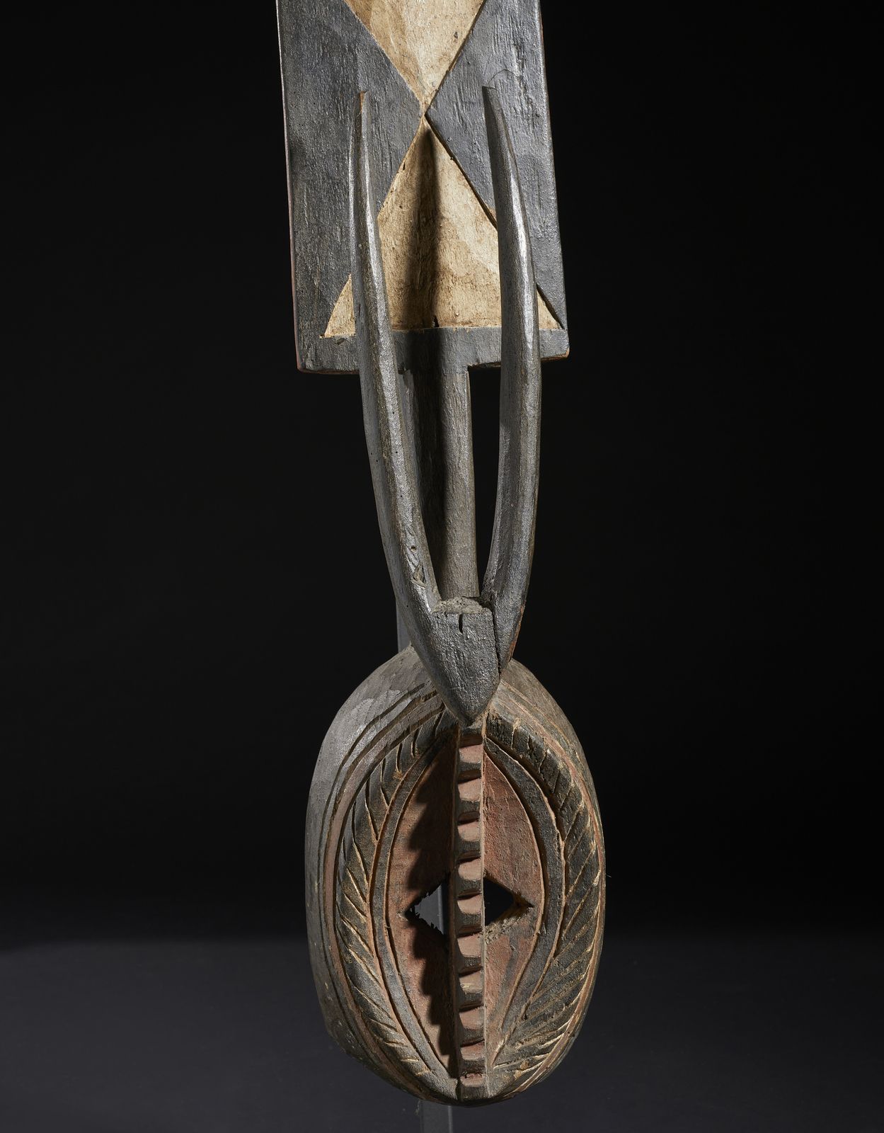 Grande maschera antropozoomorfa con cimiero decorato a motivi geometrici. Legno [..]